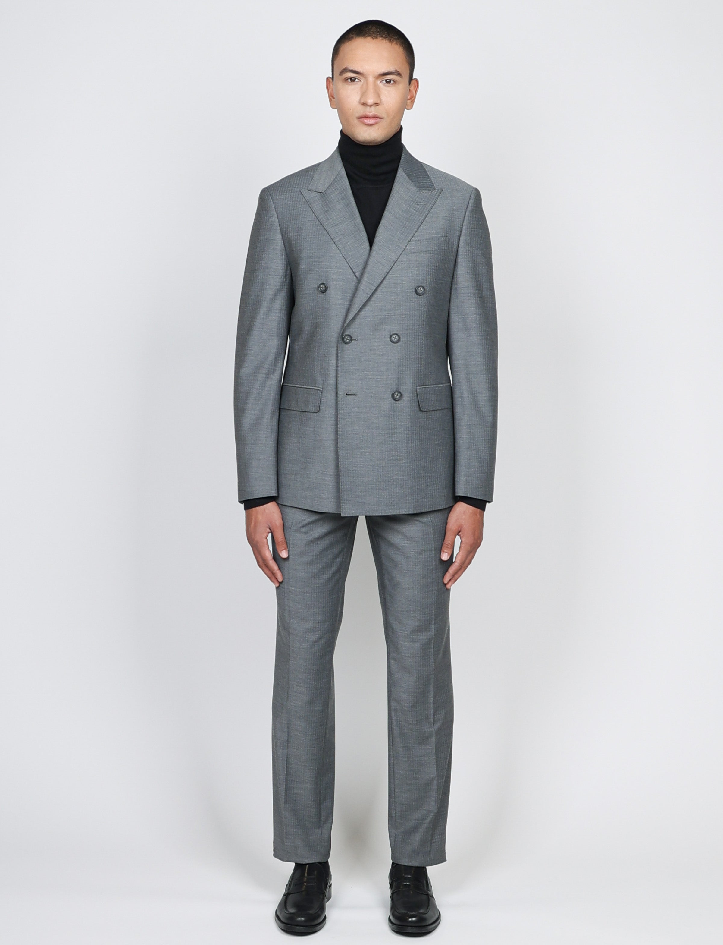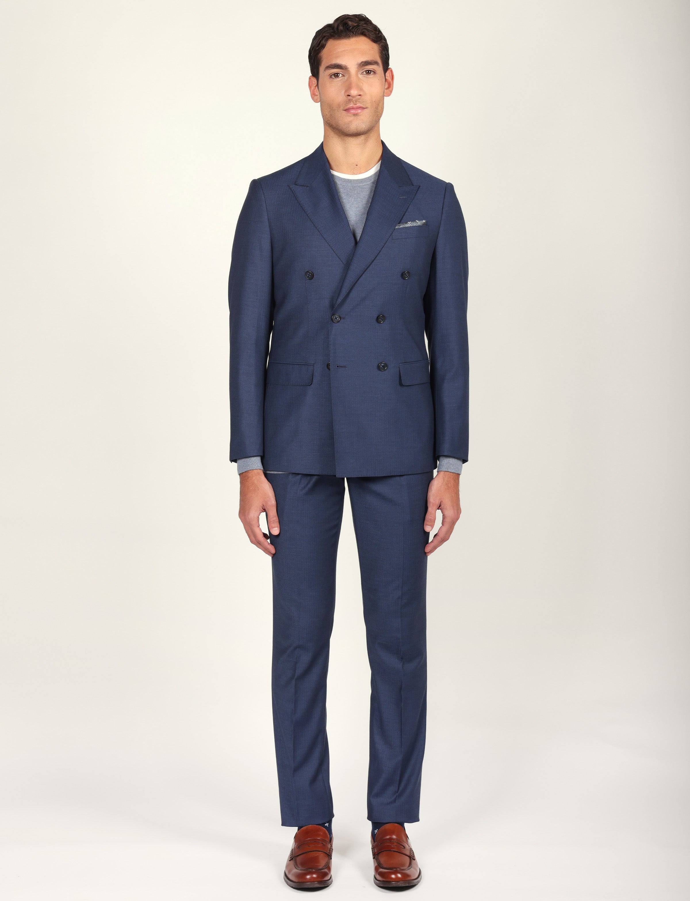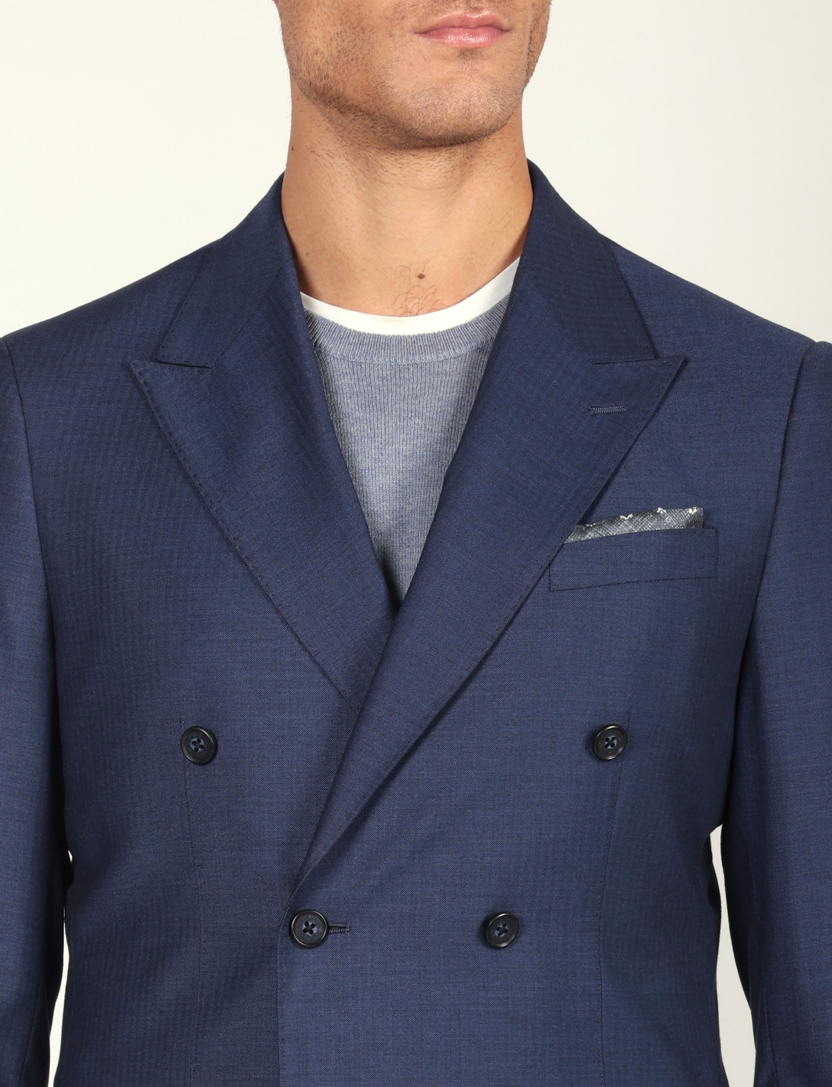 Abito doppiopetto uomo in tessuto spigato, dal taglio sartoriale e raffinato. Perfetto per occasioni formali o look business contemporanei.
