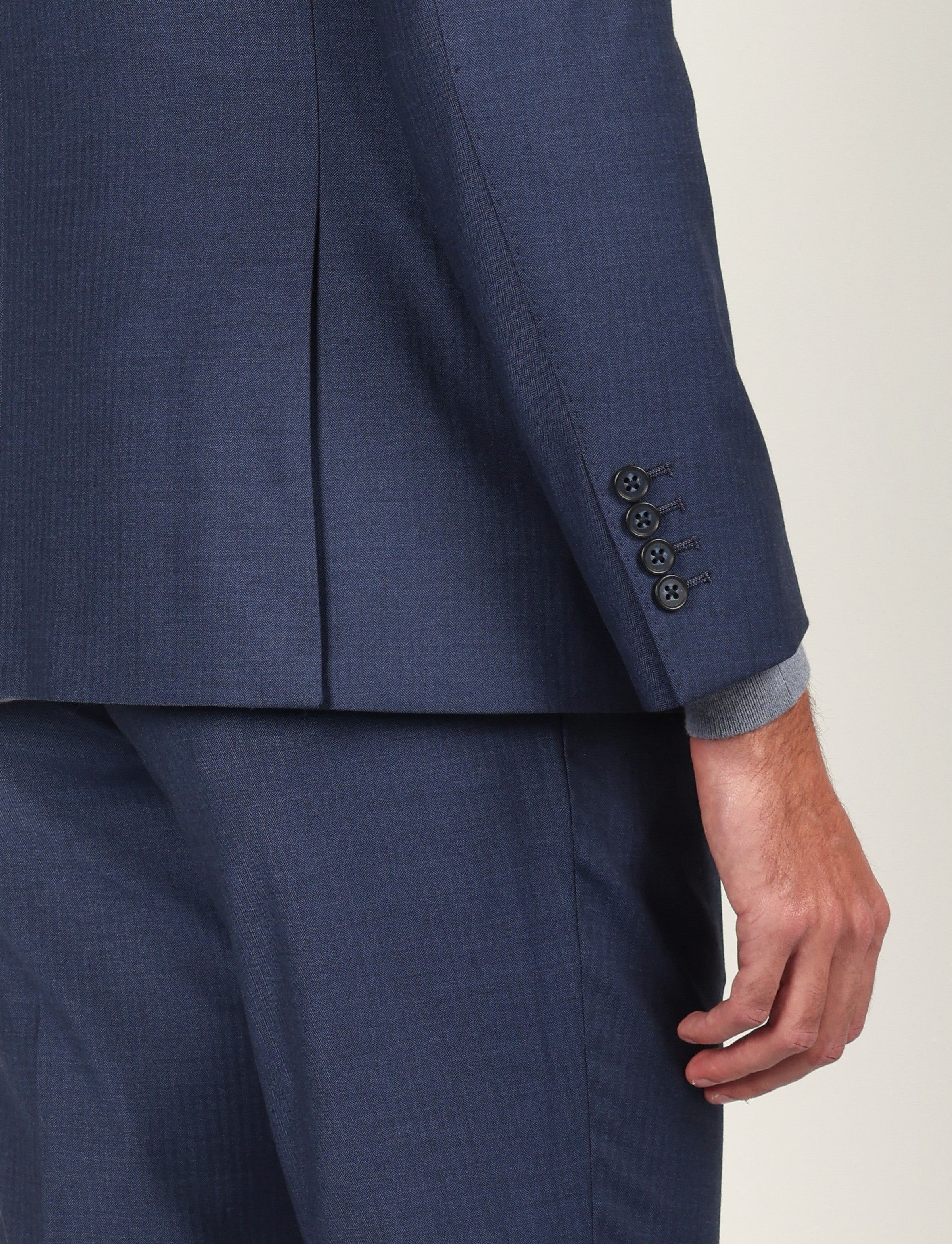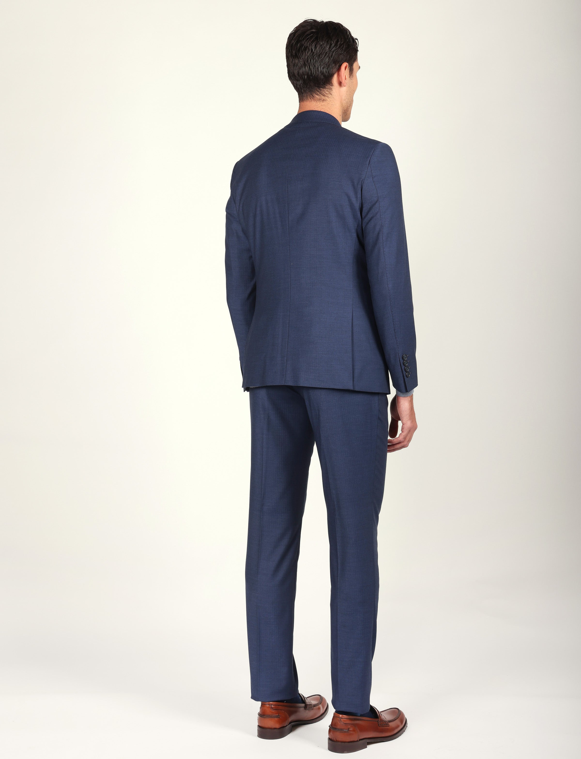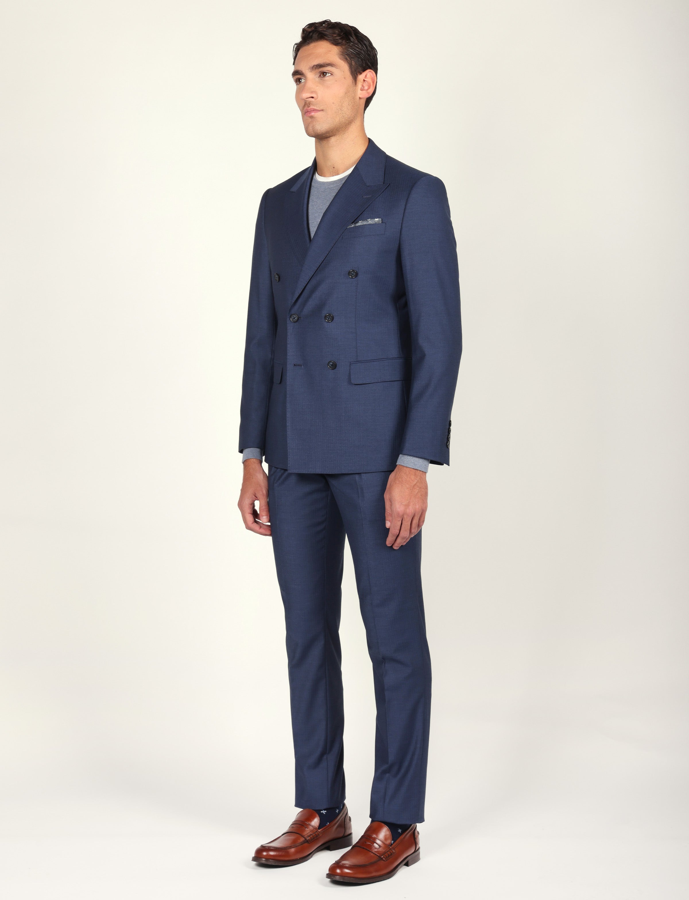 Vestibilità: Drop 6, taglio leggermente aderente con giacca sagomata e pantalone regolare, ideale per fisicità proporzionate.