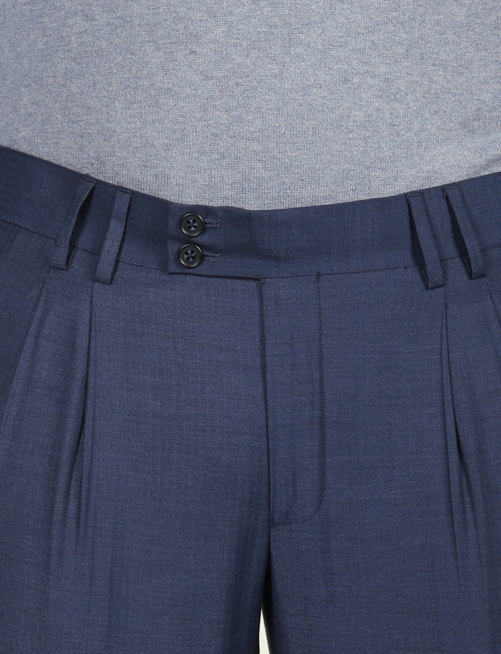 Camicia classica bianca o azzurra: un contrasto pulito che valorizza il tono del tessuto spigato, ideale per contesti formali o business.