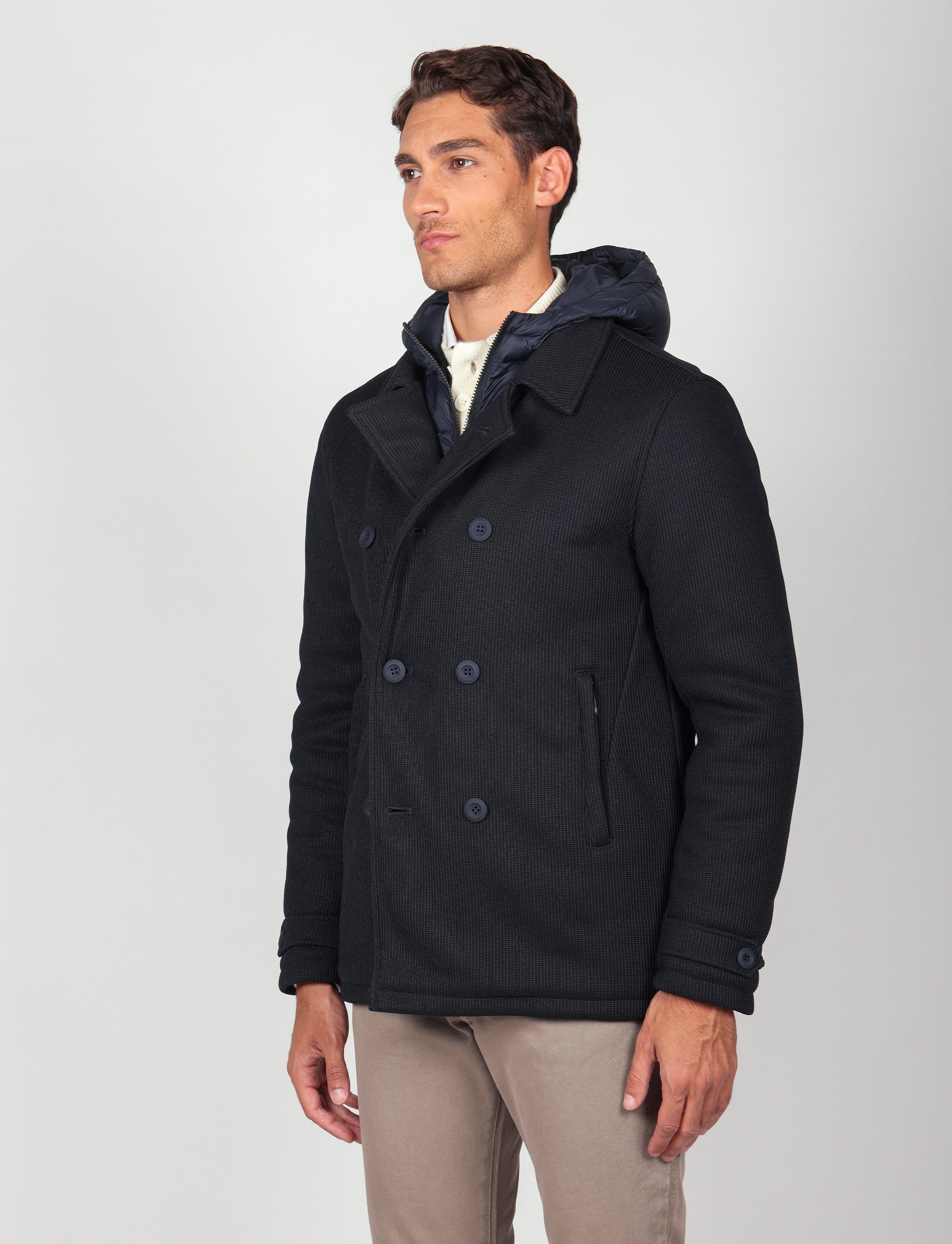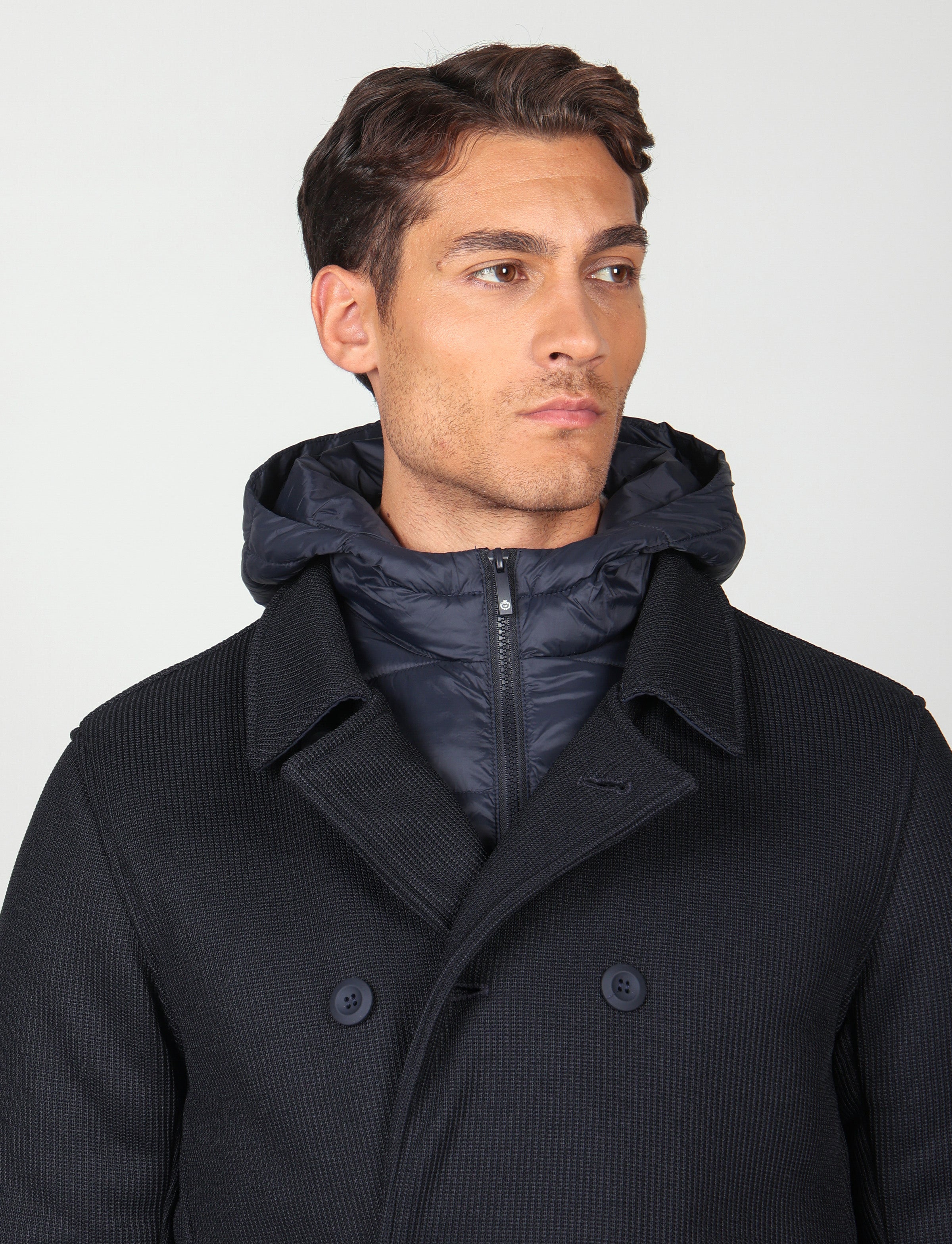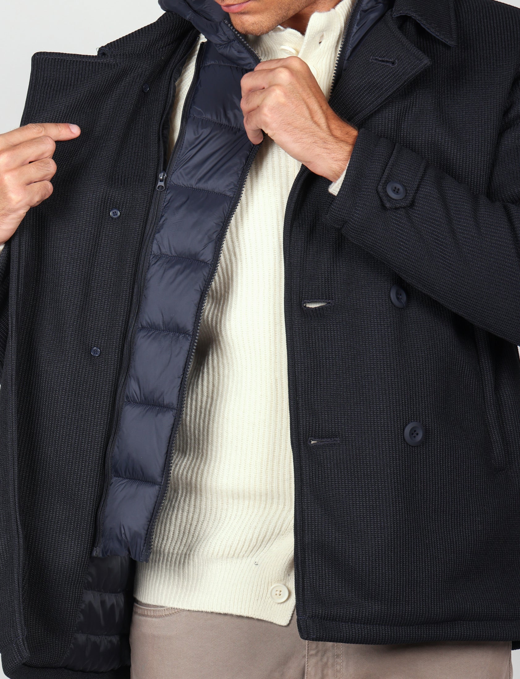 Modello doppiopetto in maglia imbottita dal design contemporaneo