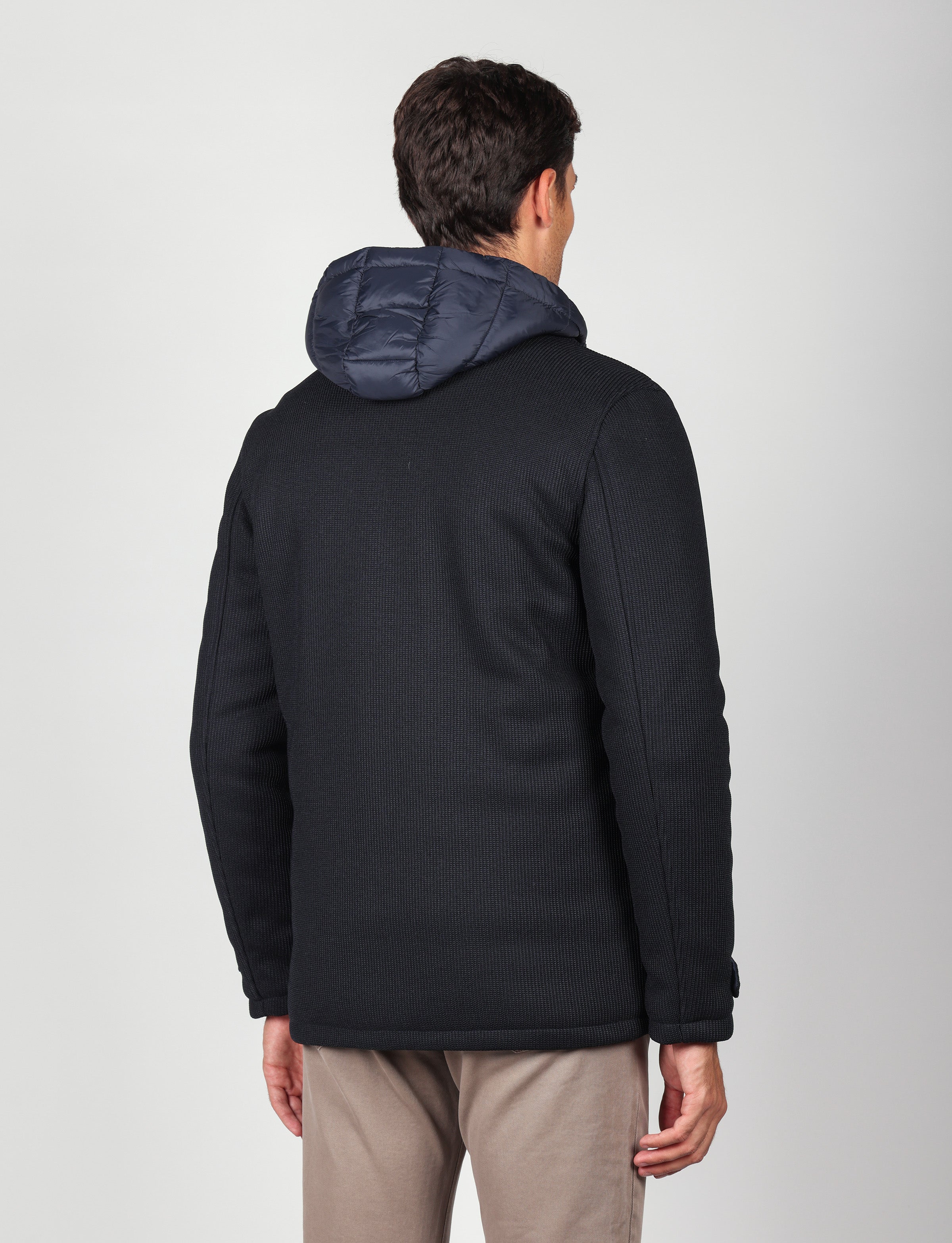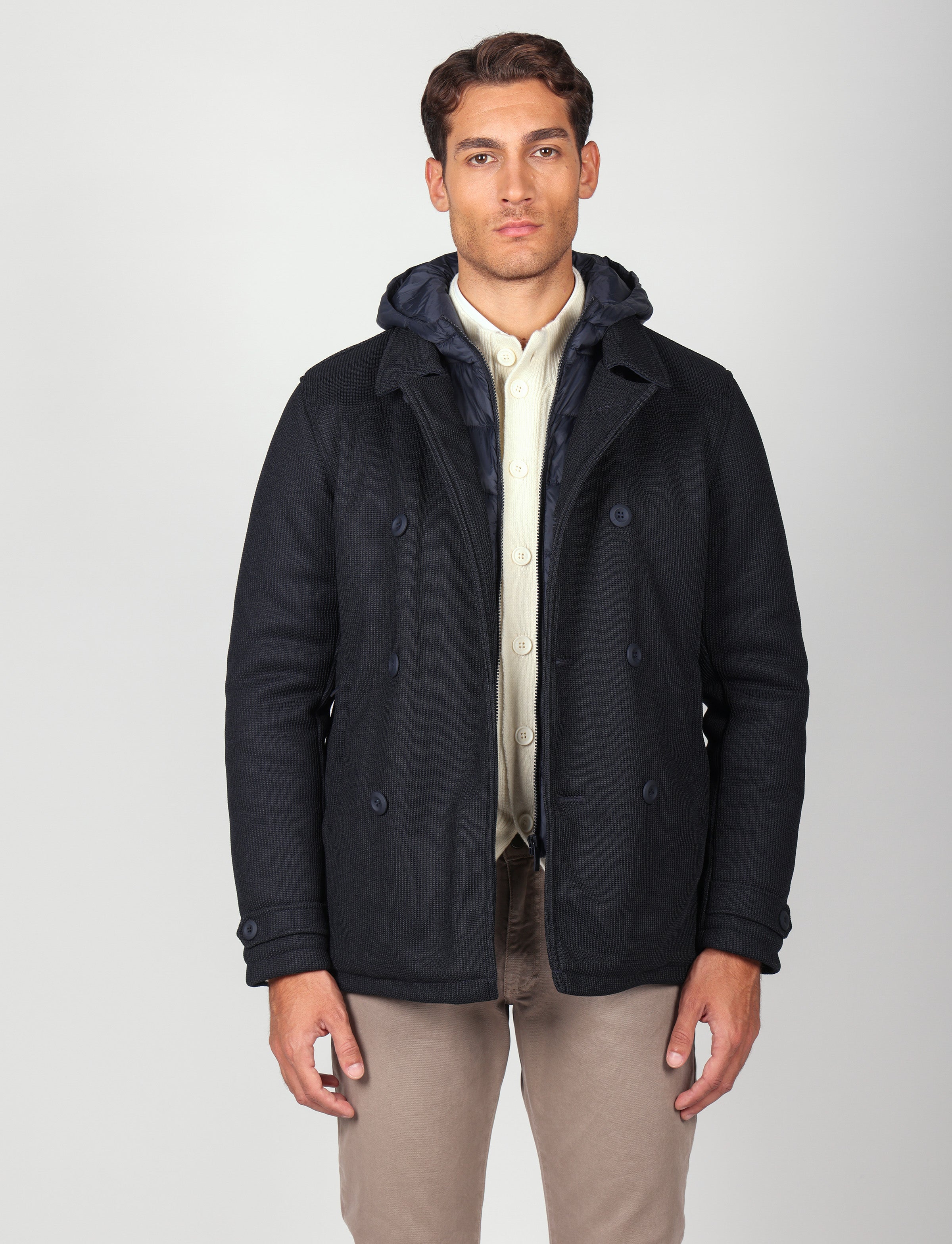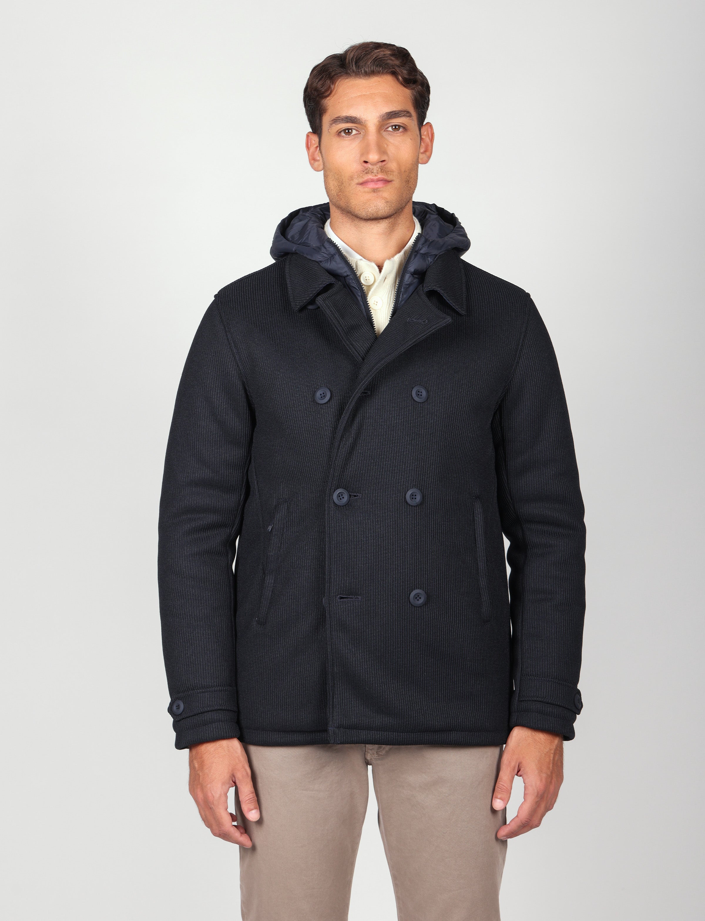 Modello doppiopetto in maglia imbottita dal design contemporaneo