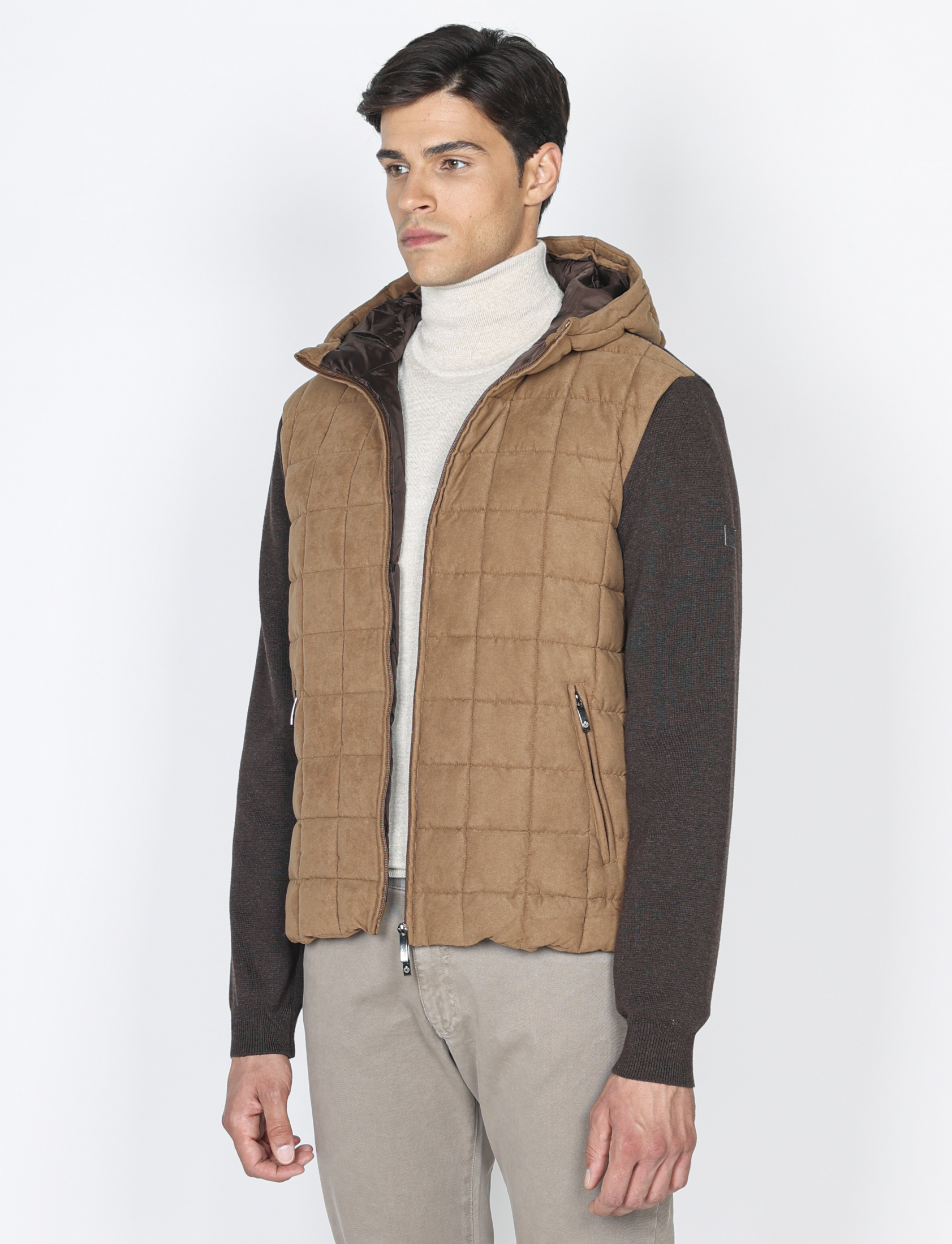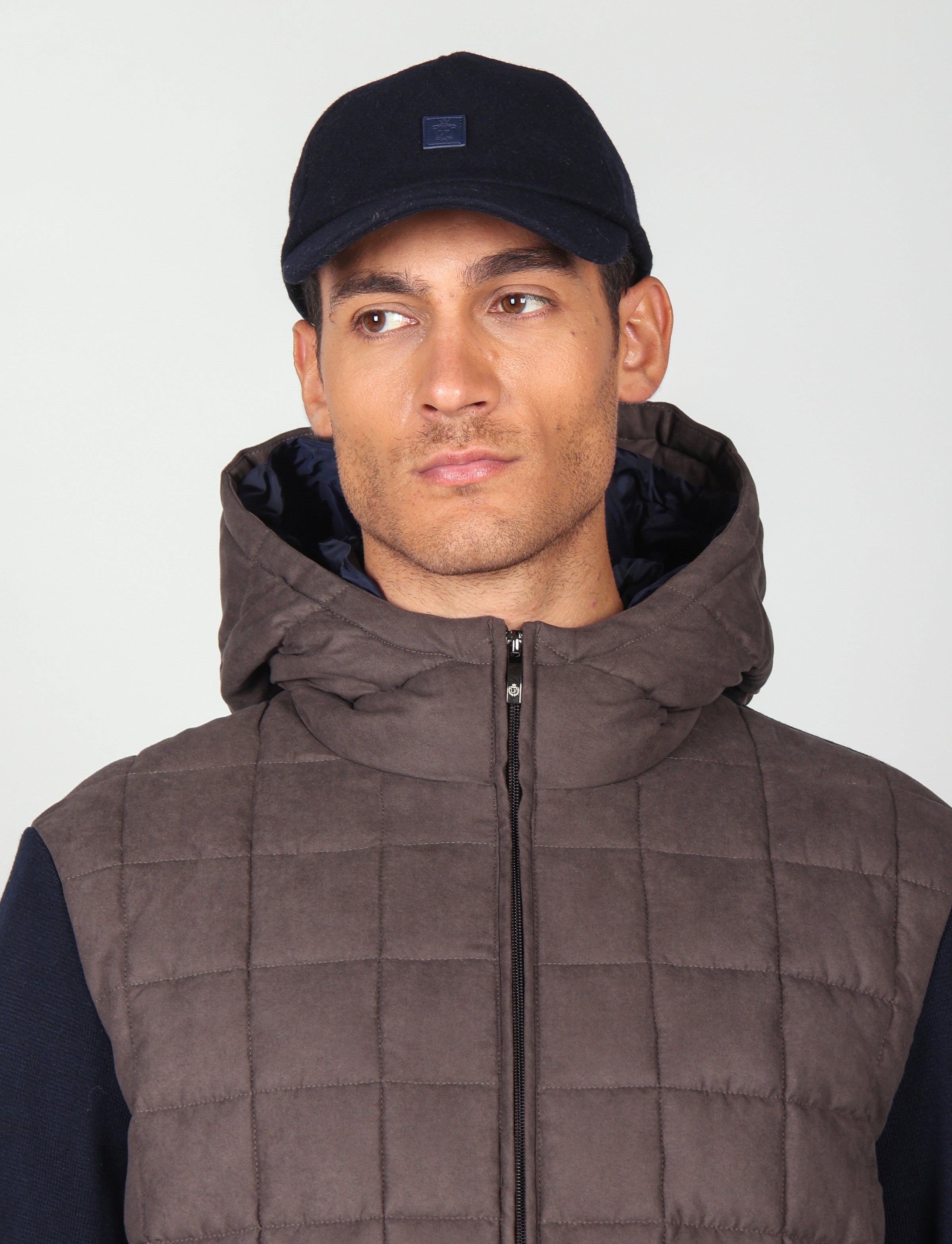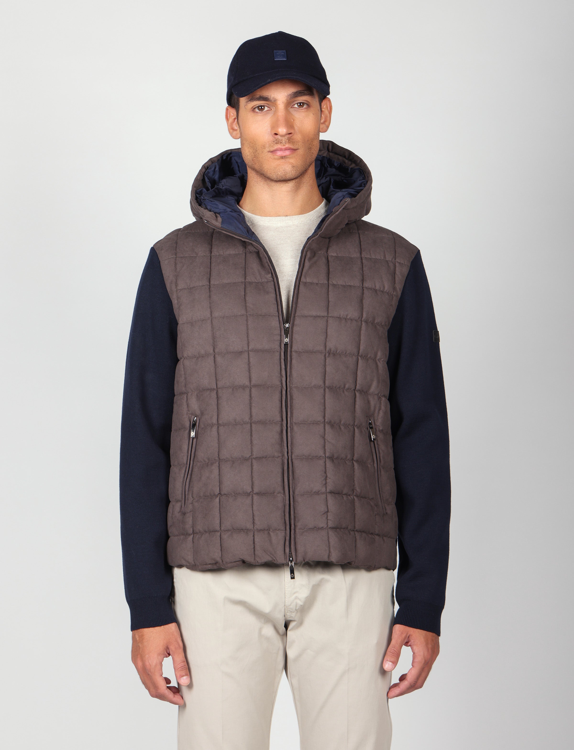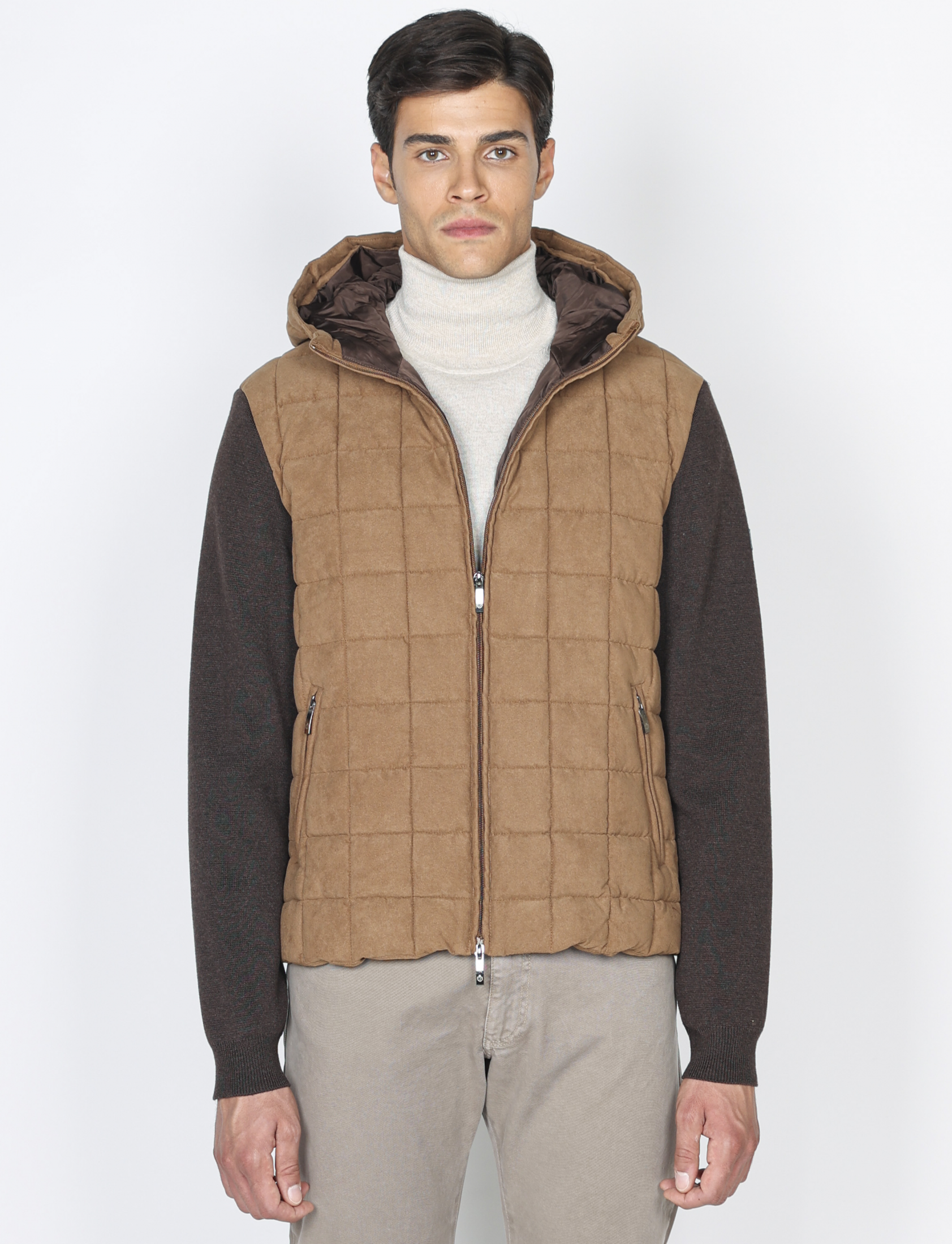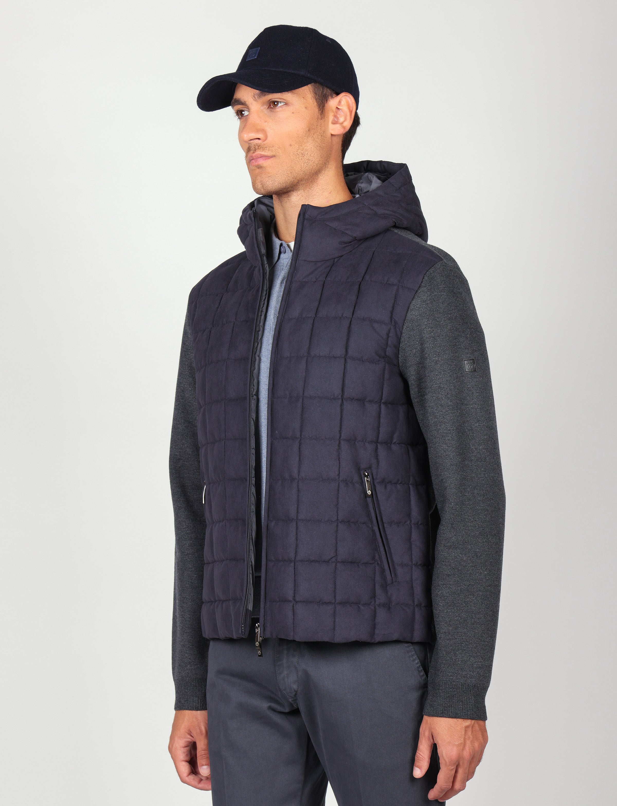 Maglia giubbino con frontale in alcantara trapuntata e retro in tessuto, pensata per unire eleganza e praticità. Perfetta per la mezza stagione, offre uno stile moderno e versatile.
