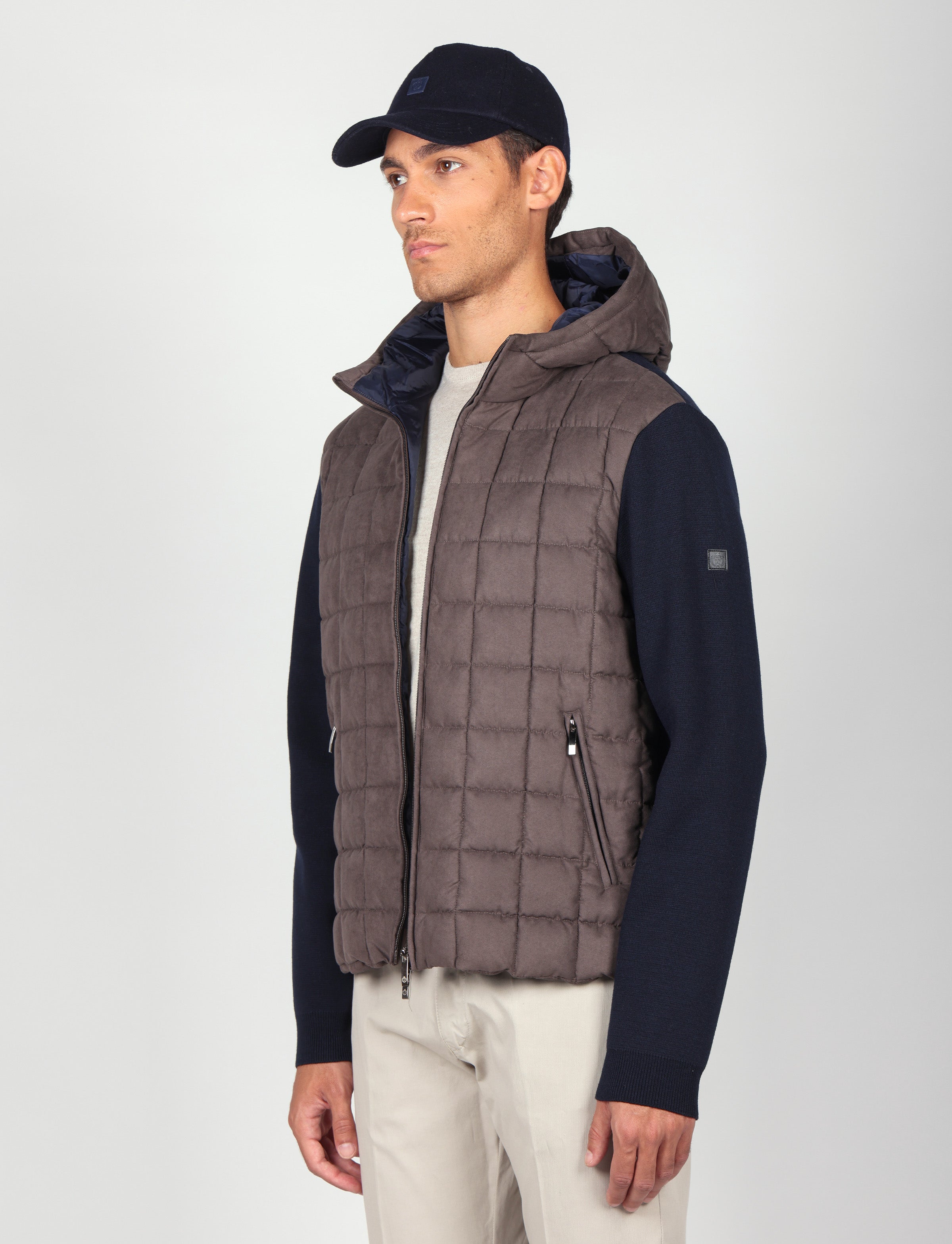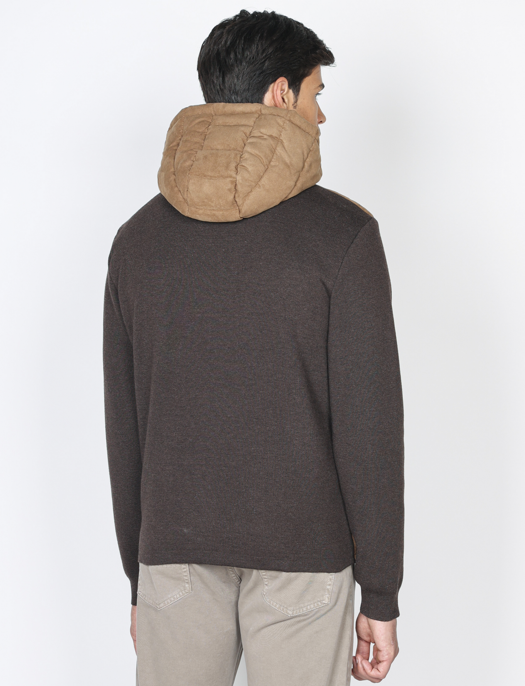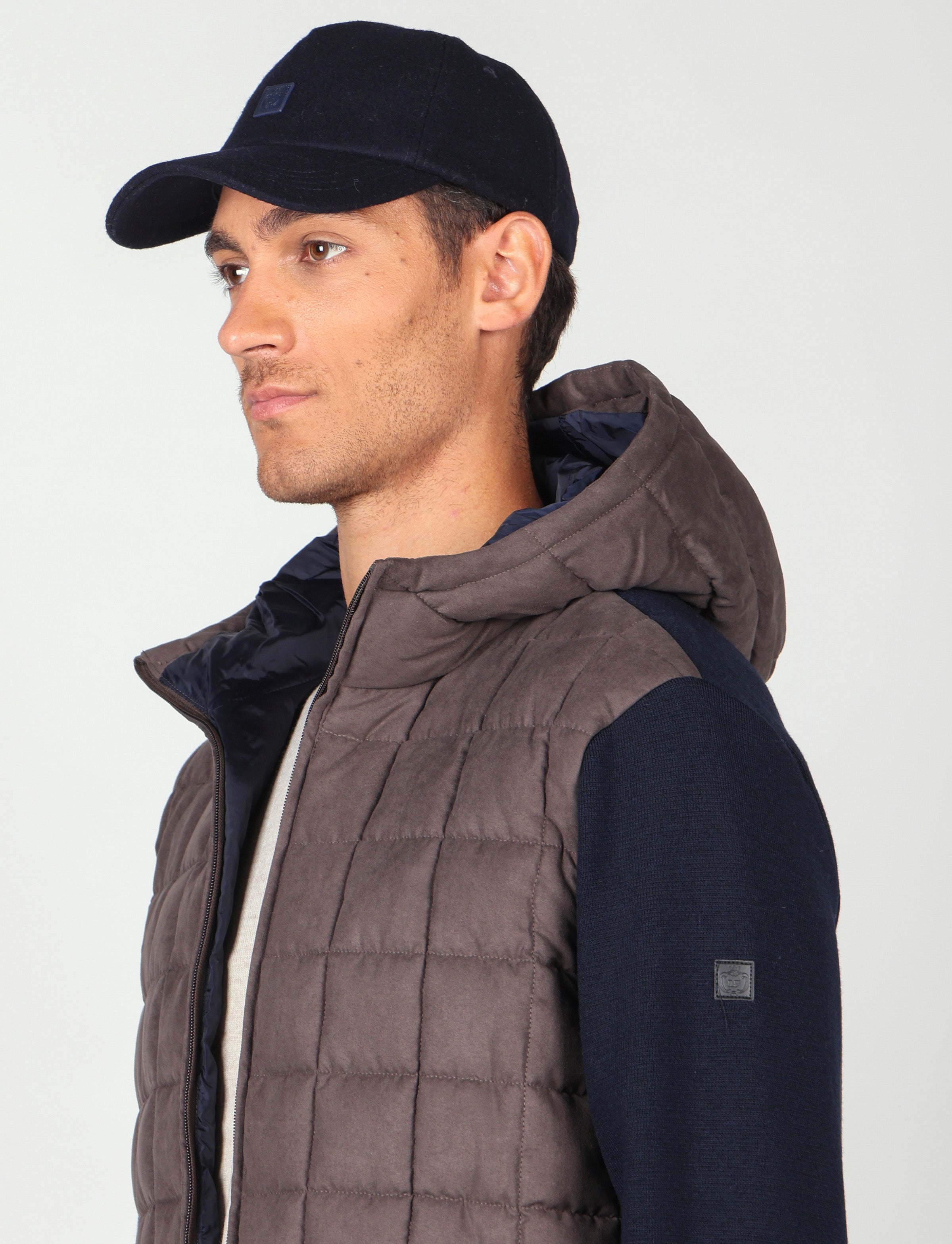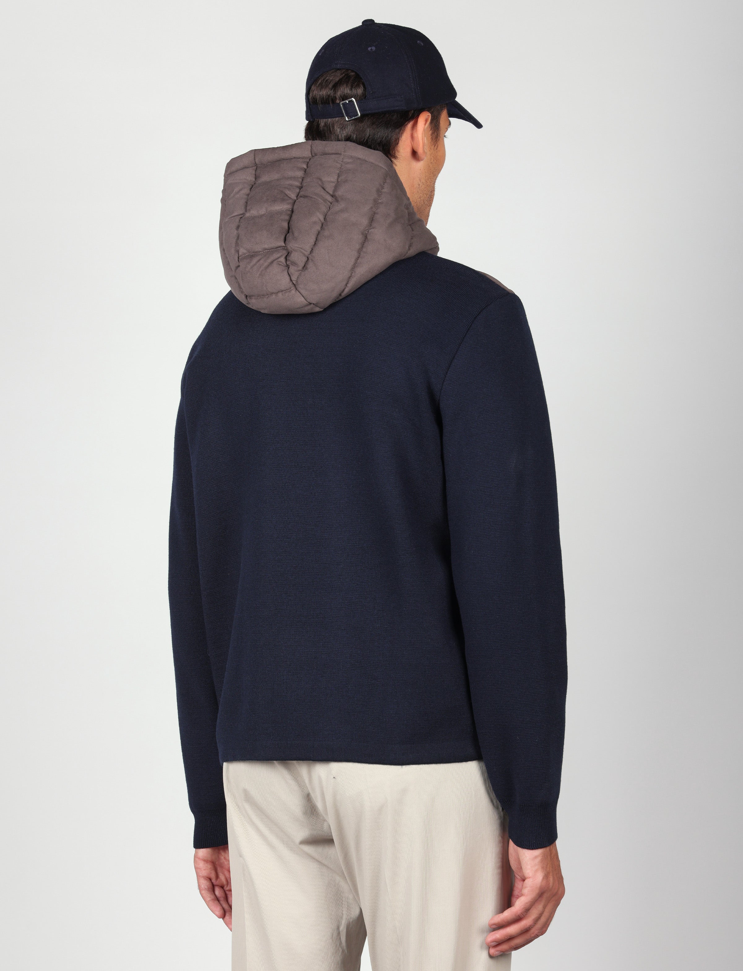 Maglia giubbino con frontale in alcantara trapuntata e retro in tessuto, pensata per unire eleganza e praticità. Perfetta per la mezza stagione, offre uno stile moderno e versatile.