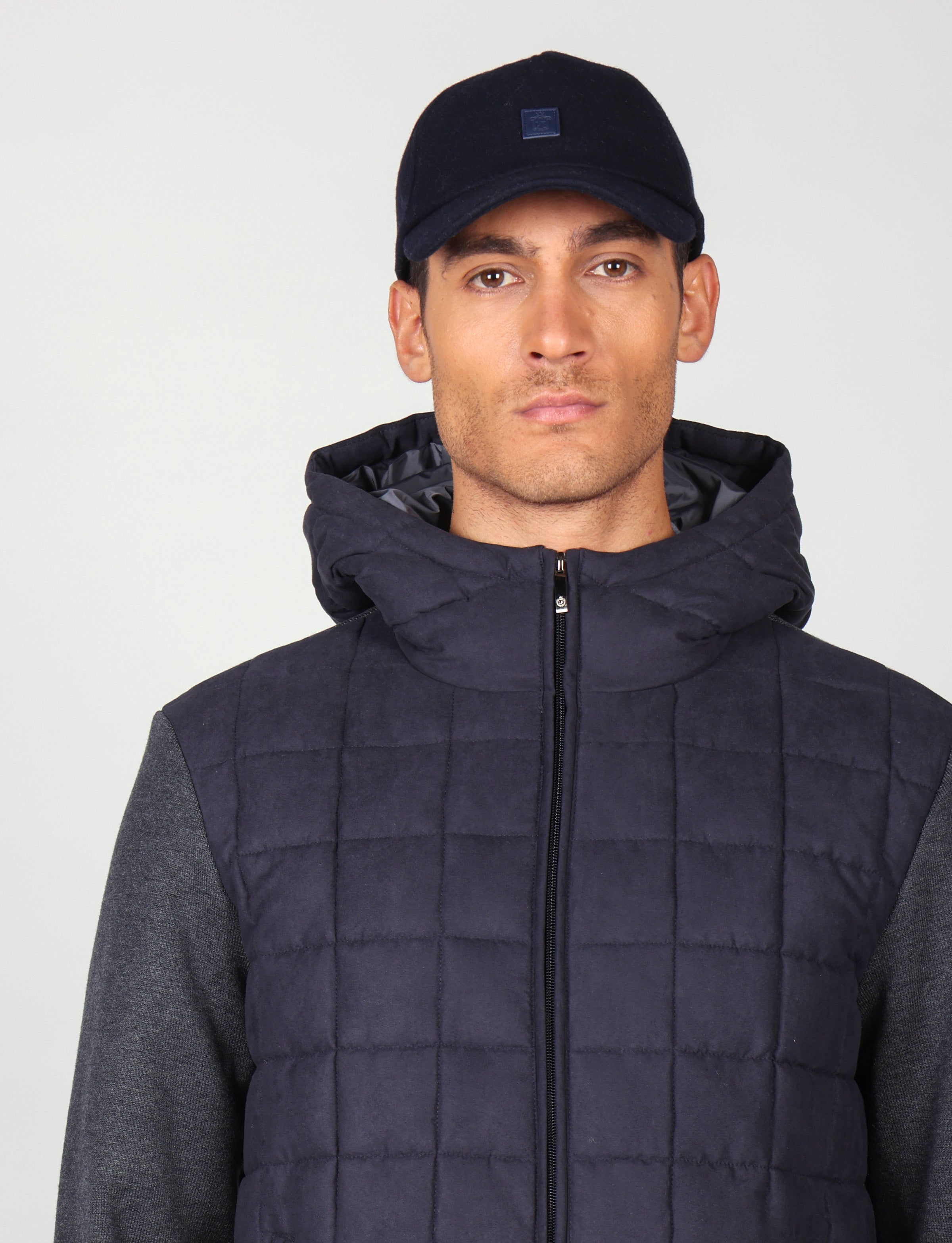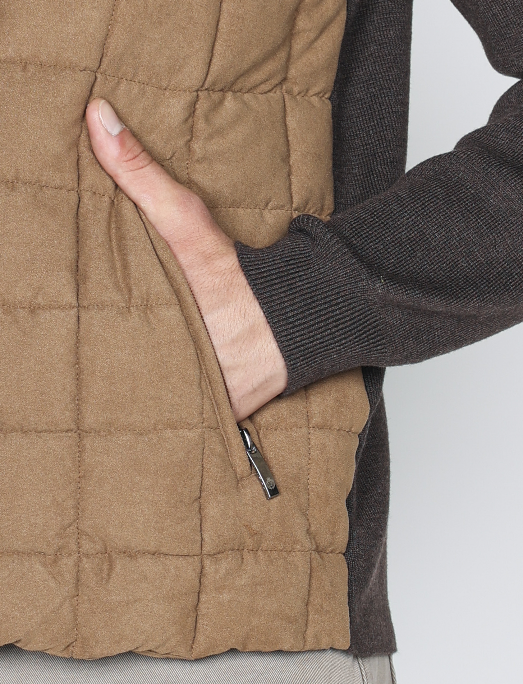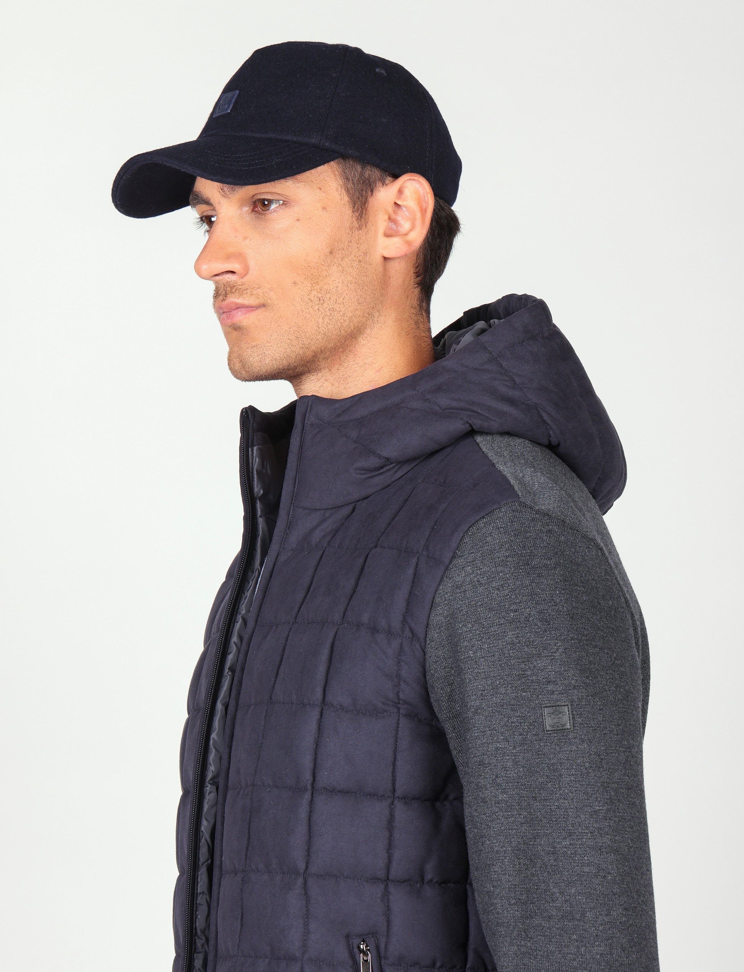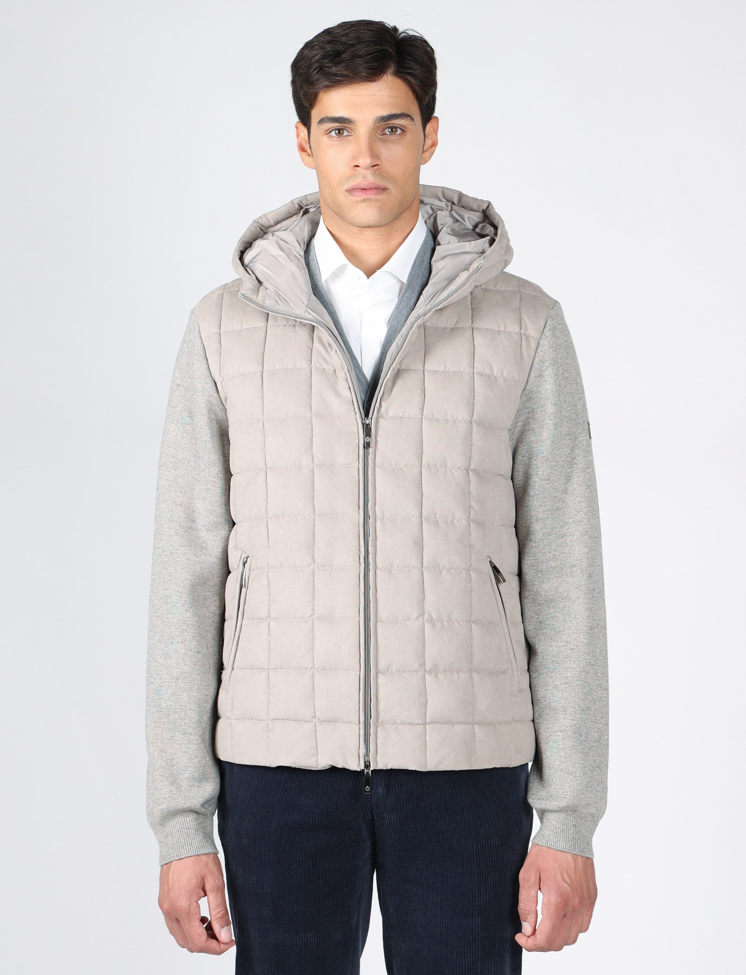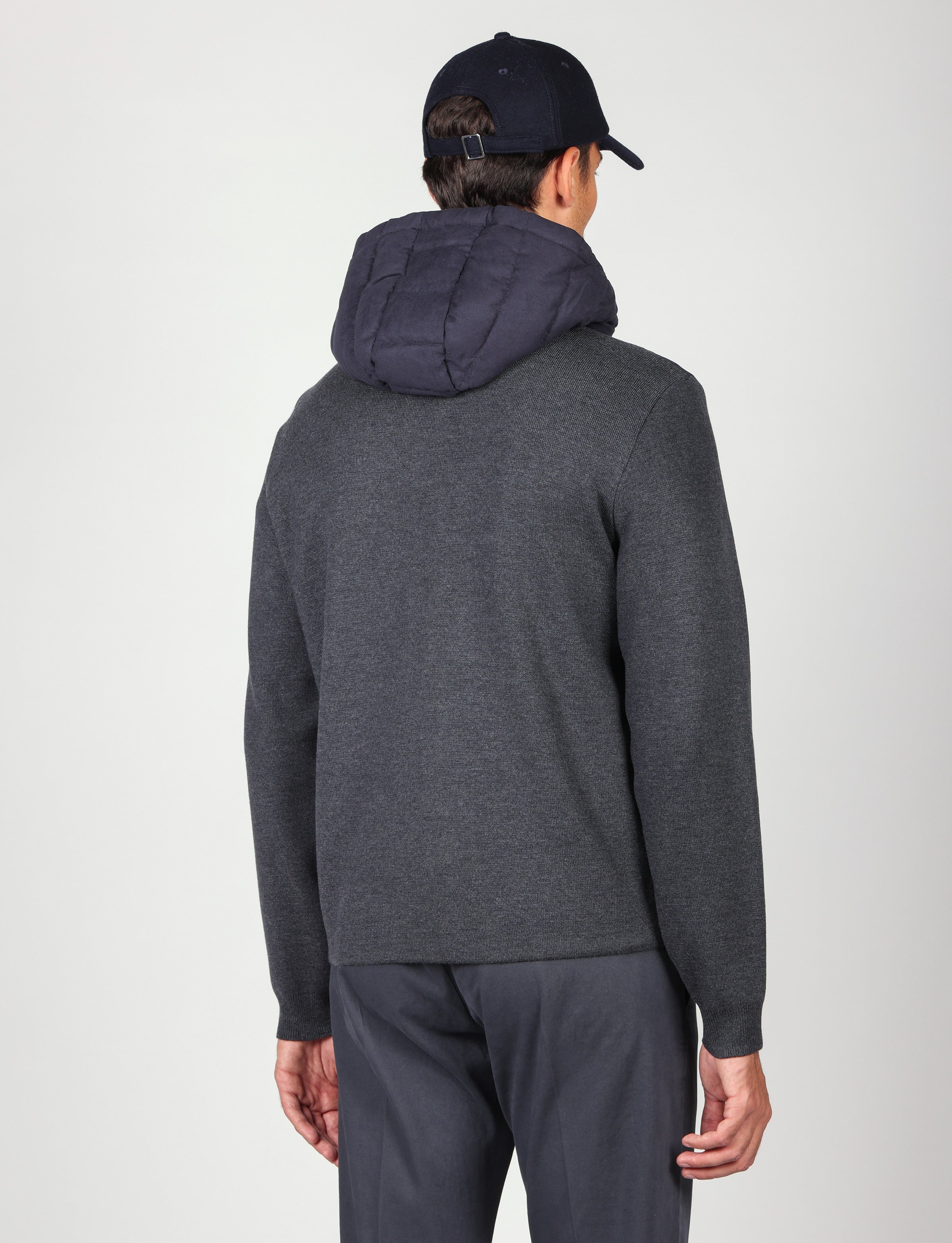 Maglia giubbino con frontale in alcantara trapuntata e retro in tessuto, pensata per unire eleganza e praticità. Perfetta per la mezza stagione, offre uno stile moderno e versatile.