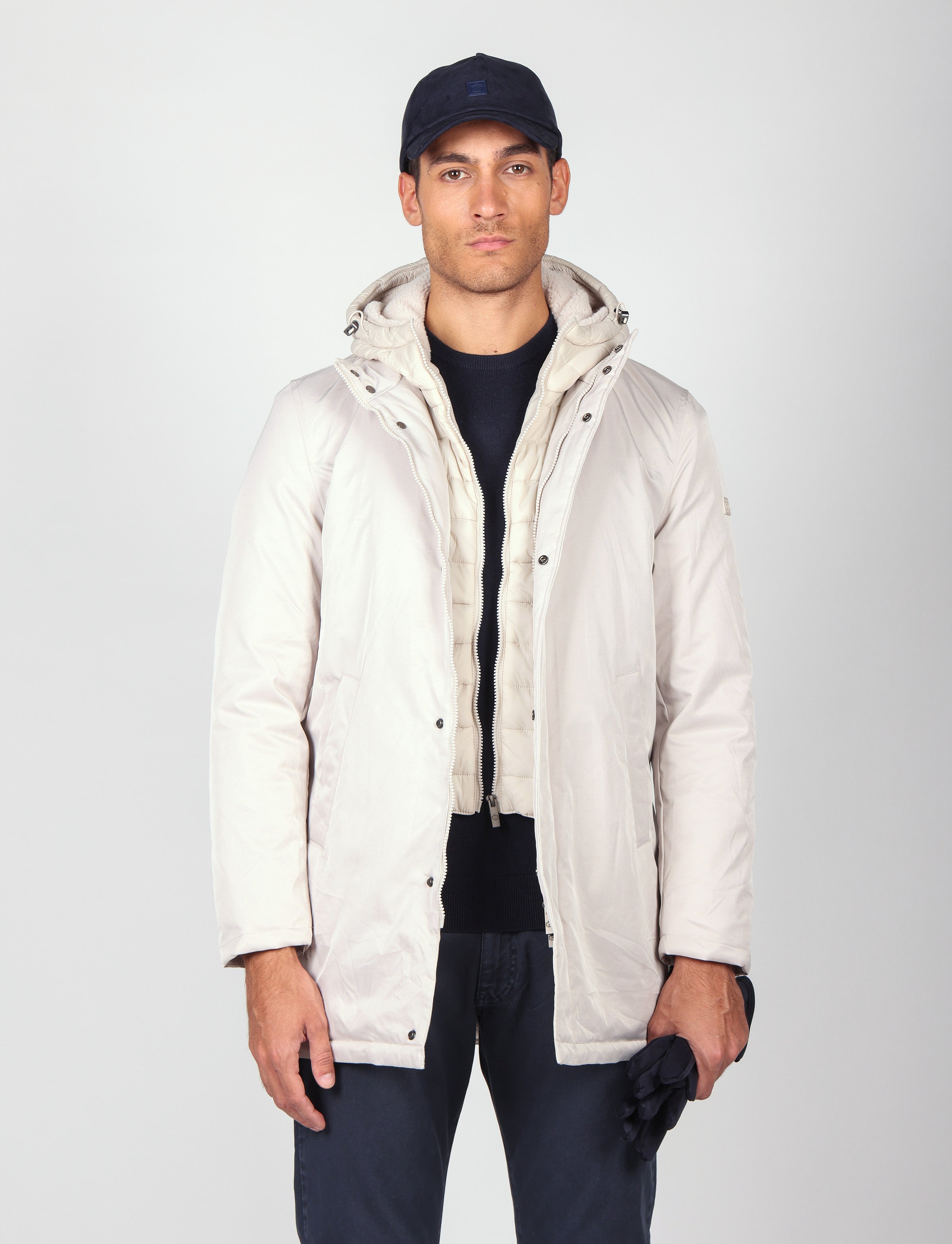 Parka imbottito tecnico dal design moderno e funzionale. Presenta una pettorina removibile e un interno foderato in morbido tessuto effetto shearling che assicura calore e comfort nelle giornate più fredde.