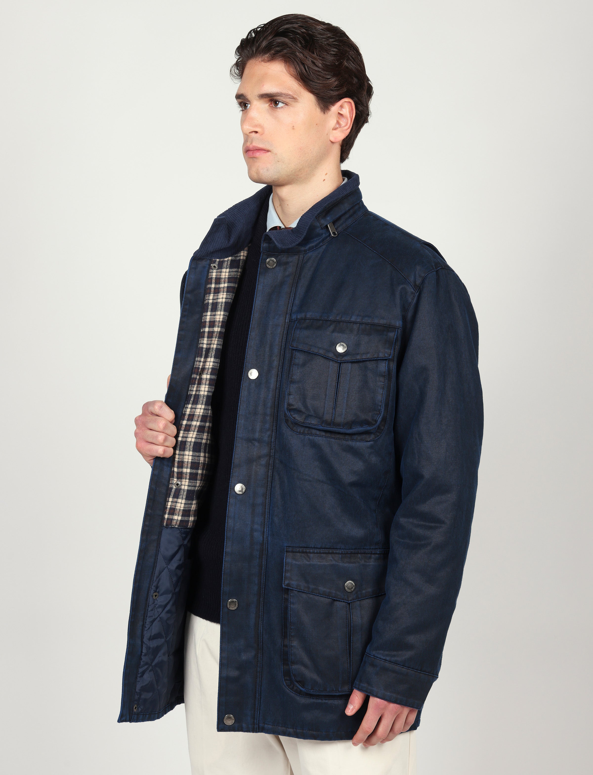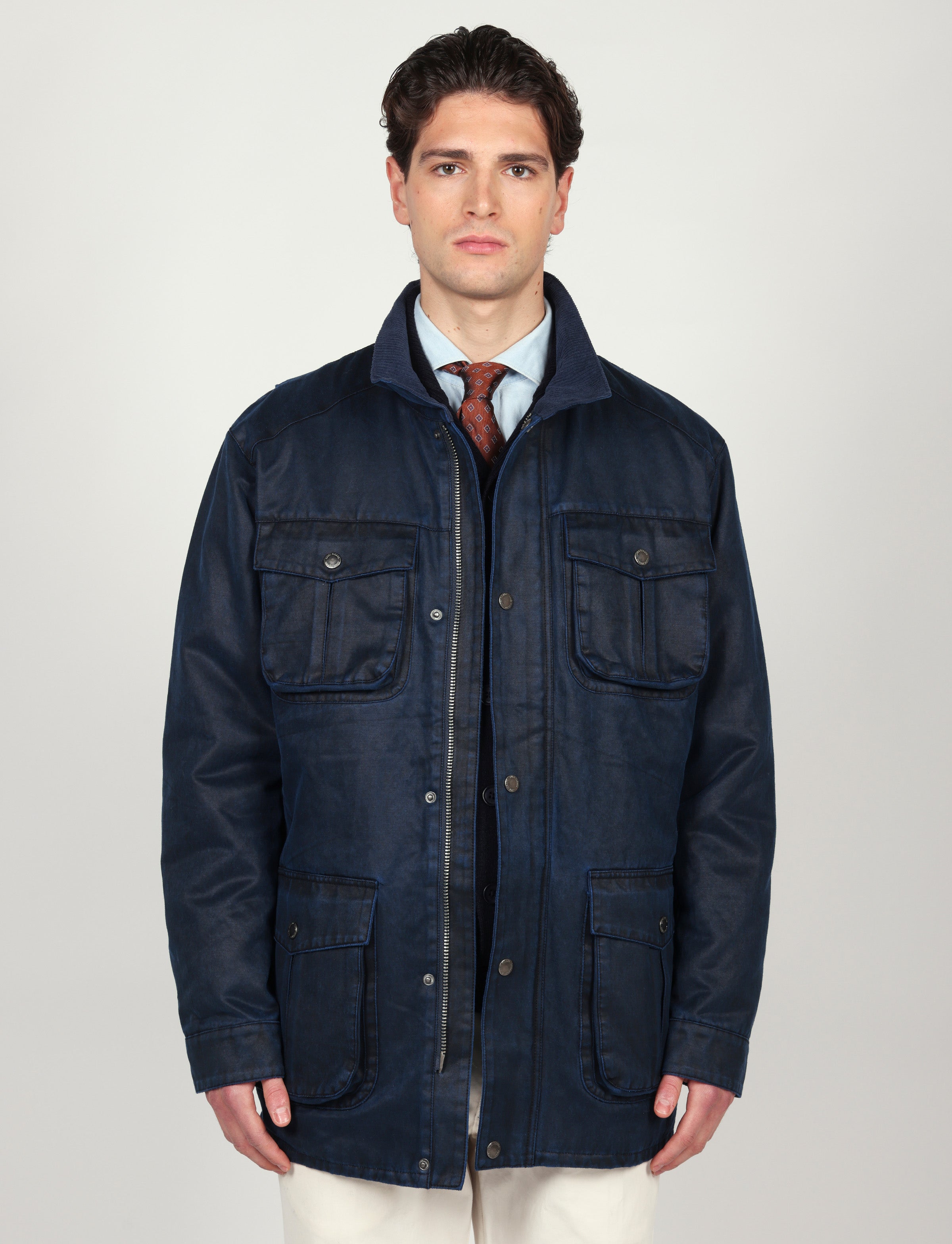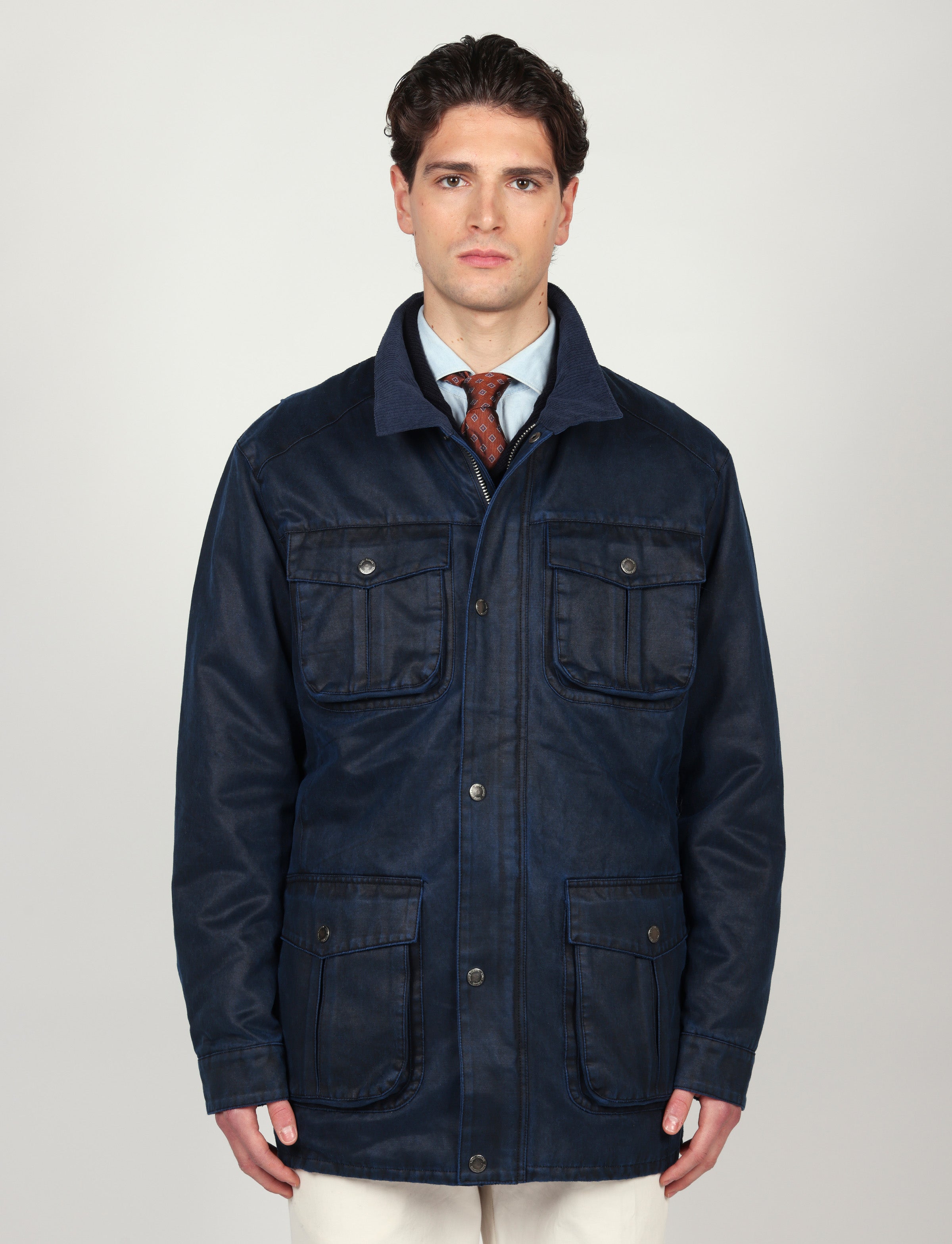 Sahariana in cotone cerato dall’appeal deciso e funzionale, con inserti in velluto e tasche multifunzione. Un capospalla pratico e resistente, ideale per affrontare la stagione con stile senza rinunciare al comfort.