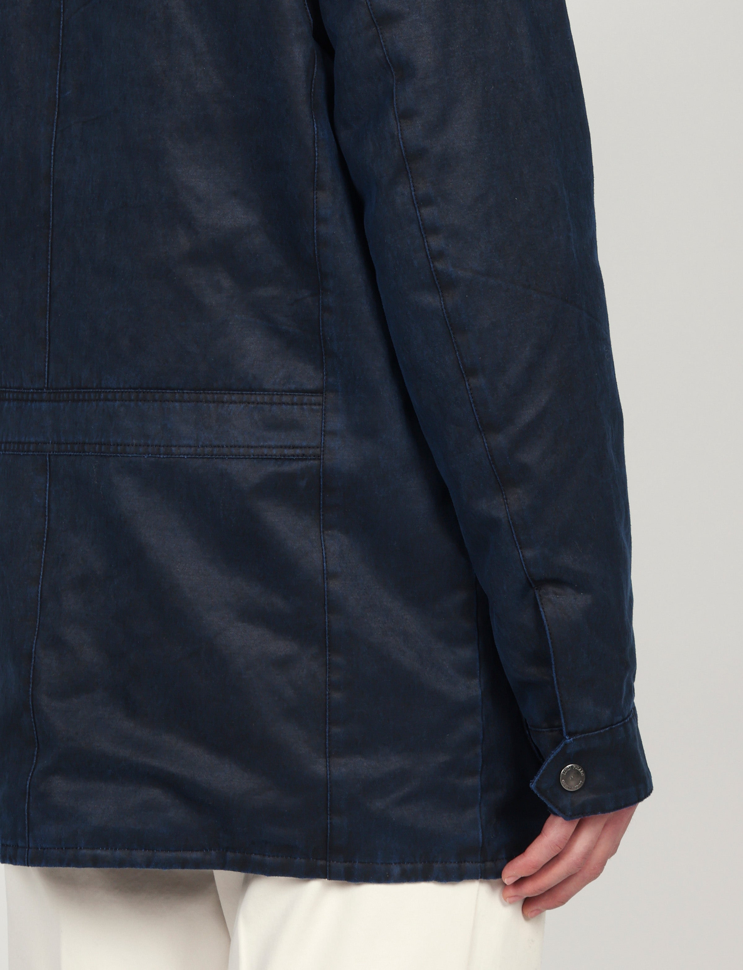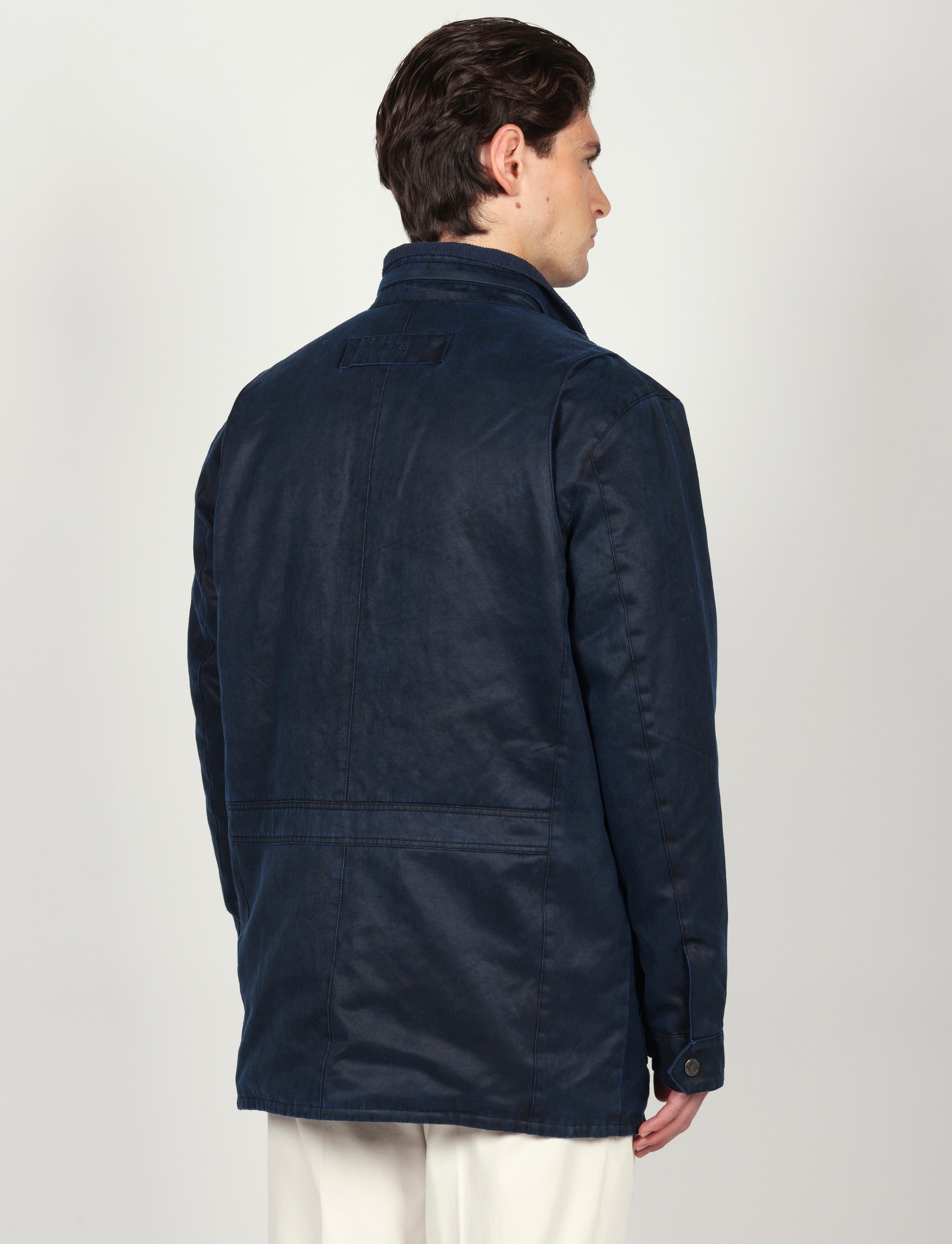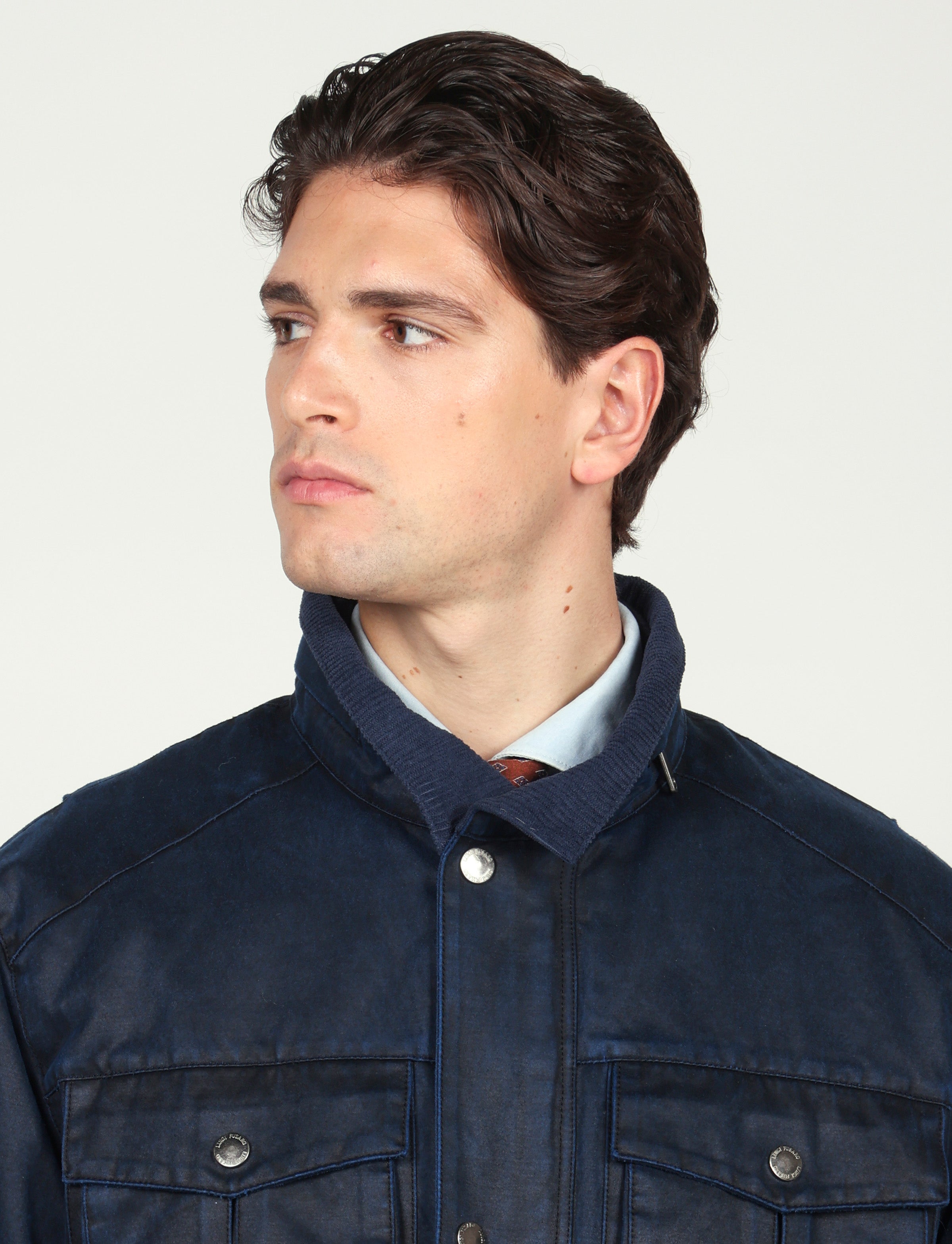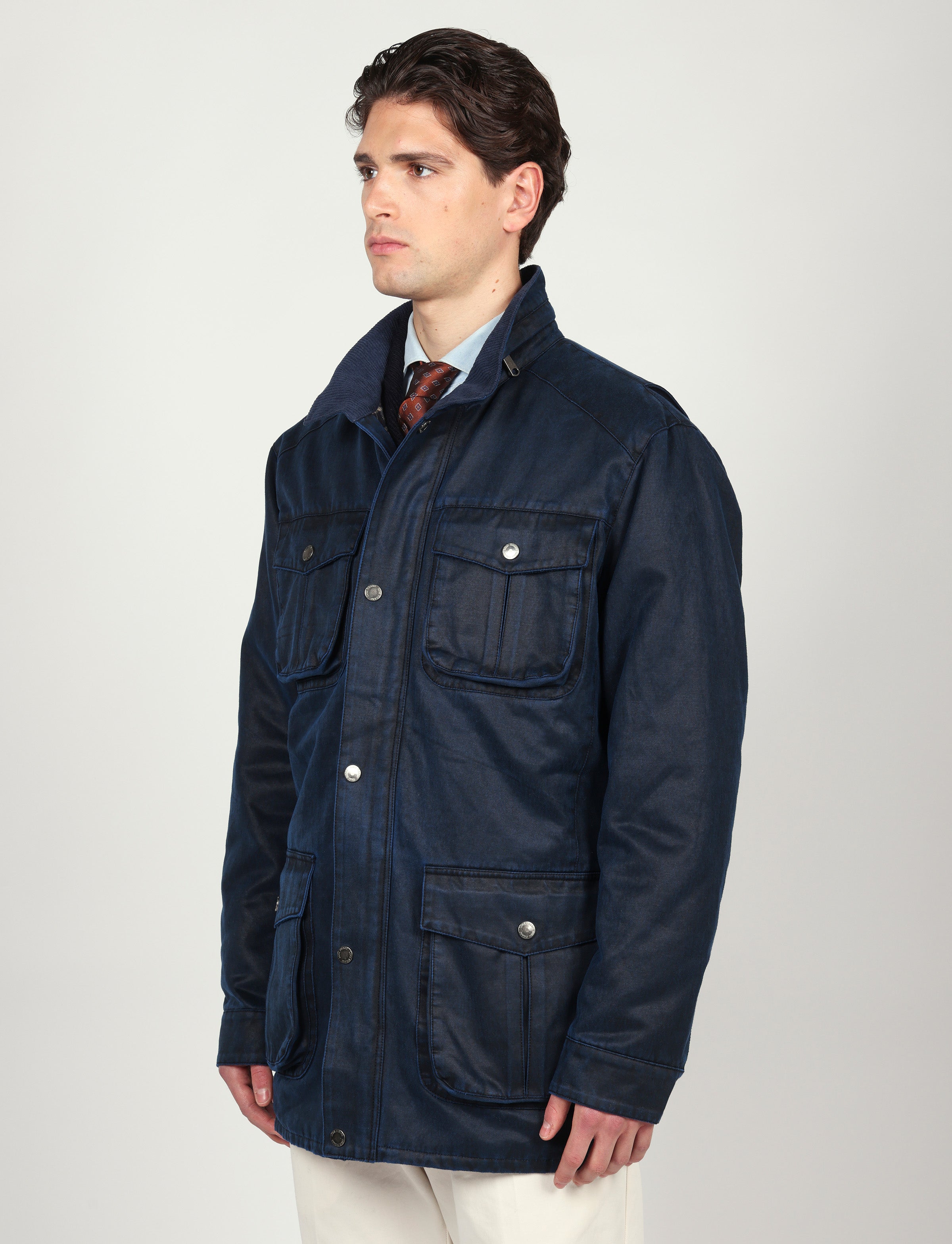 Sahariana in cotone cerato dall’appeal deciso e funzionale, con inserti in velluto e tasche multifunzione. Un capospalla pratico e resistente, ideale per affrontare la stagione con stile senza rinunciare al comfort.