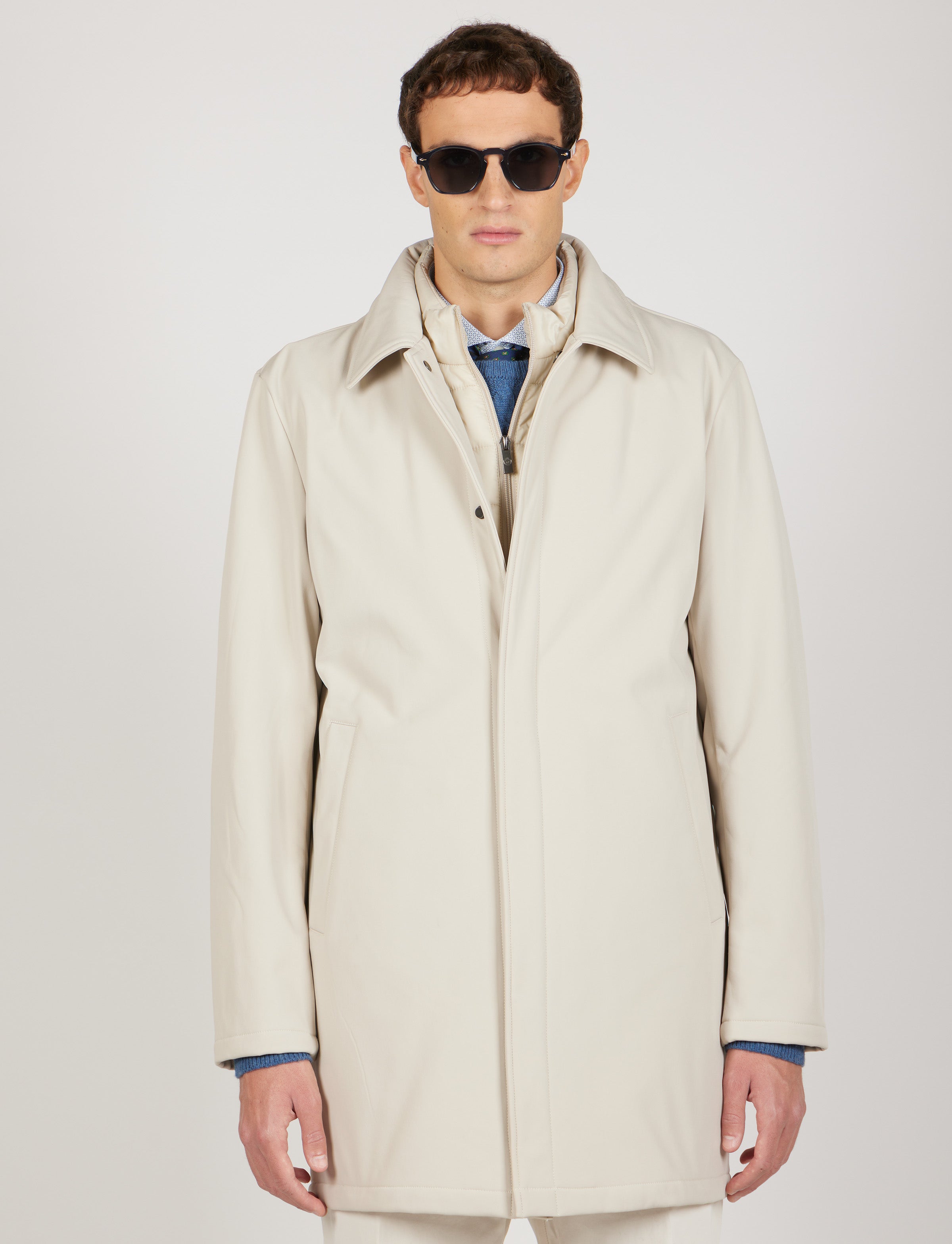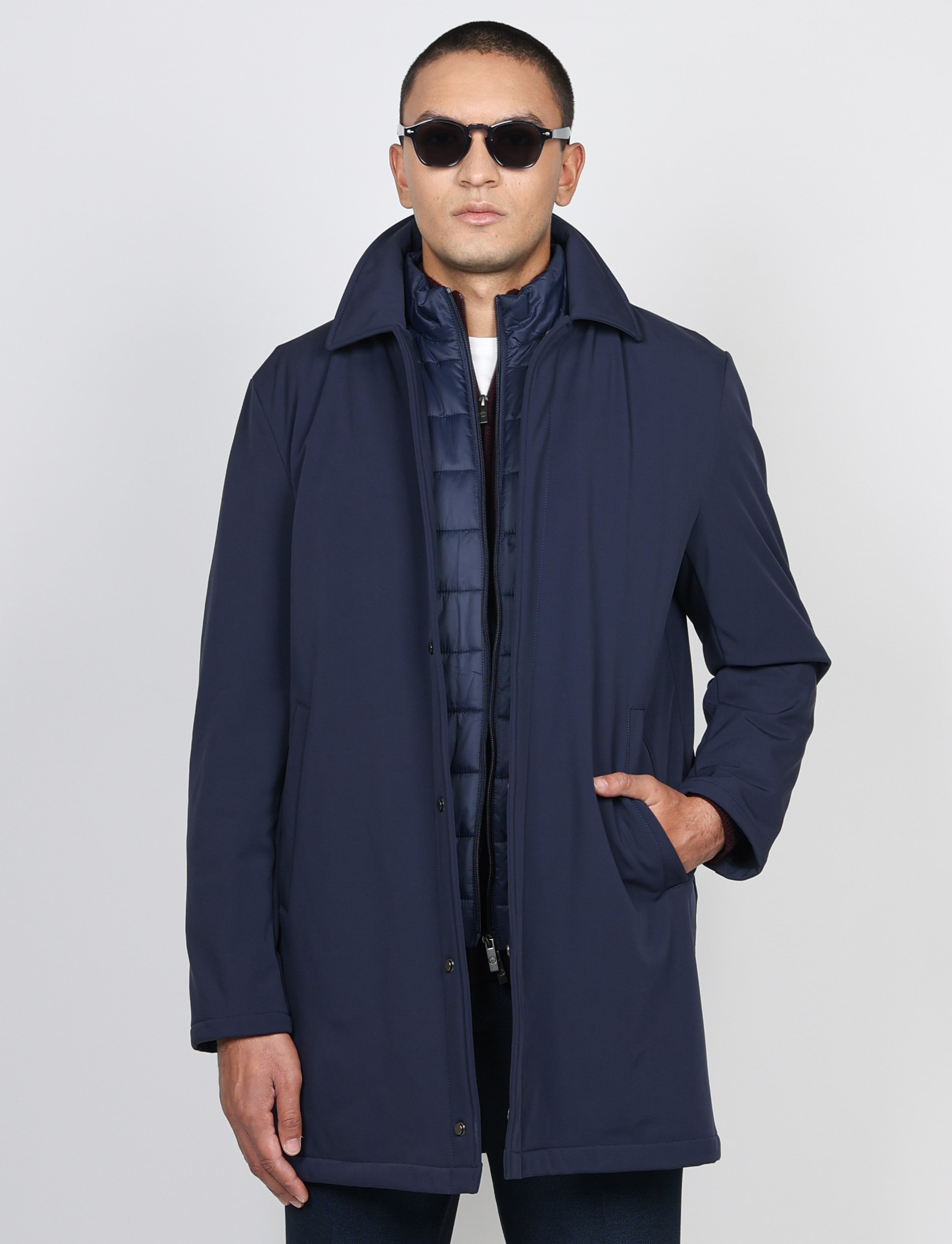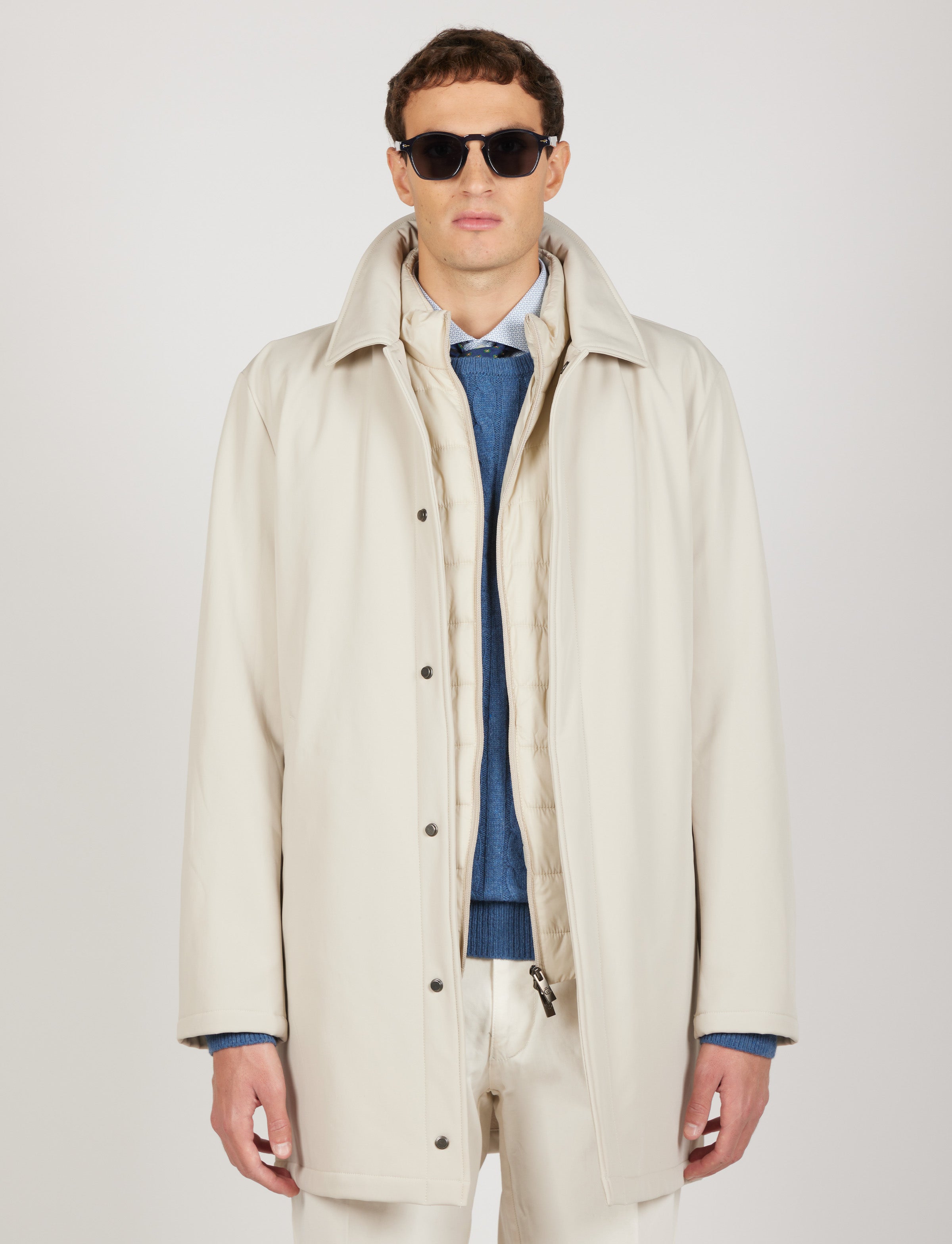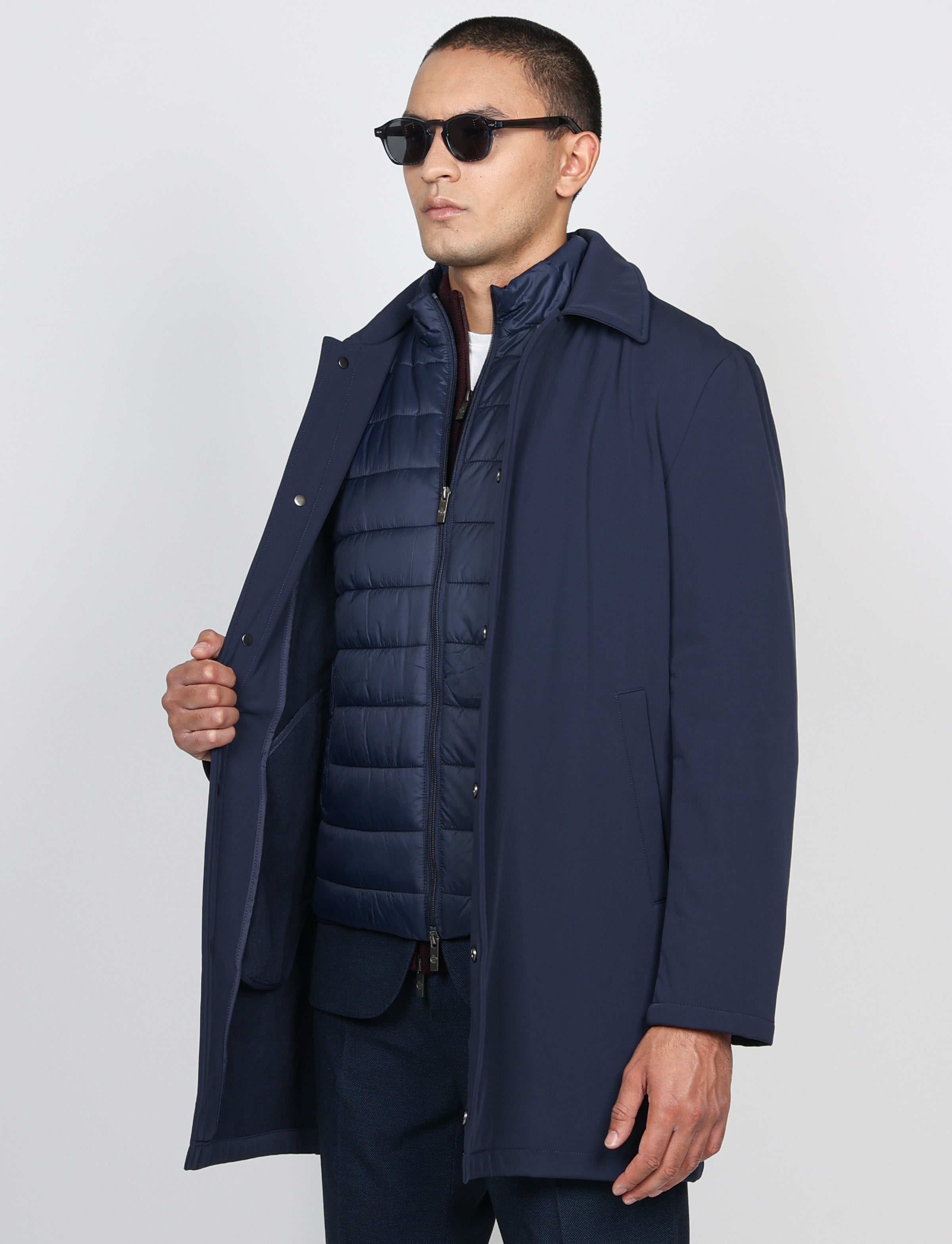 Trench tecnico dalle linee pulite, resistente a vento e pioggia leggera. Dotato di pettorina interna sfoderabile con bottoni, utilizzabile anche separatamente come gilet imbottito. Perfetto per pendolarismo, tempo libero e look urbani.