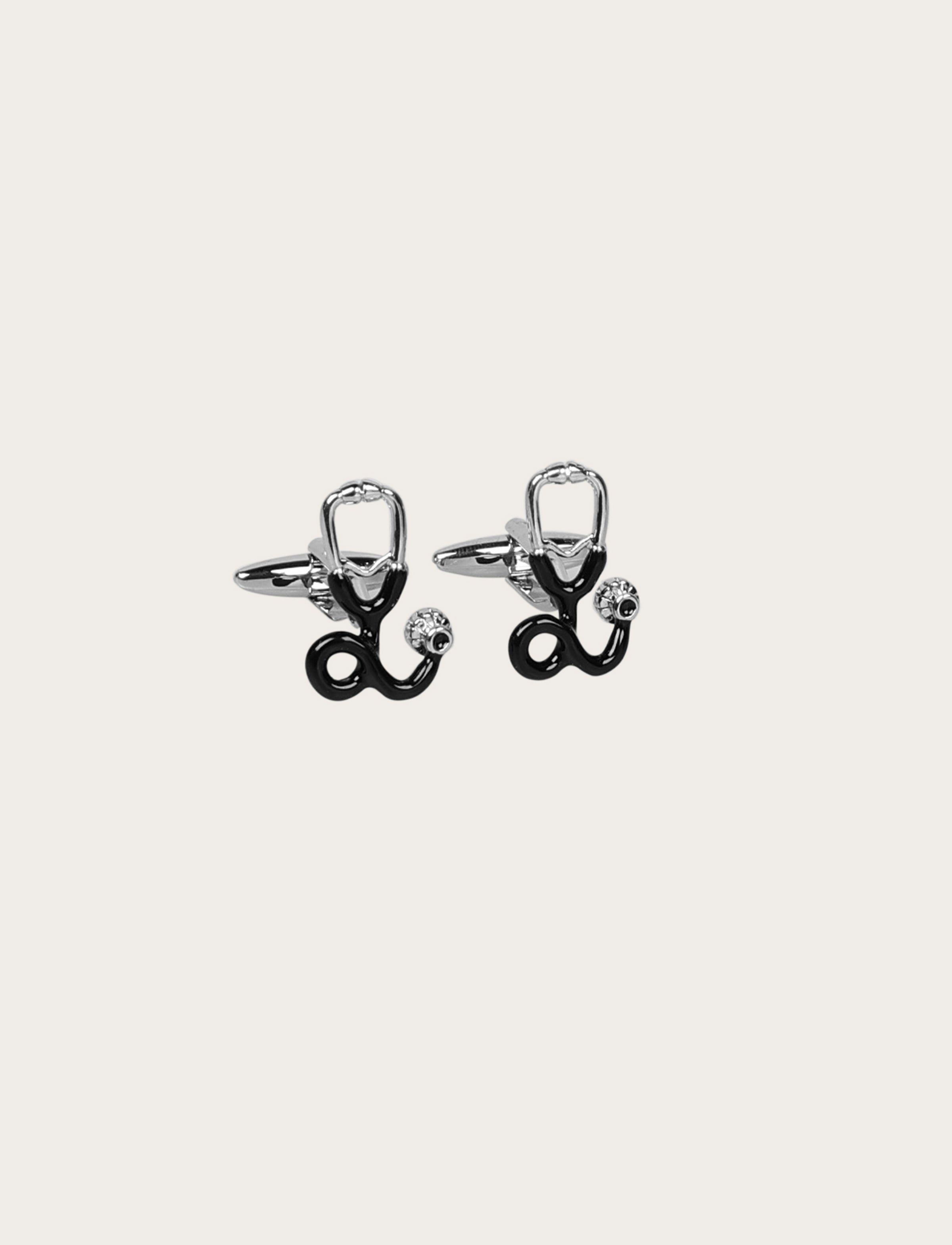 Gemelli dal design originale a forma di stetoscopio, realizzati in metallo lucido con dettagli neri a contrasto. Un accessorio distintivo che unisce eleganza e personalità, ideale per aggiungere carattere a camicie formali e outfit ricercati.