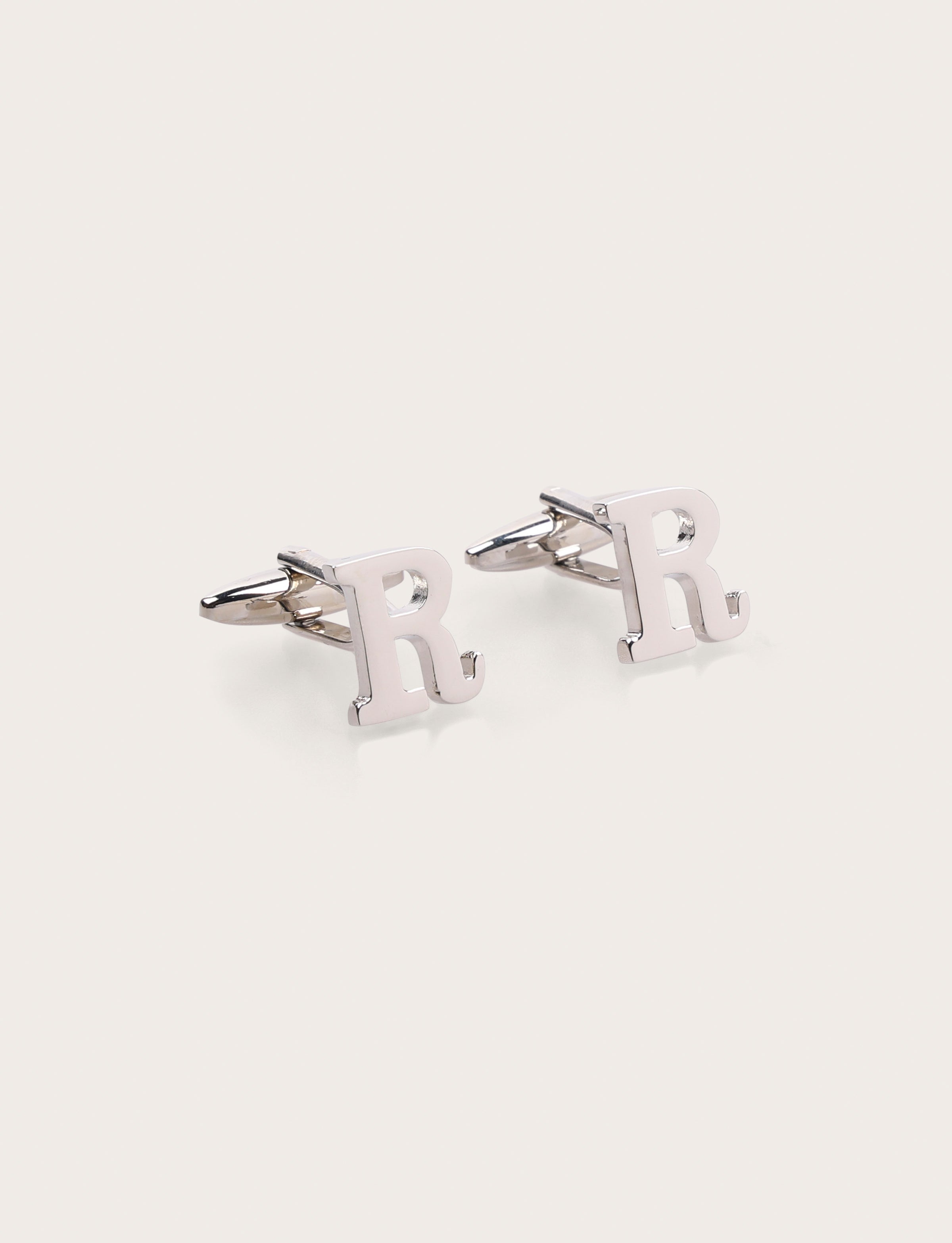 Gemelli da camicia con iniziale R in metallo lucido, eleganti e personalizzabili. Perfetti per cerimonie, eventi formali o come idea regalo raffinata.