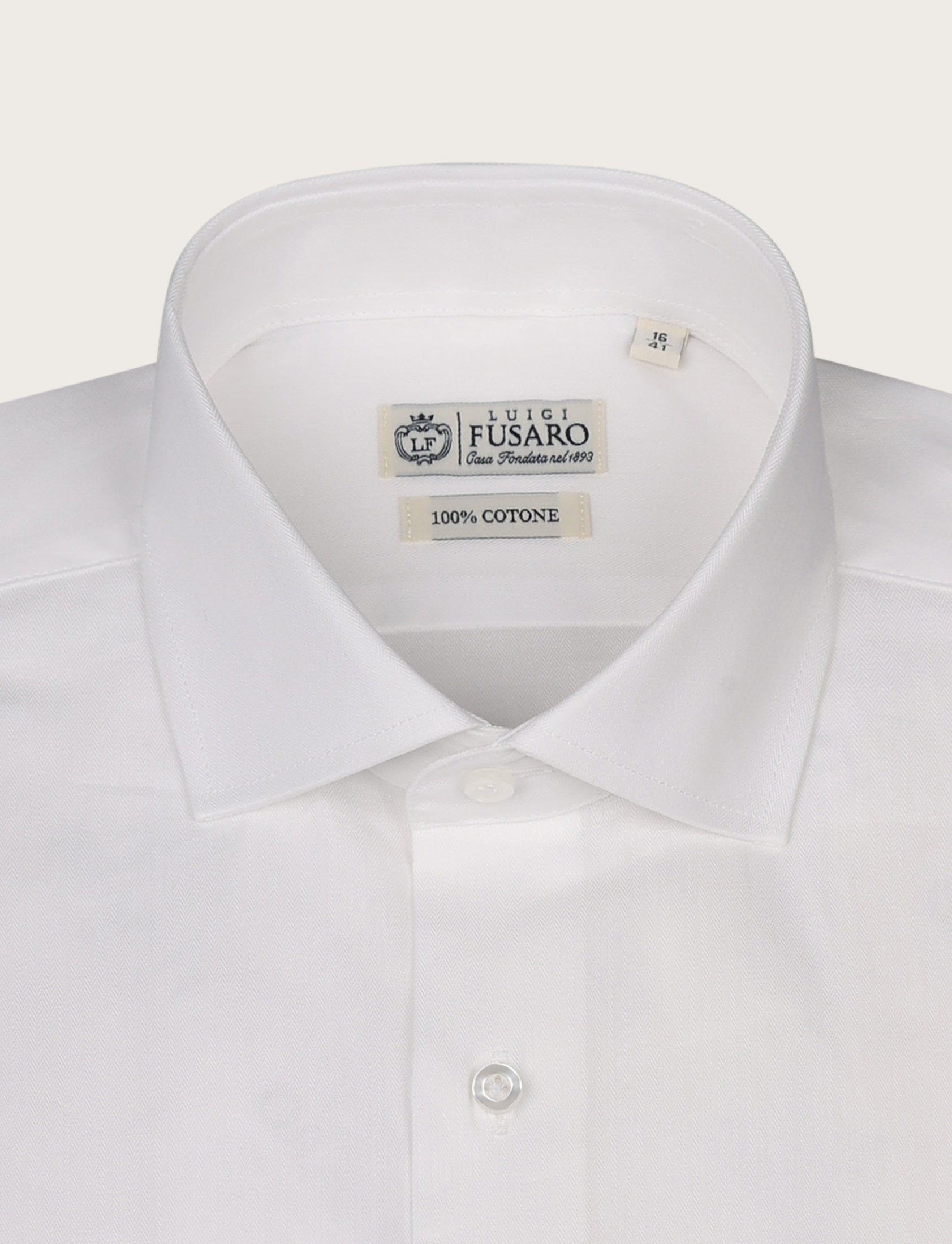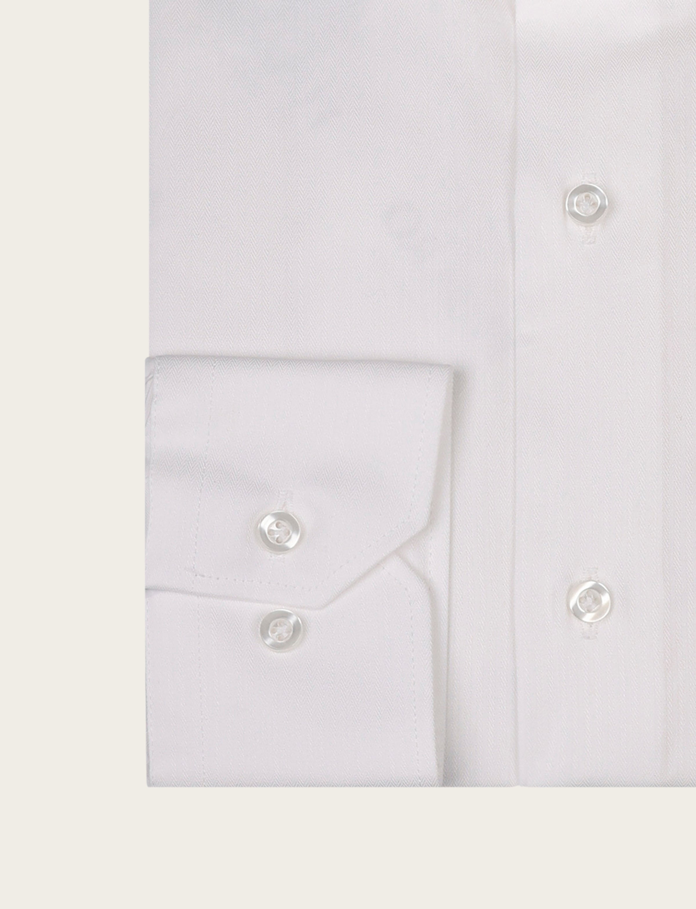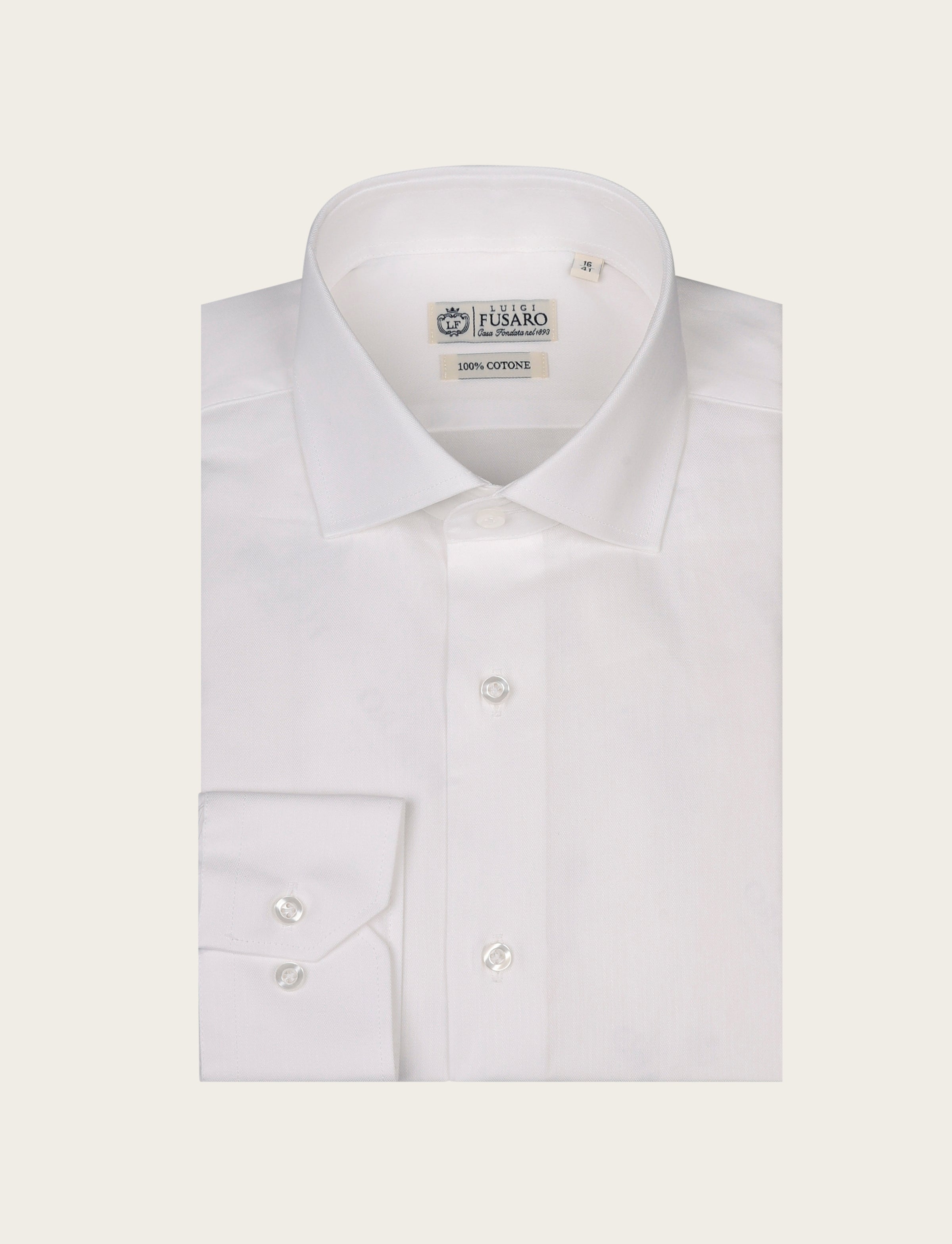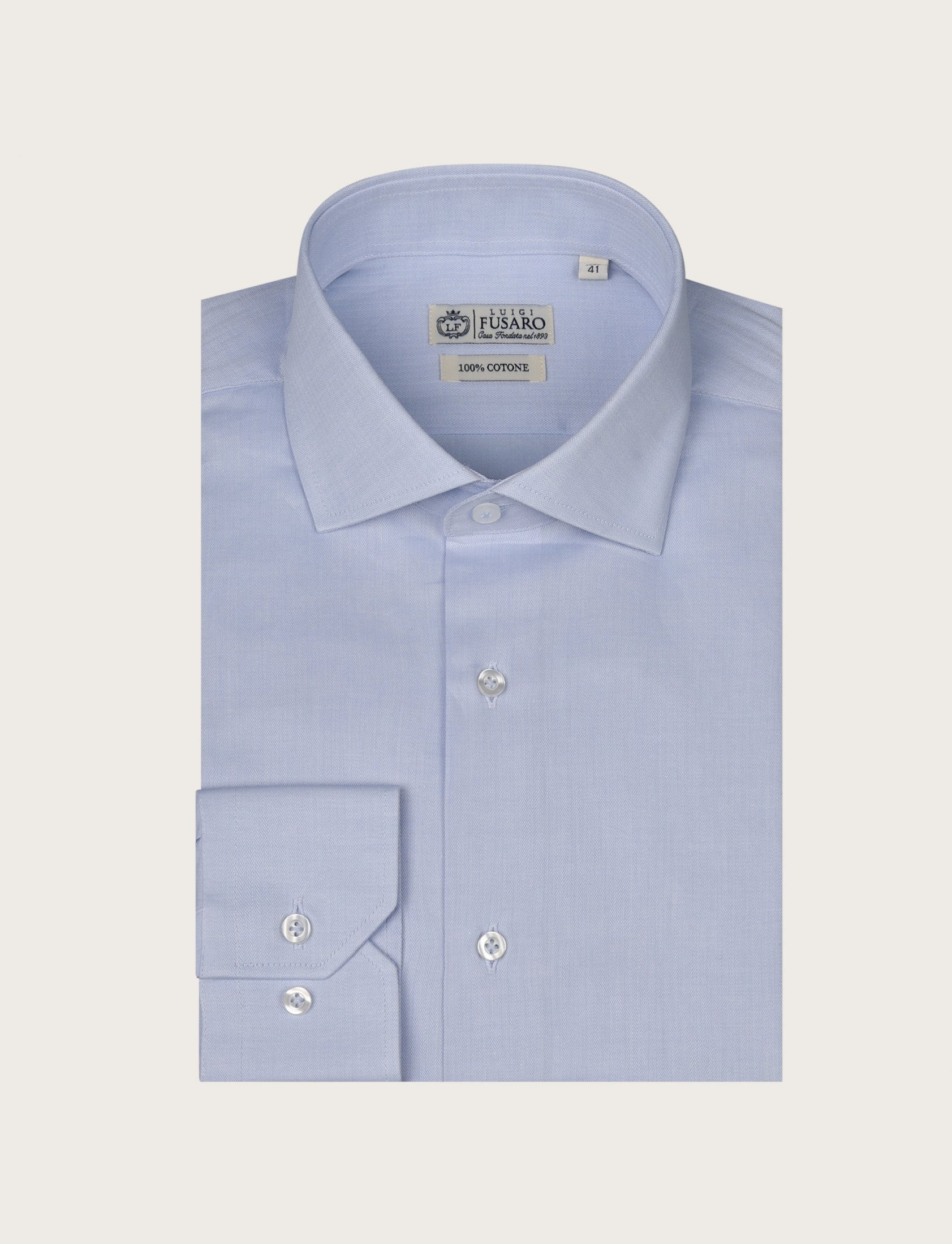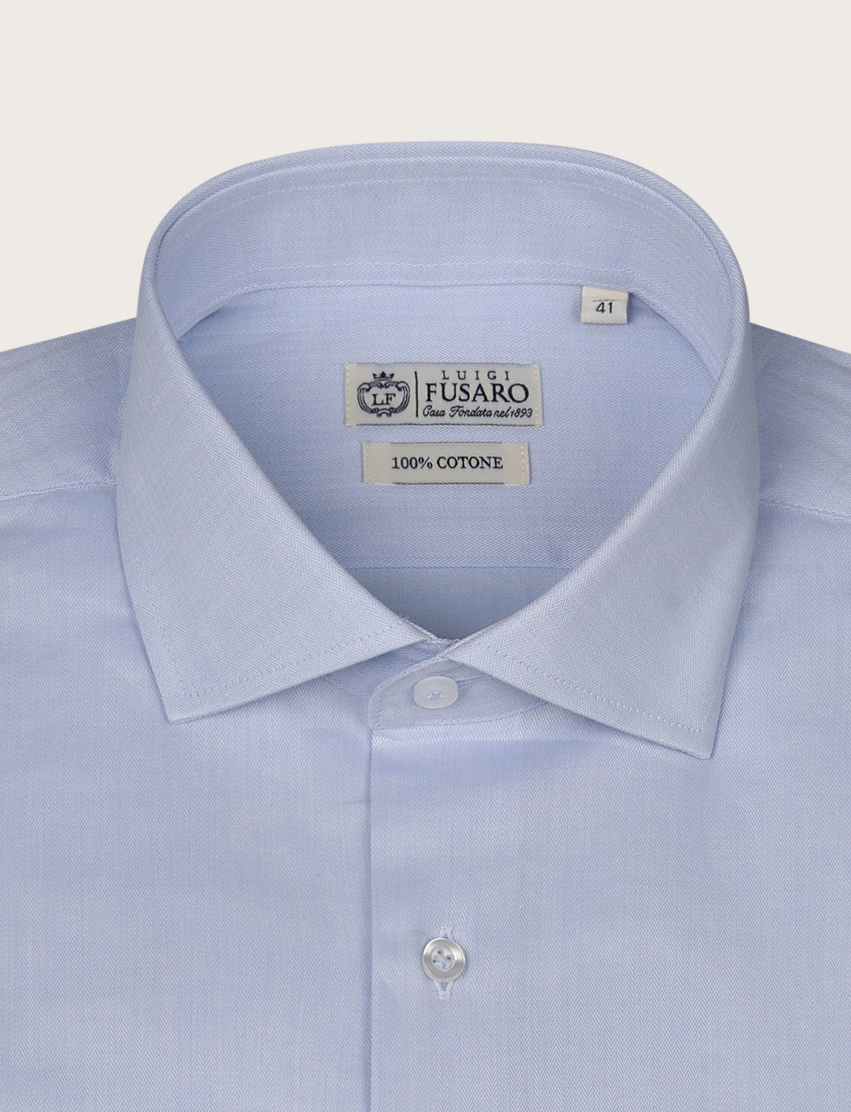 Camicia in puro cotone con elegante lavorazione spigata, morbida sulla pelle e perfetta per outfit business impeccabili. Il disegno micro a spina di pesce aggiunge profondità e luminosità al colore, rendendola una scelta raffinata per chi ama lo stile classico ma ricercato.