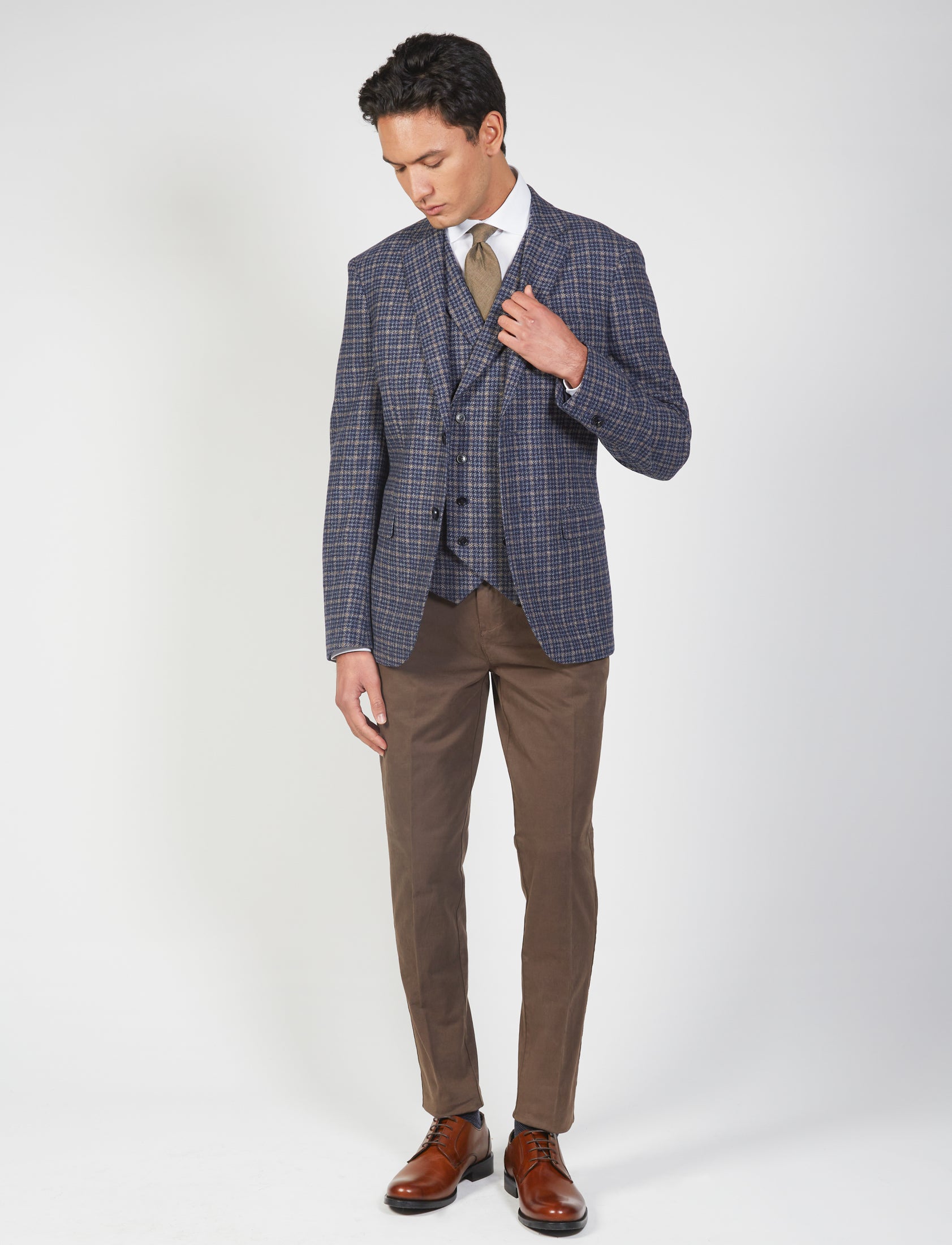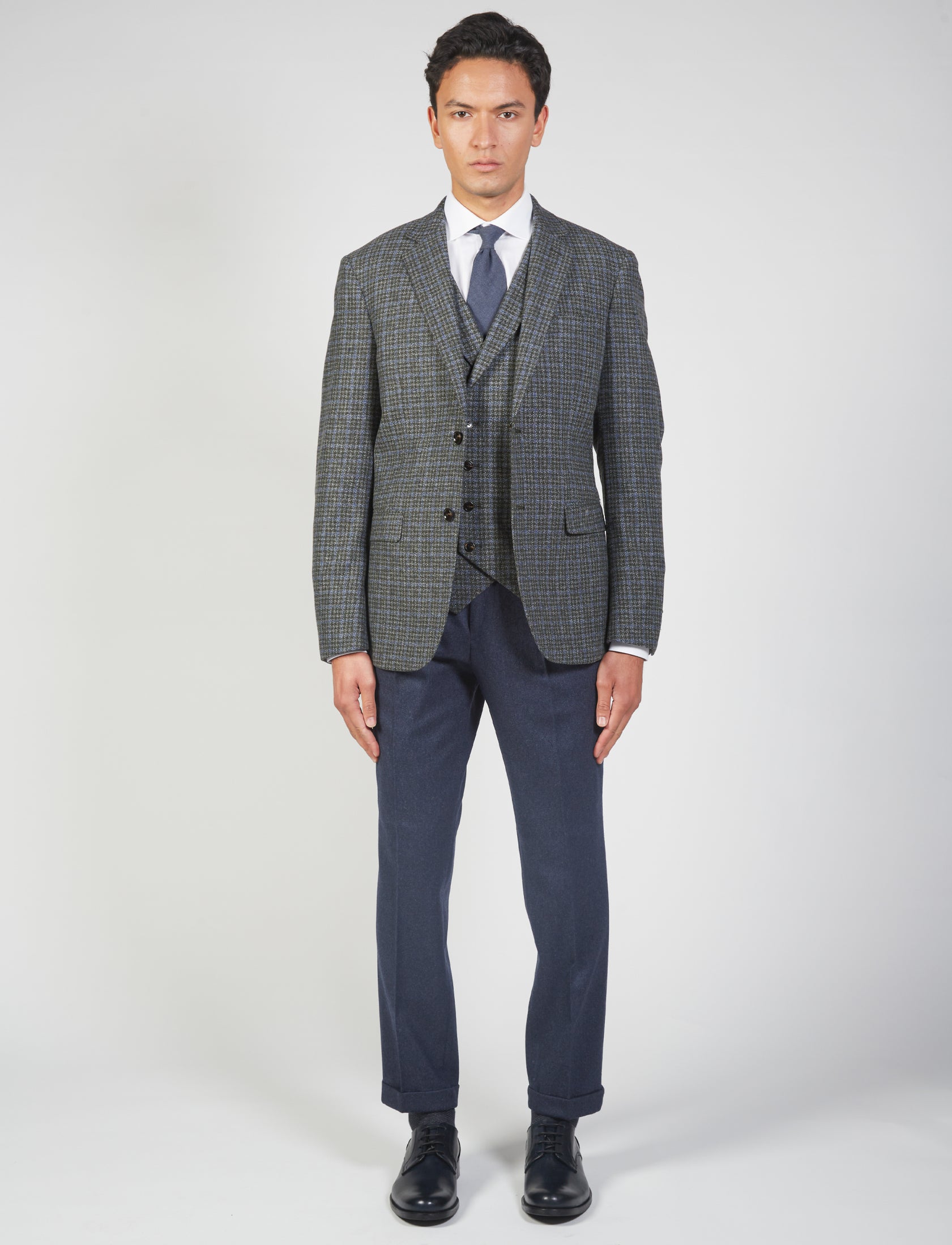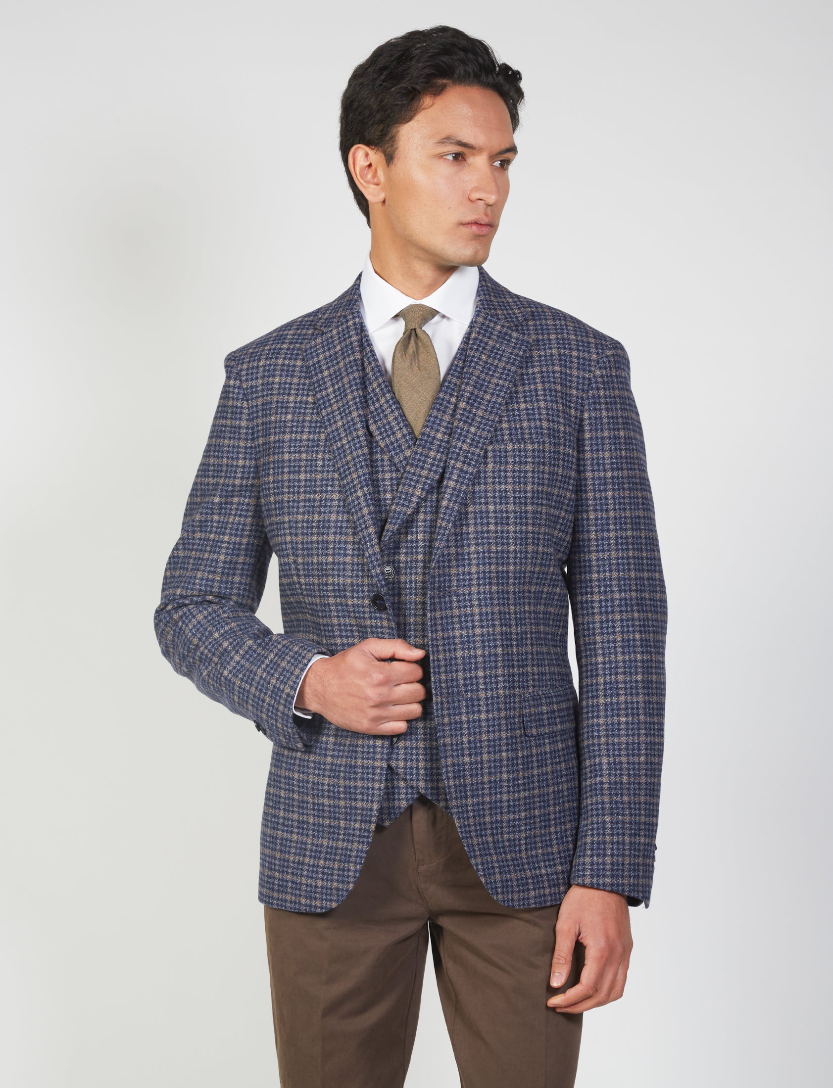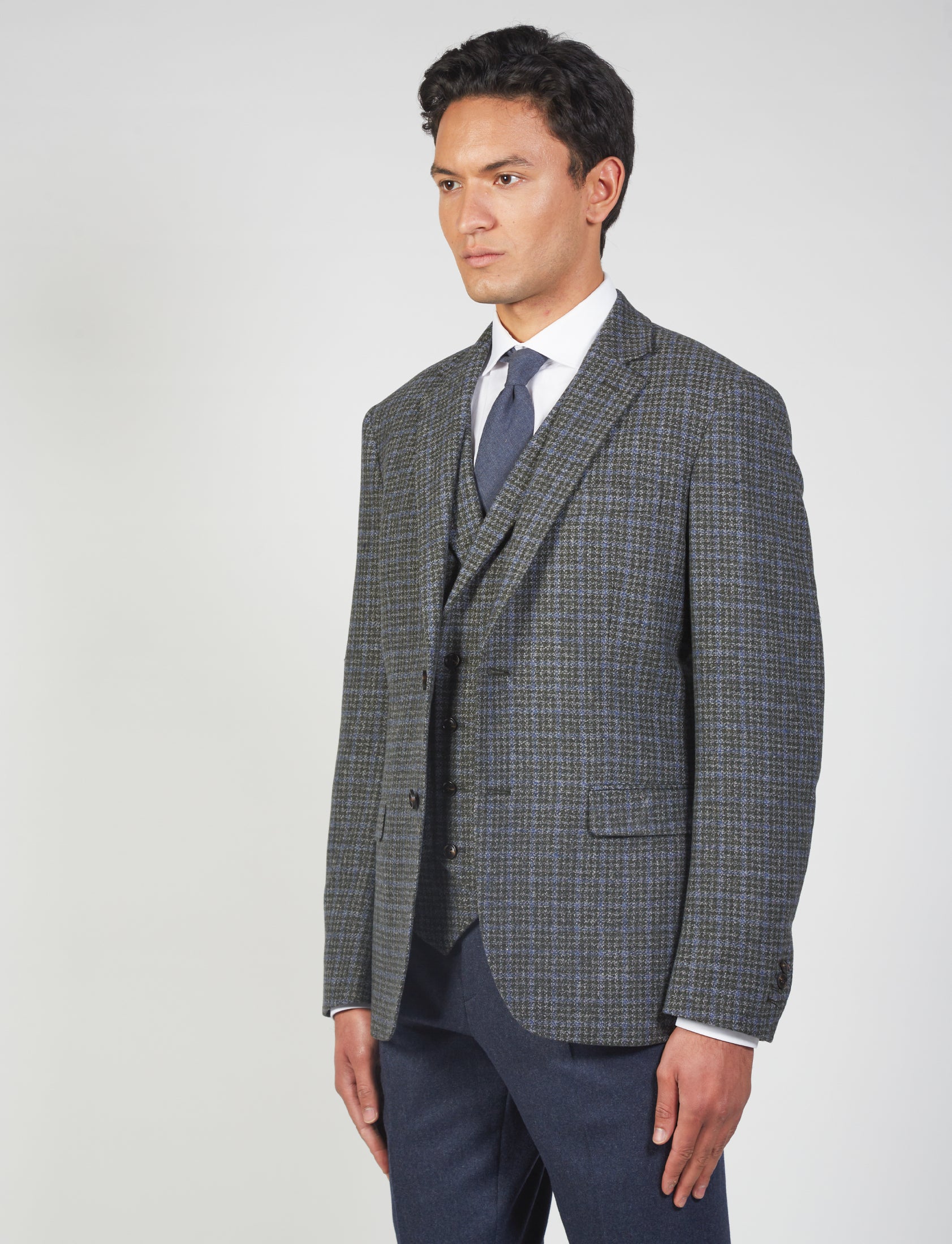 Scopri la giacca in lana pied de poule per uomo, perfetta per ogni occasione formale e casual. Con un design elegante, questo capo è caratterizzato dal classico rever, due tasche frontali a pattina, e un taschino sul petto. La chiusura a due bottoni e gli spacchi laterali garantiscono comfort e stile.