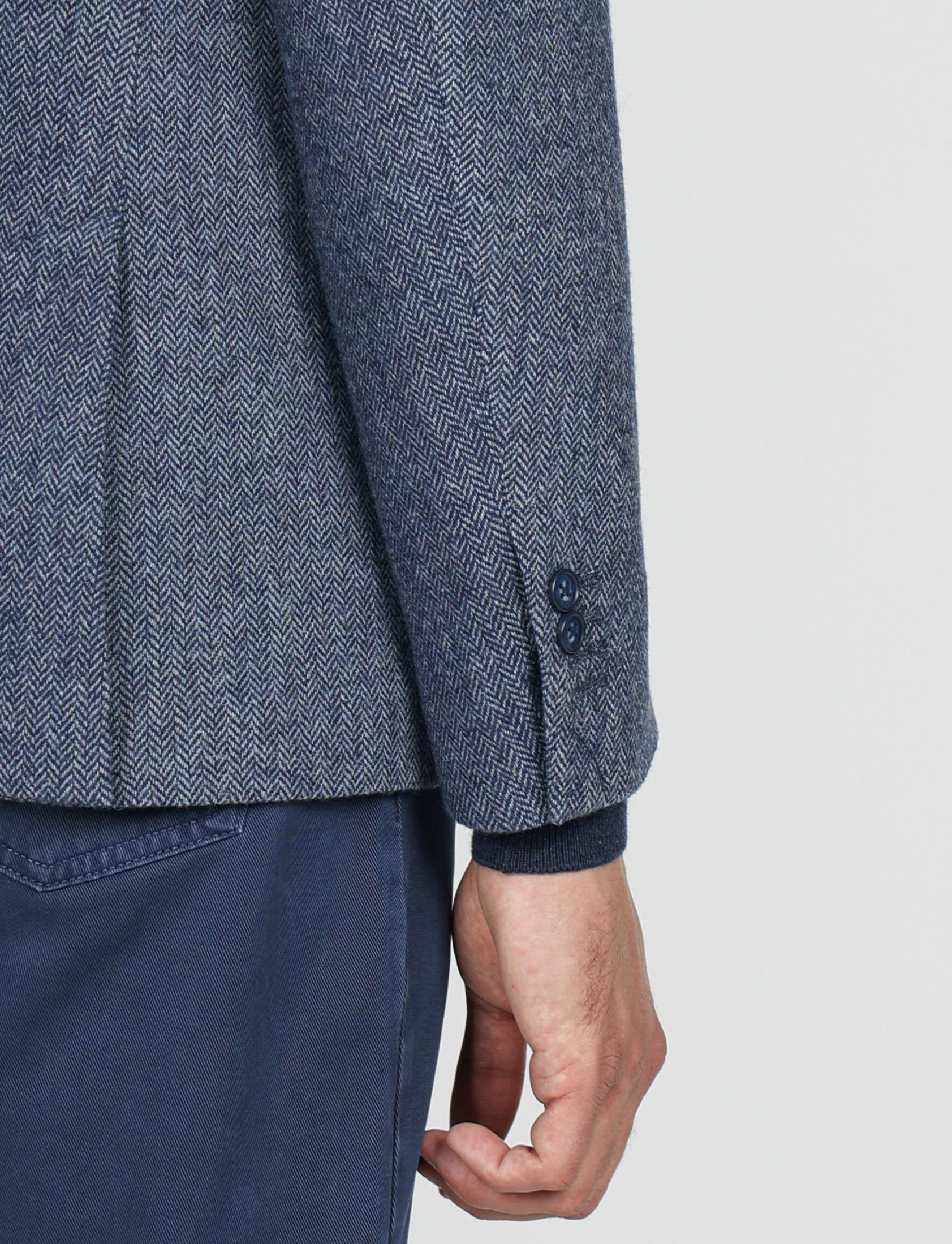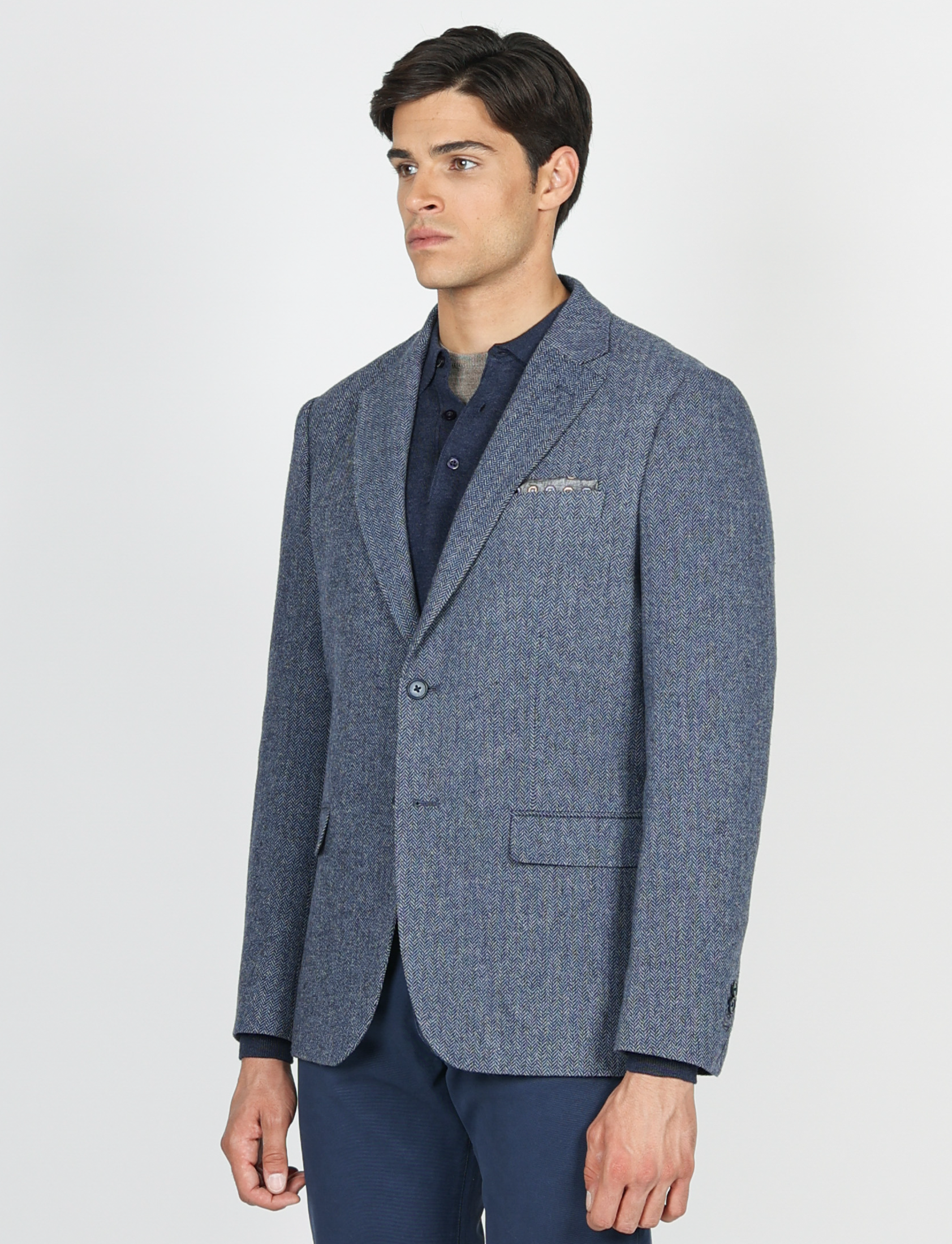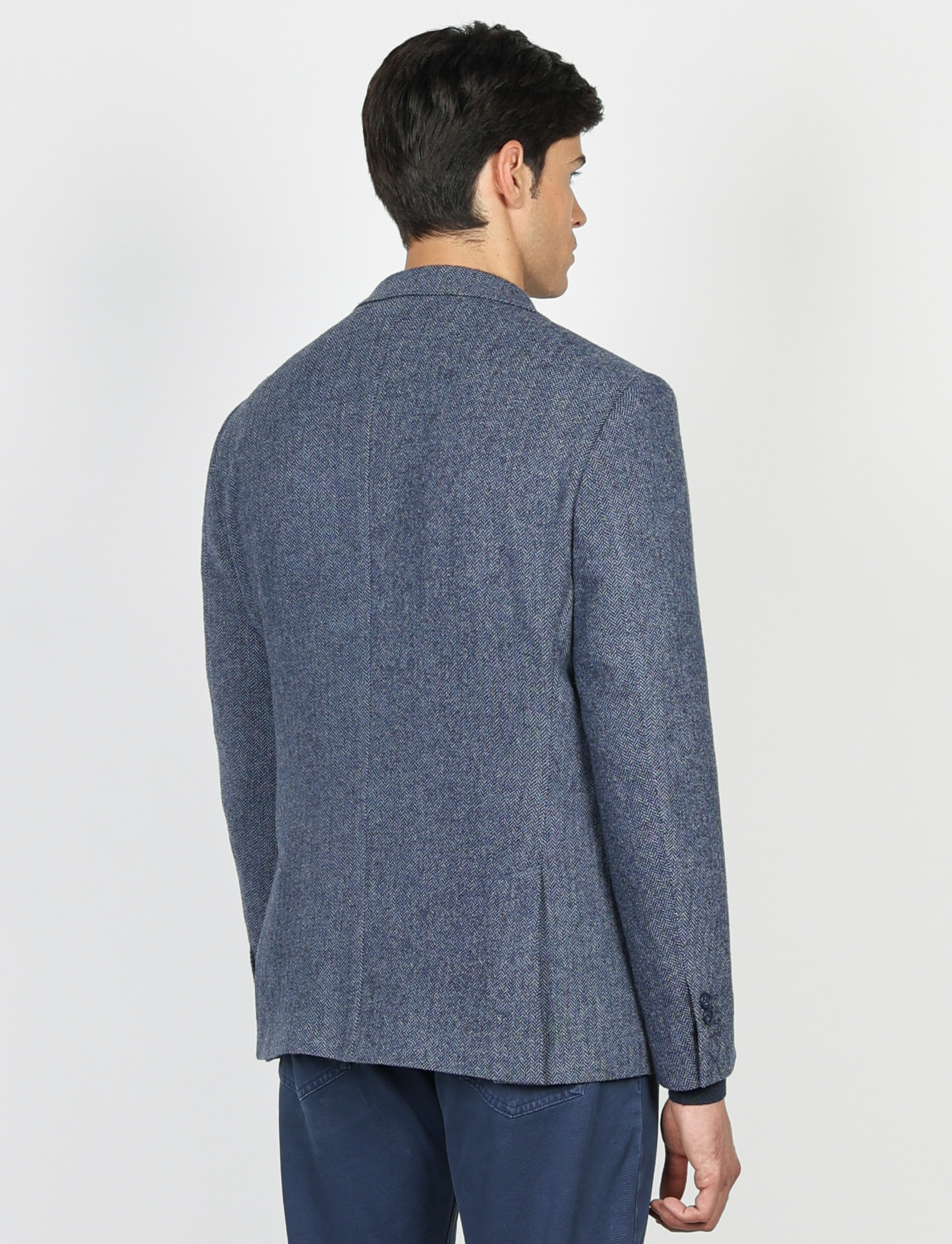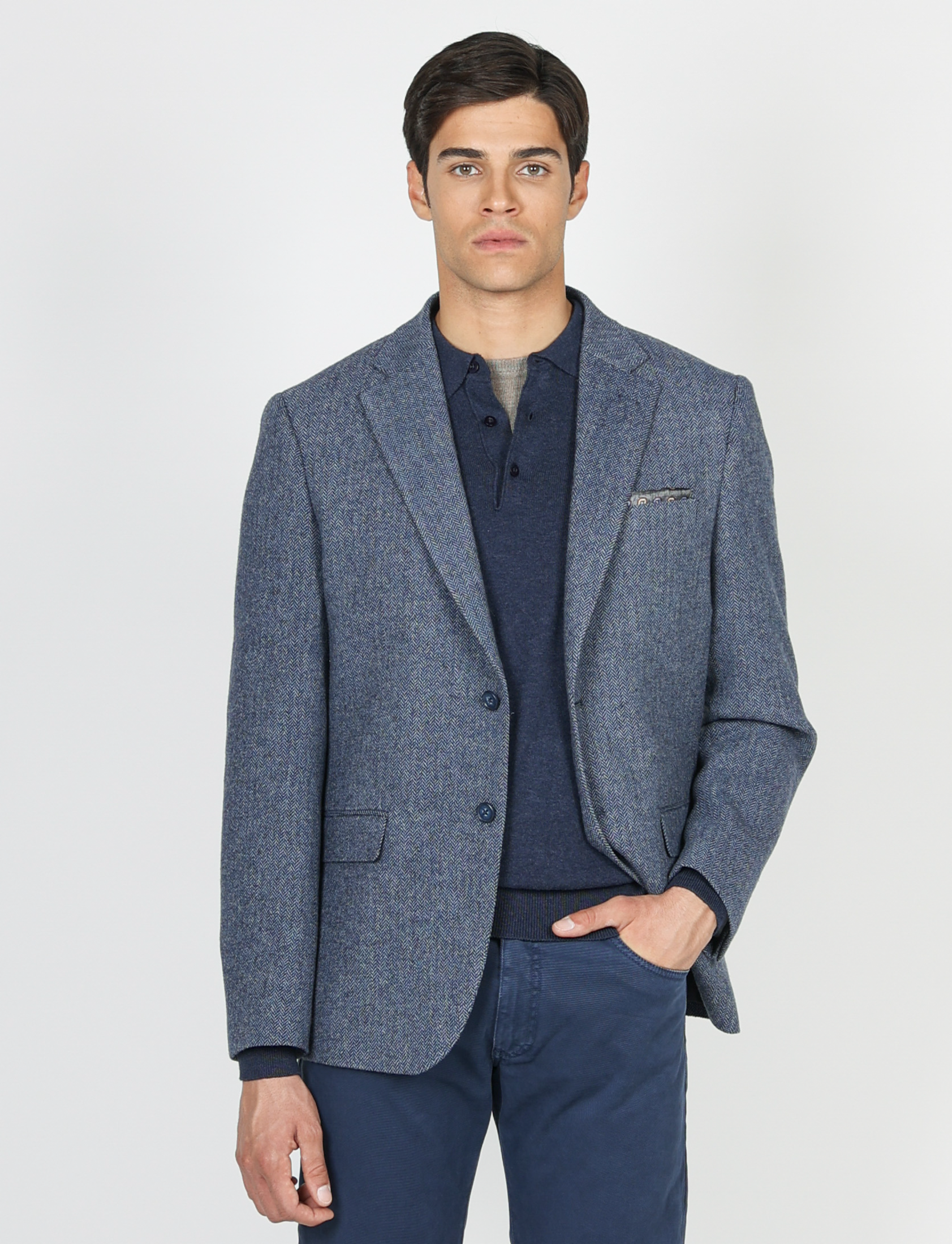 Il taglio slim fit valorizza la silhouette, mentre la costruzione moderna e la texture spigata donano un’eleganza classica ma contemporanea.
