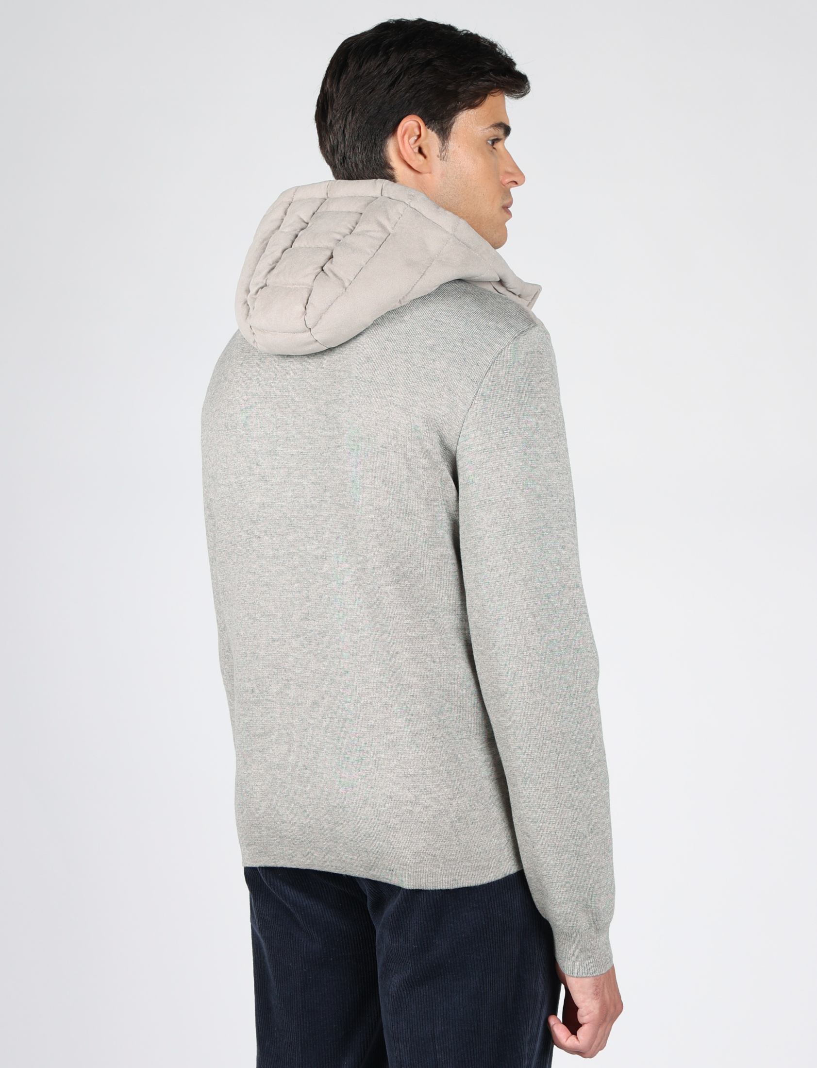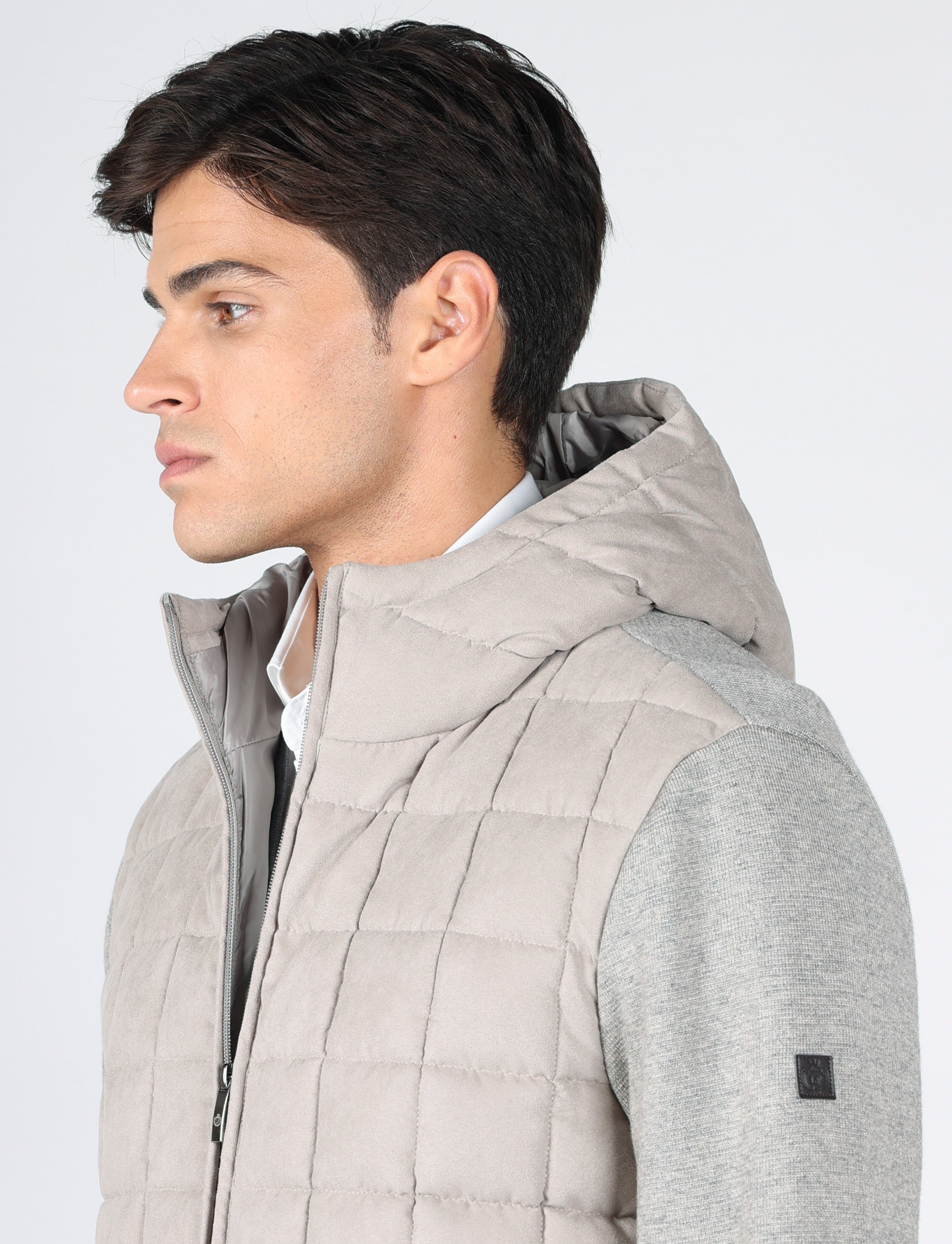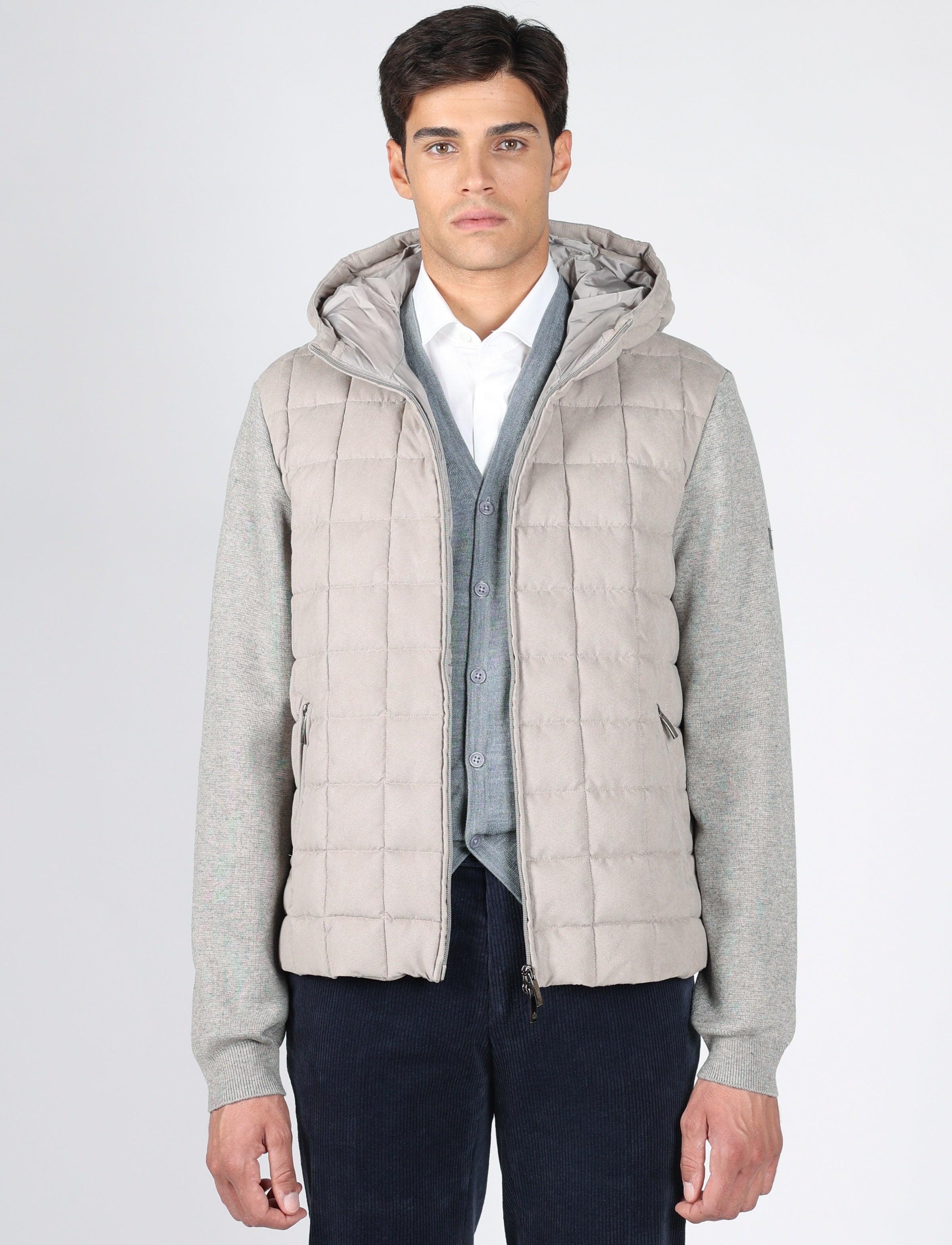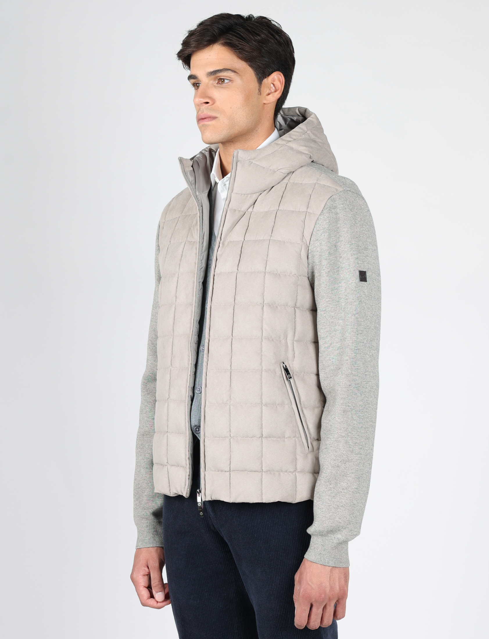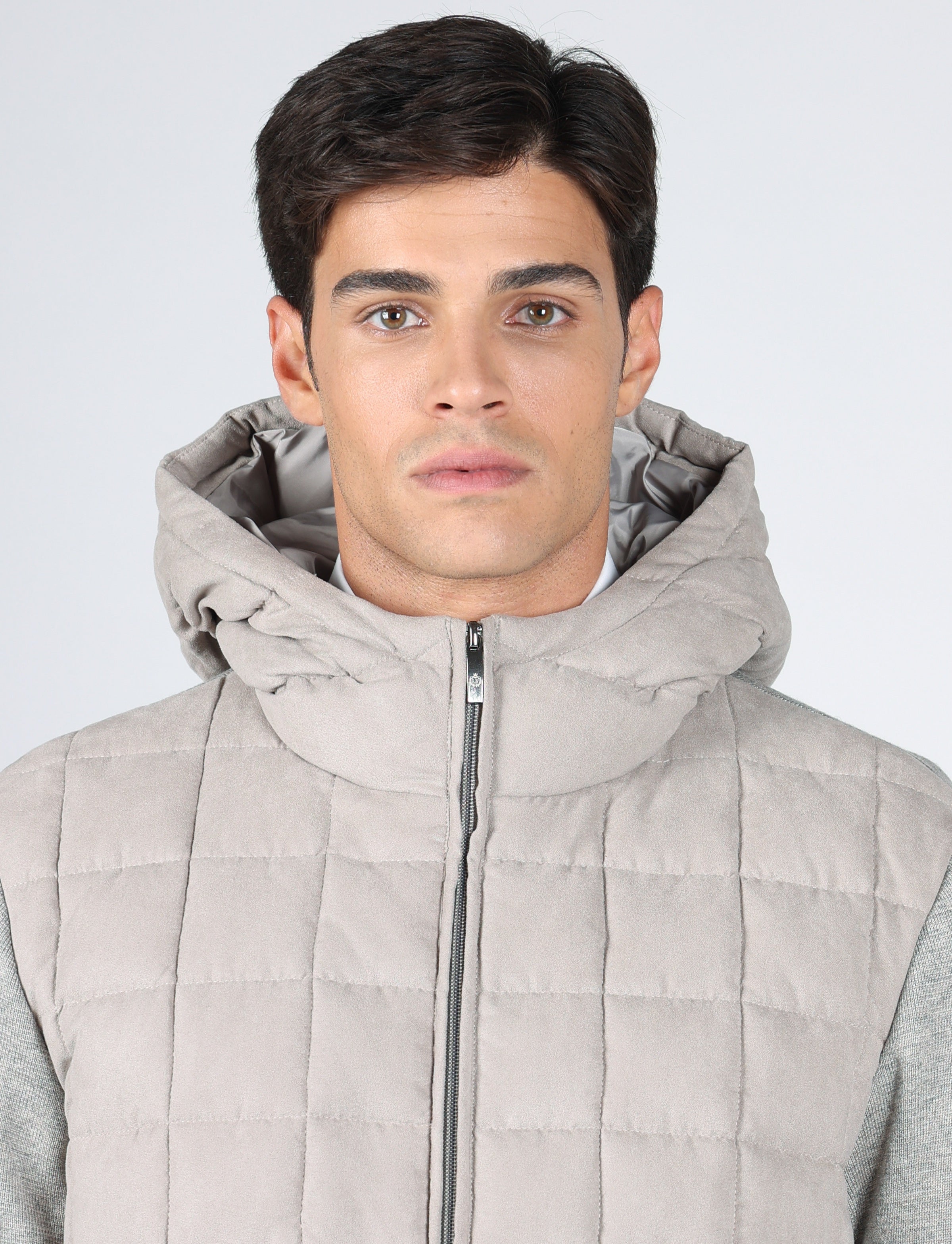 Maglia giubbino con frontale in alcantara trapuntata e retro in tessuto, pensata per unire eleganza e praticità. Perfetta per la mezza stagione, offre uno stile moderno e versatile.