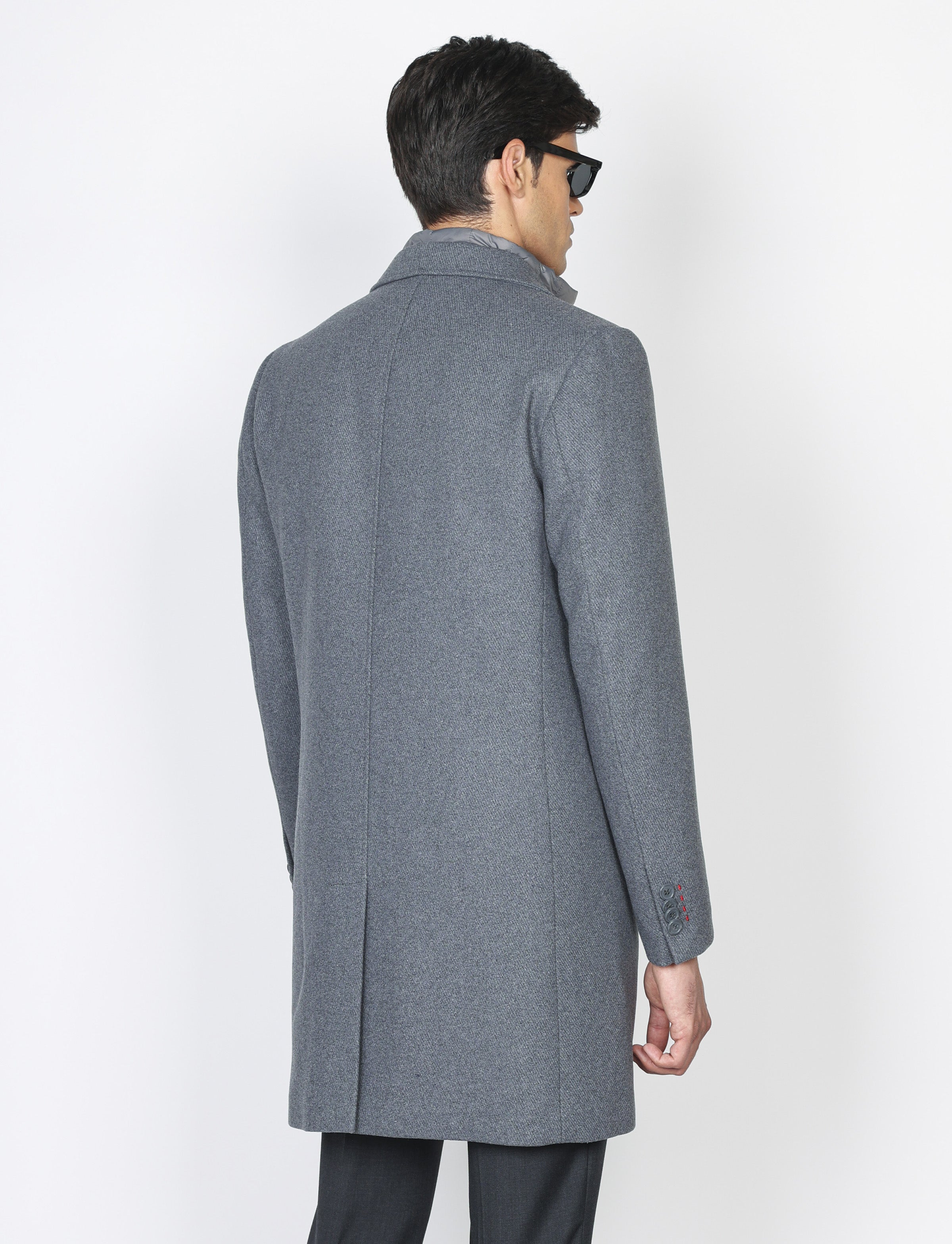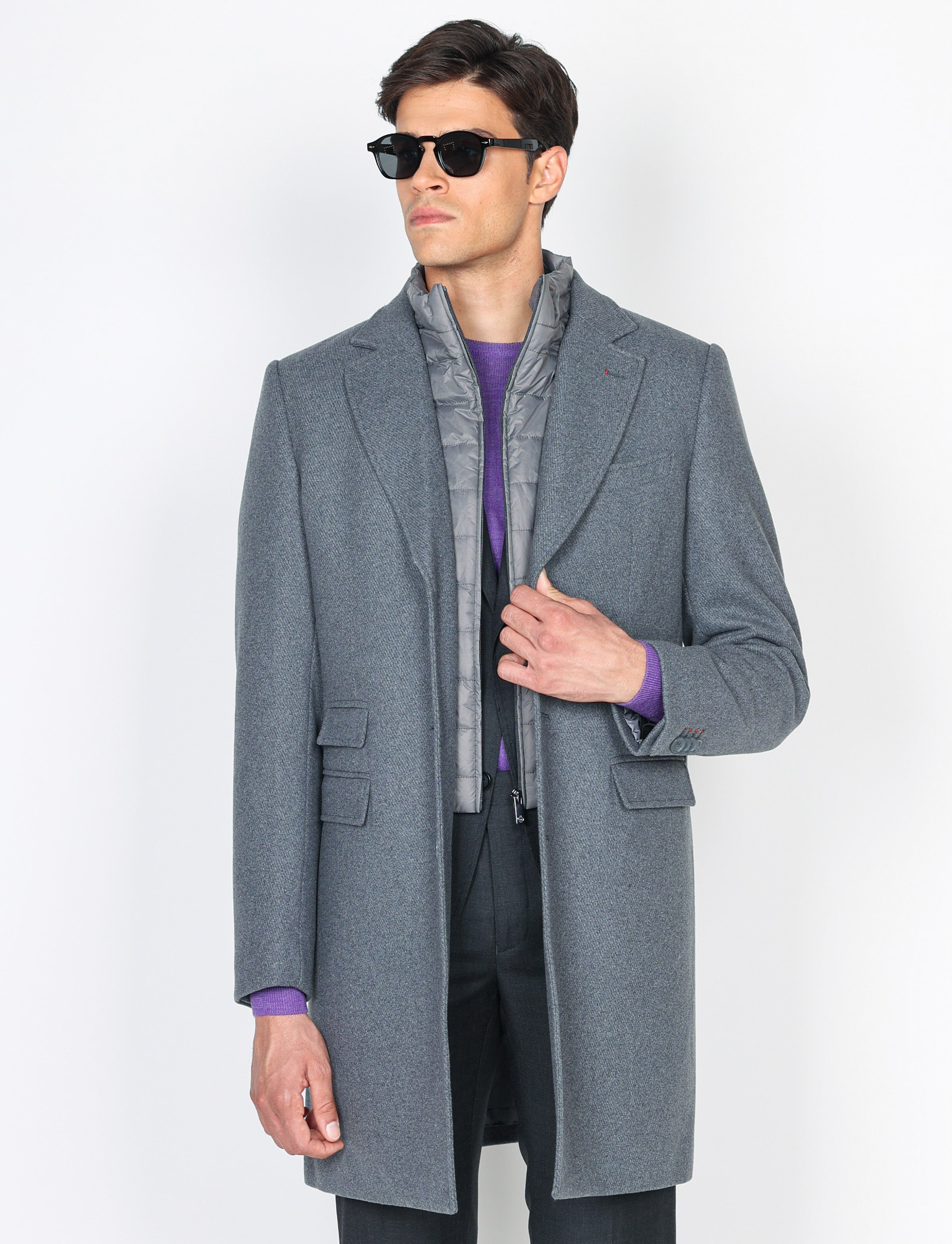 Cappotto in lana con lavorazione diagonale, arricchito da una pettorina removibile che aggiunge stile e praticità. Elegante e moderno, è il capo ideale per affrontare la stagione con classe e comfort.