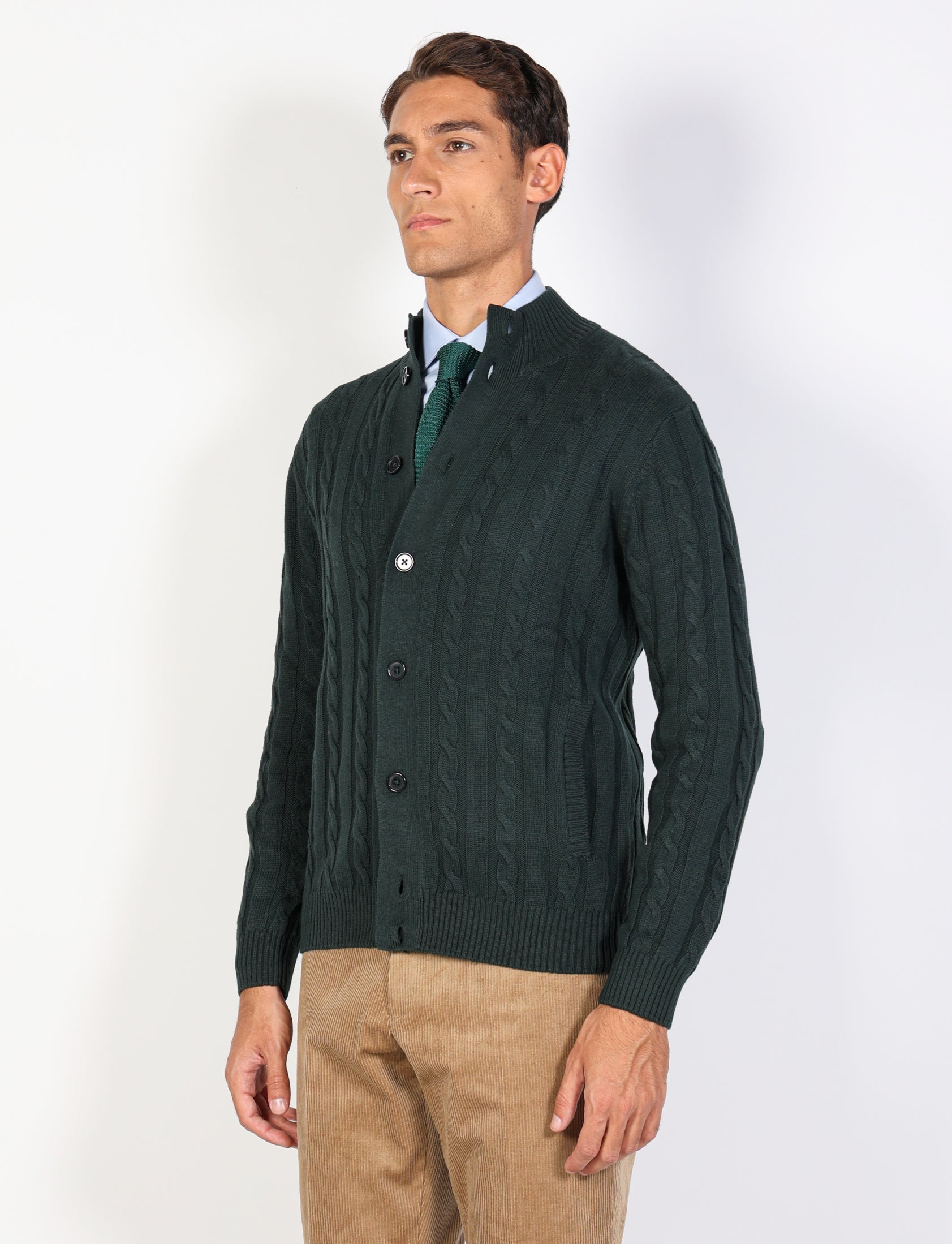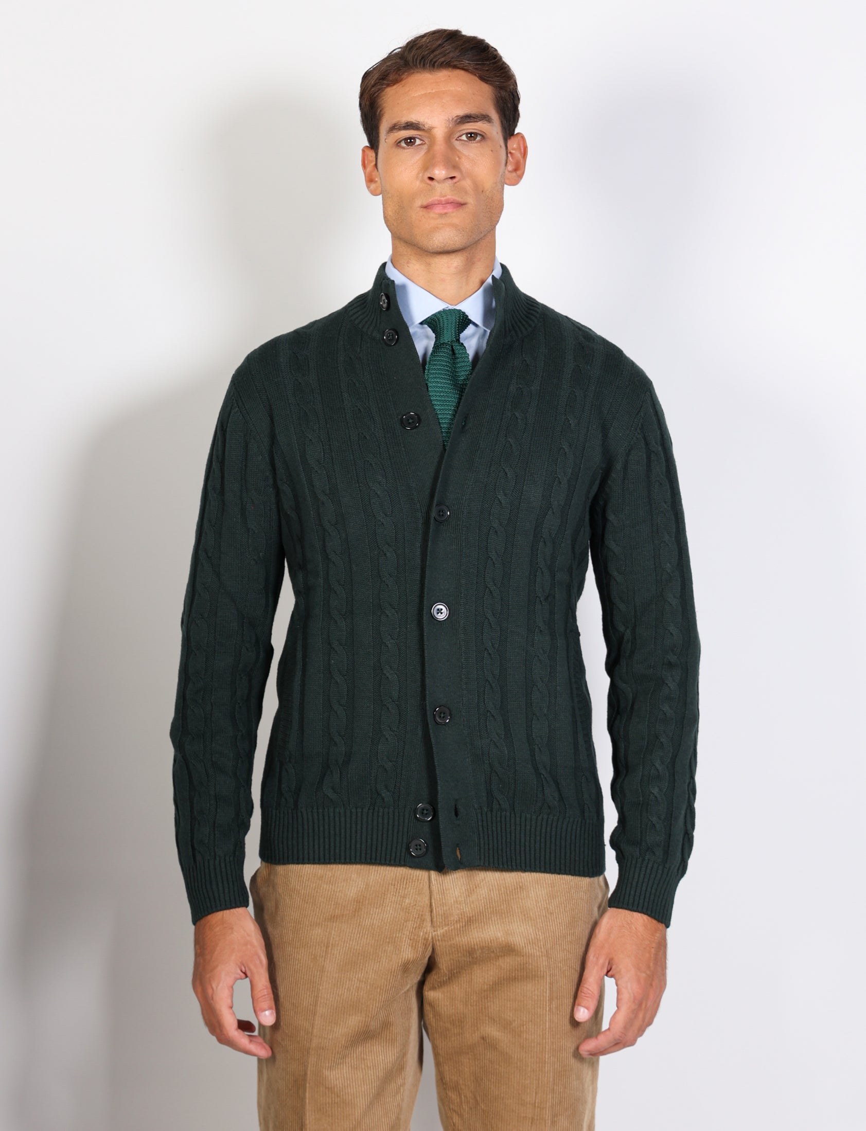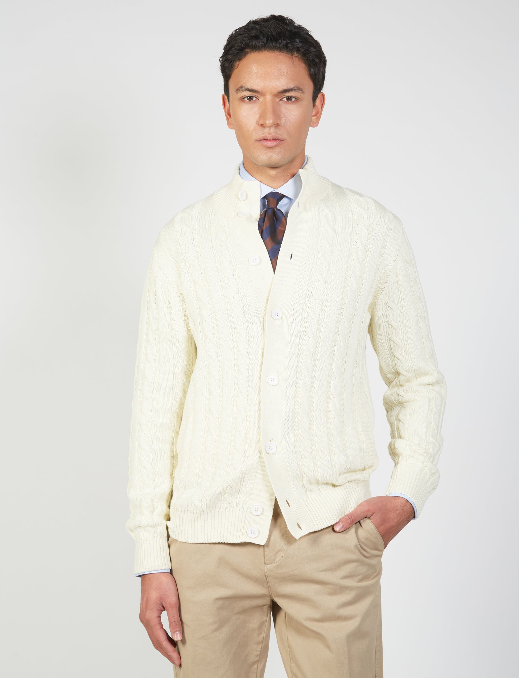 Scopri il cardigan a trecce in cotone e lana, un capo versatile ed elegante con collo alto e chiusura a otto bottoni. Perfetto per look casual e raffinati, garantisce comfort e calore grazie alla lavorazione in filati di qualità.