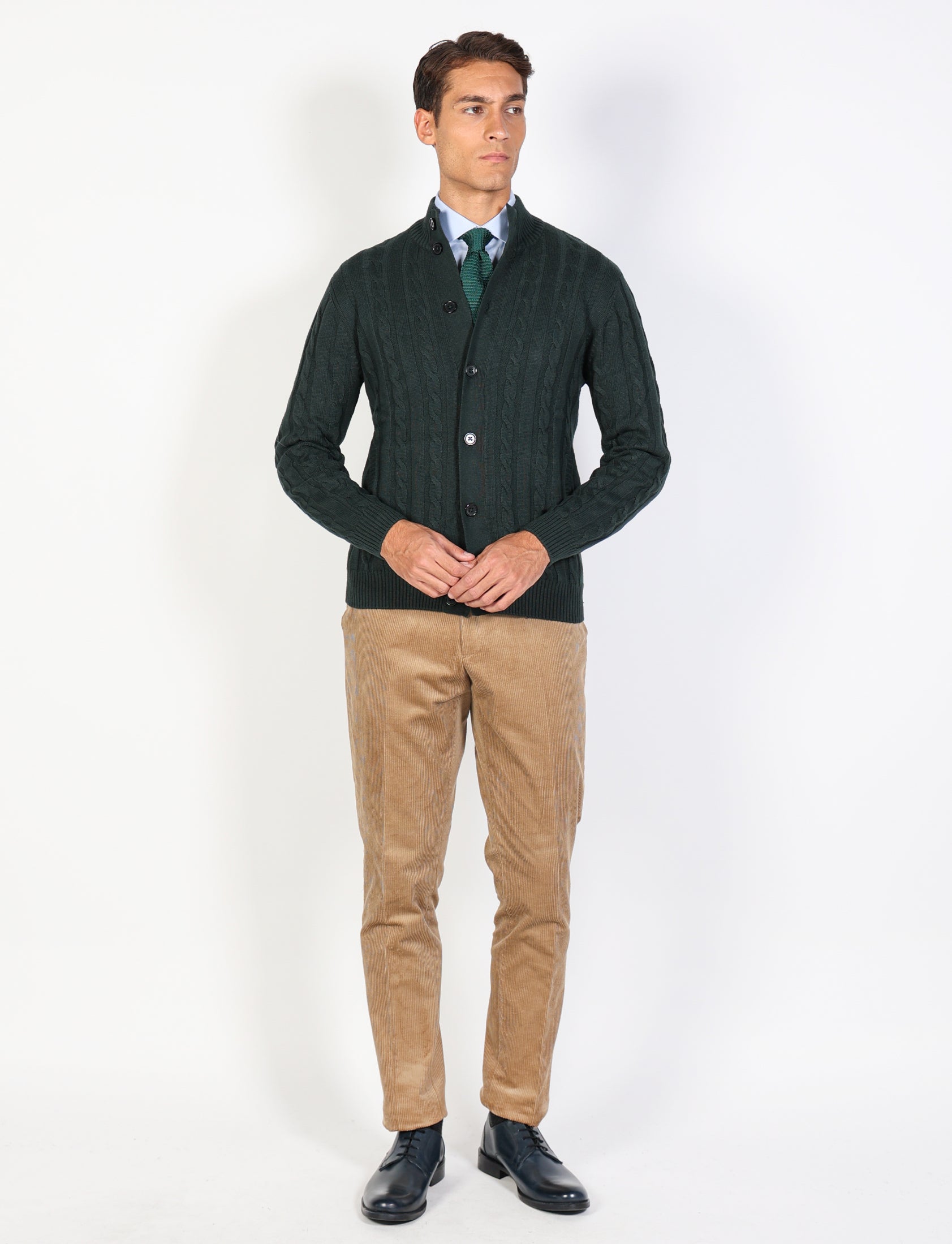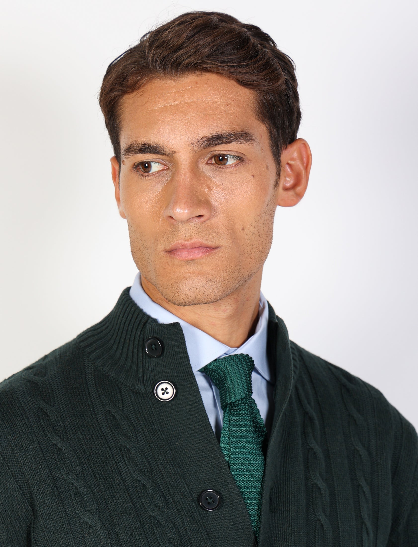Lavorazione a trecce: Un dettaglio intramontabile, simbolo di eleganza artigianale, che dona texture e profondità al cardigan.