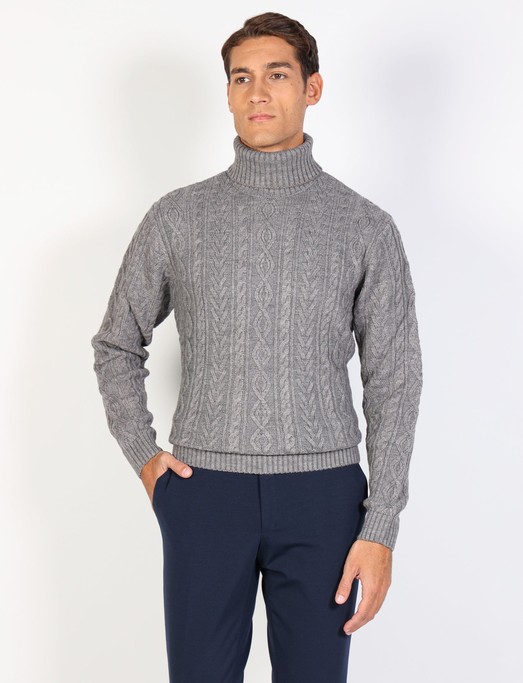 Aggiungi un tocco di stile al tuo guardaroba con il dolcevita in lana a rombi e trecce. Caldo, confortevole e perfetto per un look elegante o casual, è ideale per affrontare con classe le giornate più fredde.