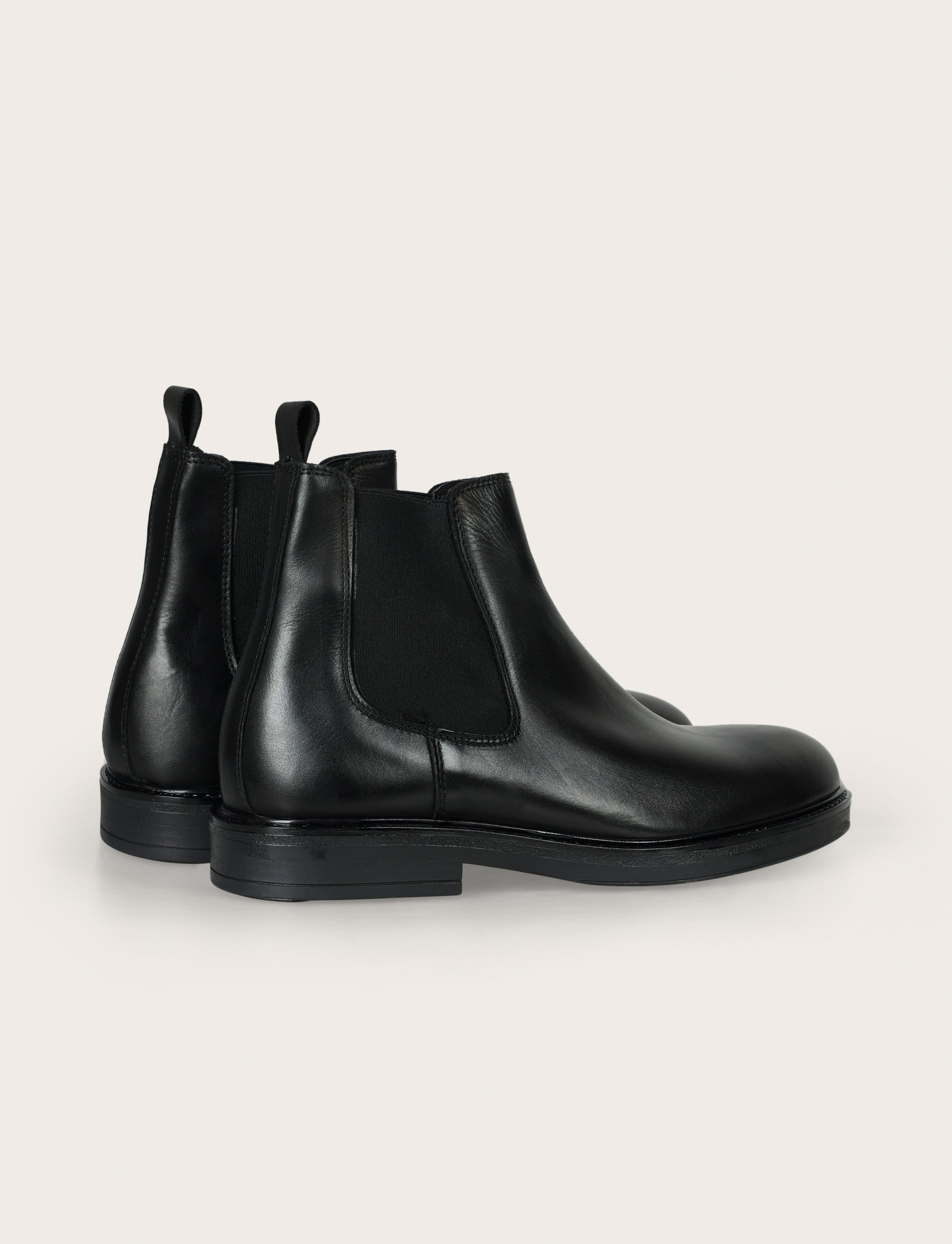 Stivaletto Chelsea in pelle nera con fondo in gomma, un classico intramontabile dello stile maschile. Versatile e confortevole, è perfetto per completare look eleganti o casual con un tocco raffinato.