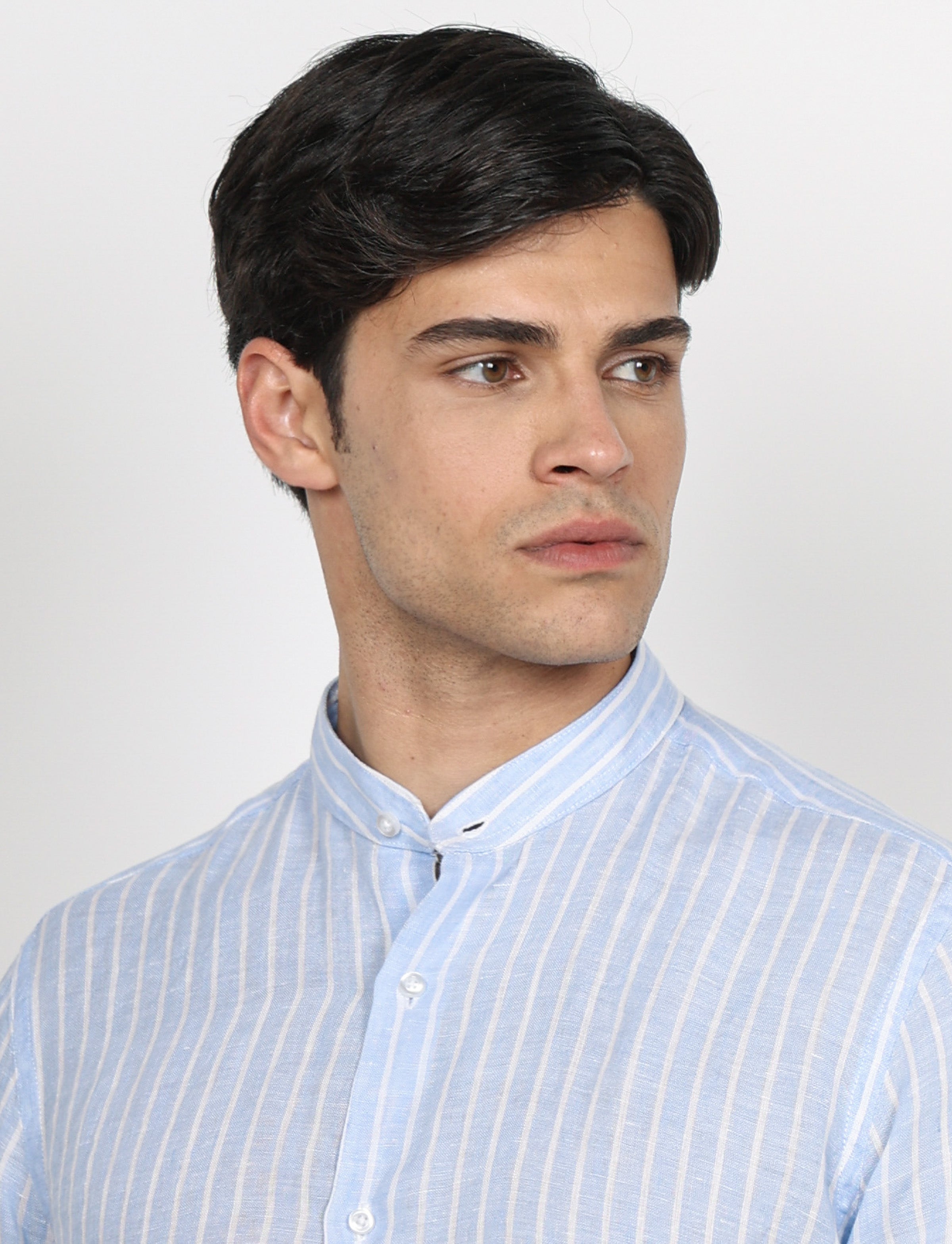 The linen shirt with wide stripes and mandarin collar is a versatile piece of clothing and perfect for warm seasons. You can wear it with linen trousers or jeans for a casual and relaxed look, perfect for a walk in the city or an outdoor lunch.