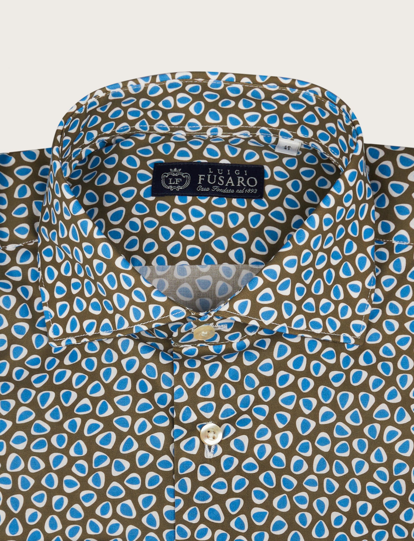 Una camicia dal carattere forte e distintivo, arricchita da una fantasia geometrica macro a motivi ovali. Realizzata in cotone stretch, è ideale per chi vuole distinguersi con un look moderno e raffinato.