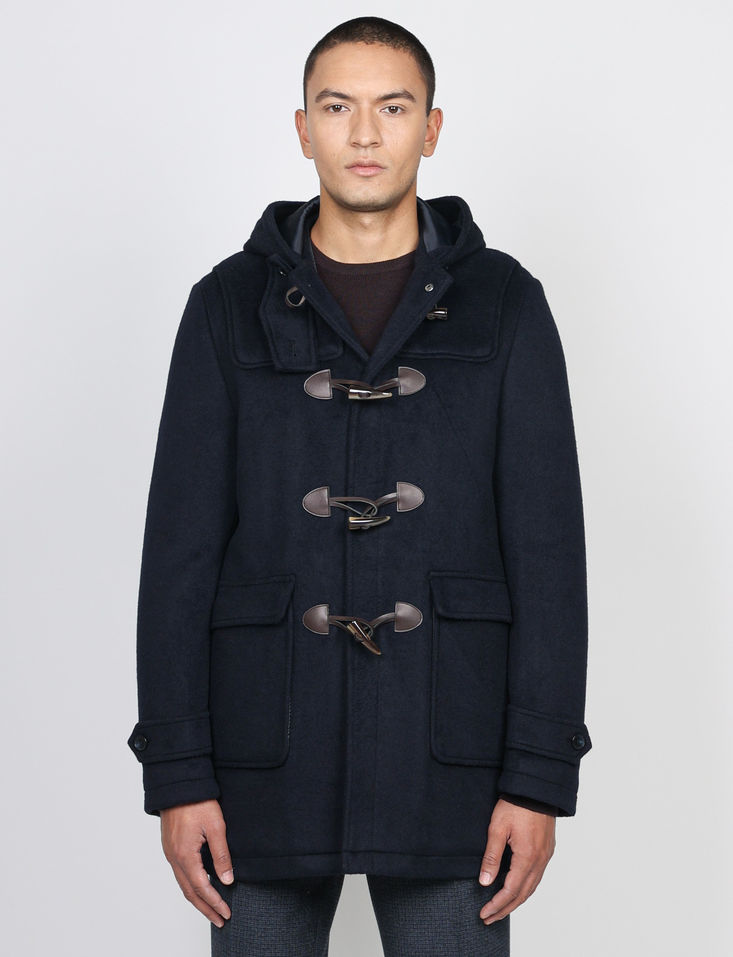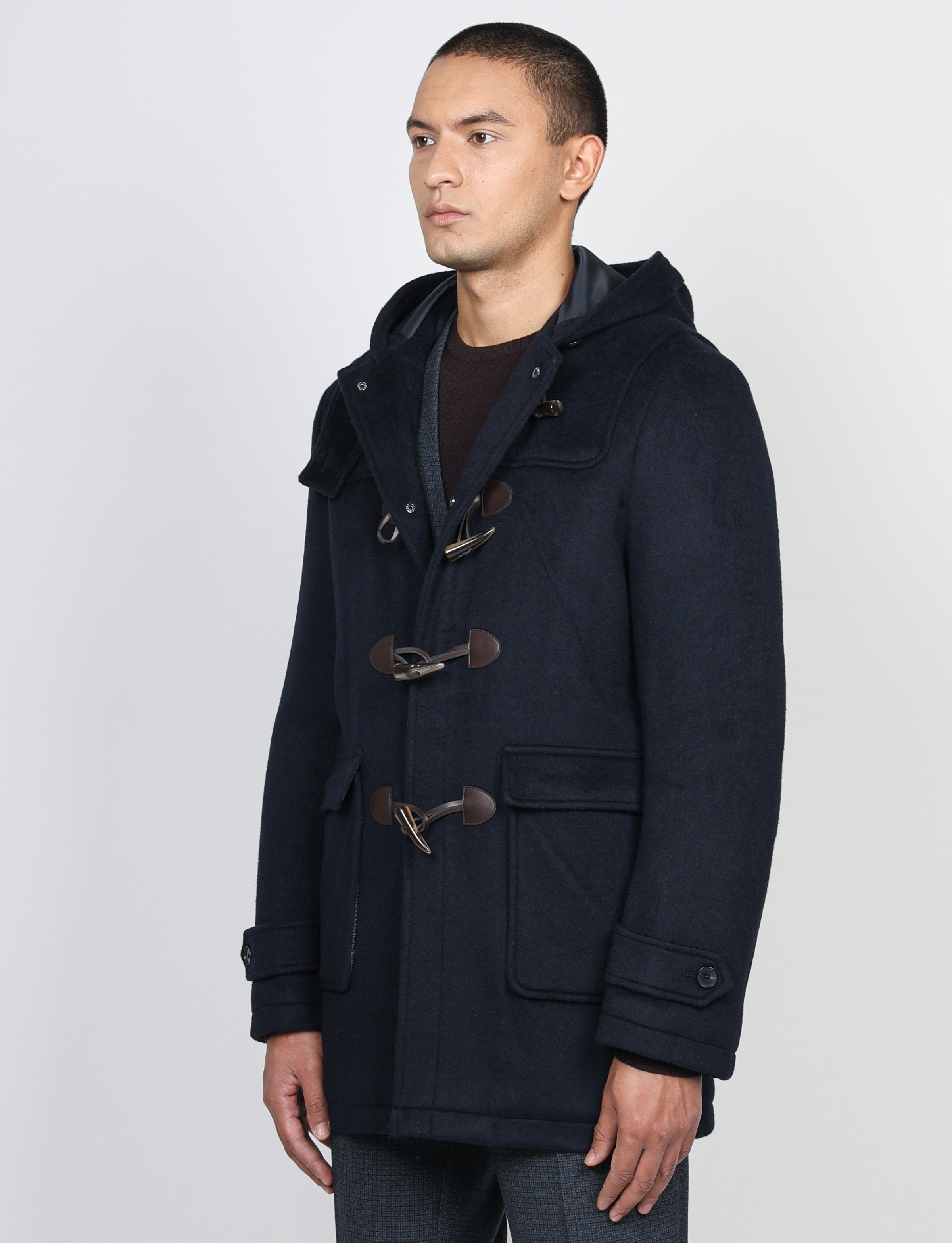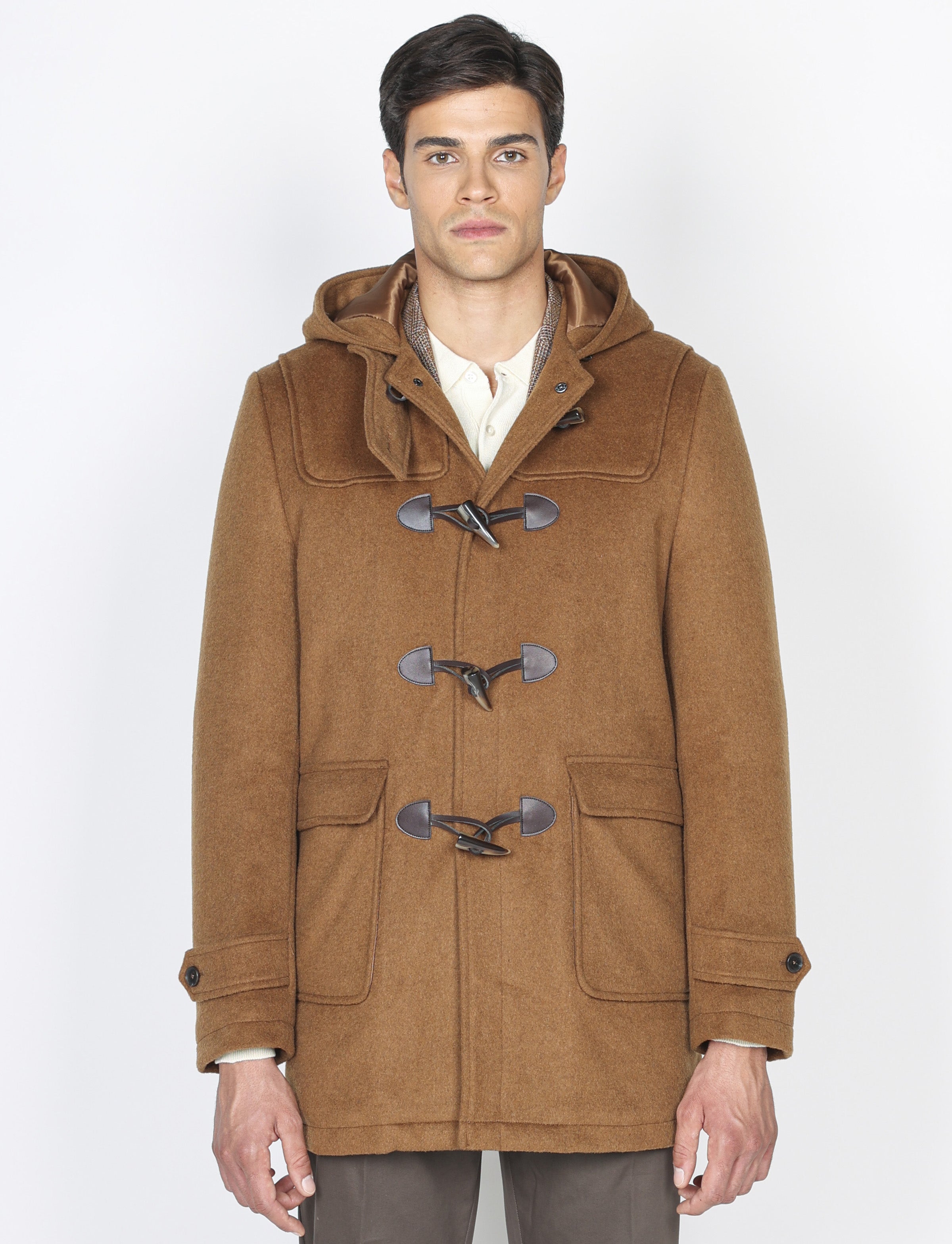 Realizzato in tessuto misto lana caldo e strutturato, presenta la classica chiusura con alamari in corno e inserti in pelle, dettagli che ne esaltano lo stile autentico. Il cappuccio fisso e l’interno trapuntato e foderato lo rendono ideale per affrontare la stagione fredda con eleganza.