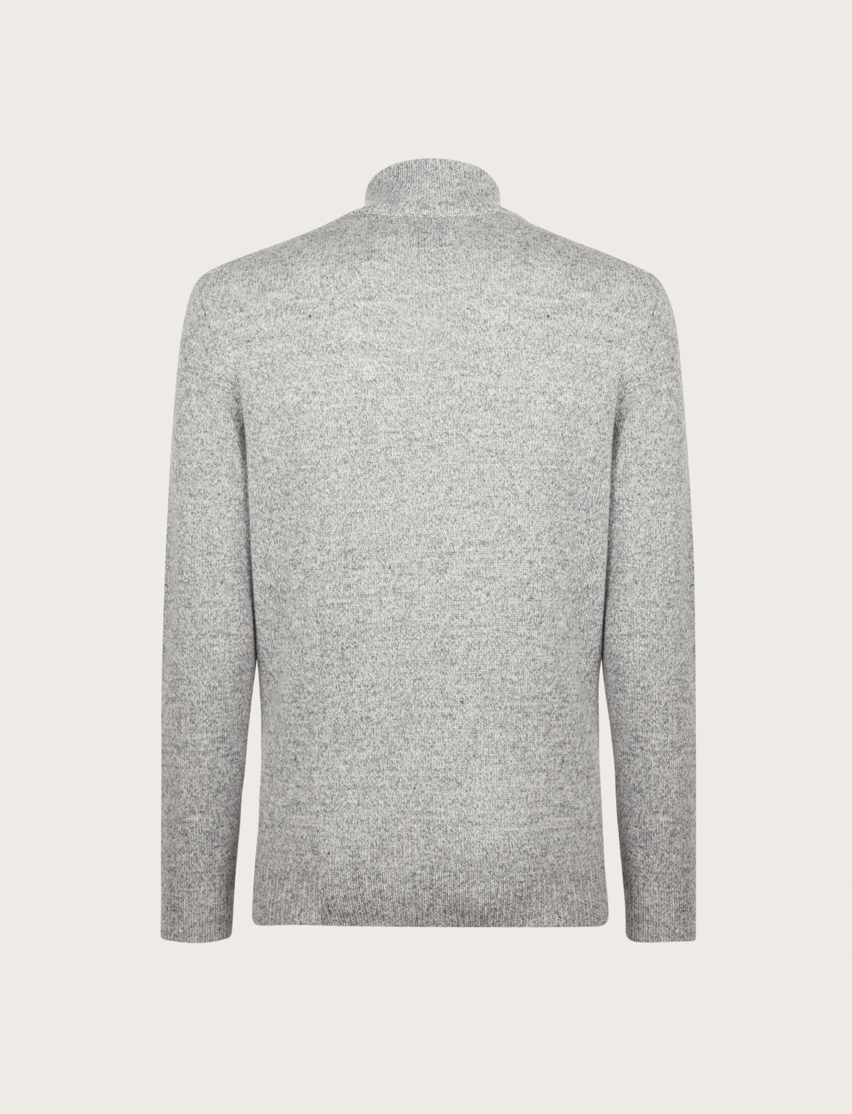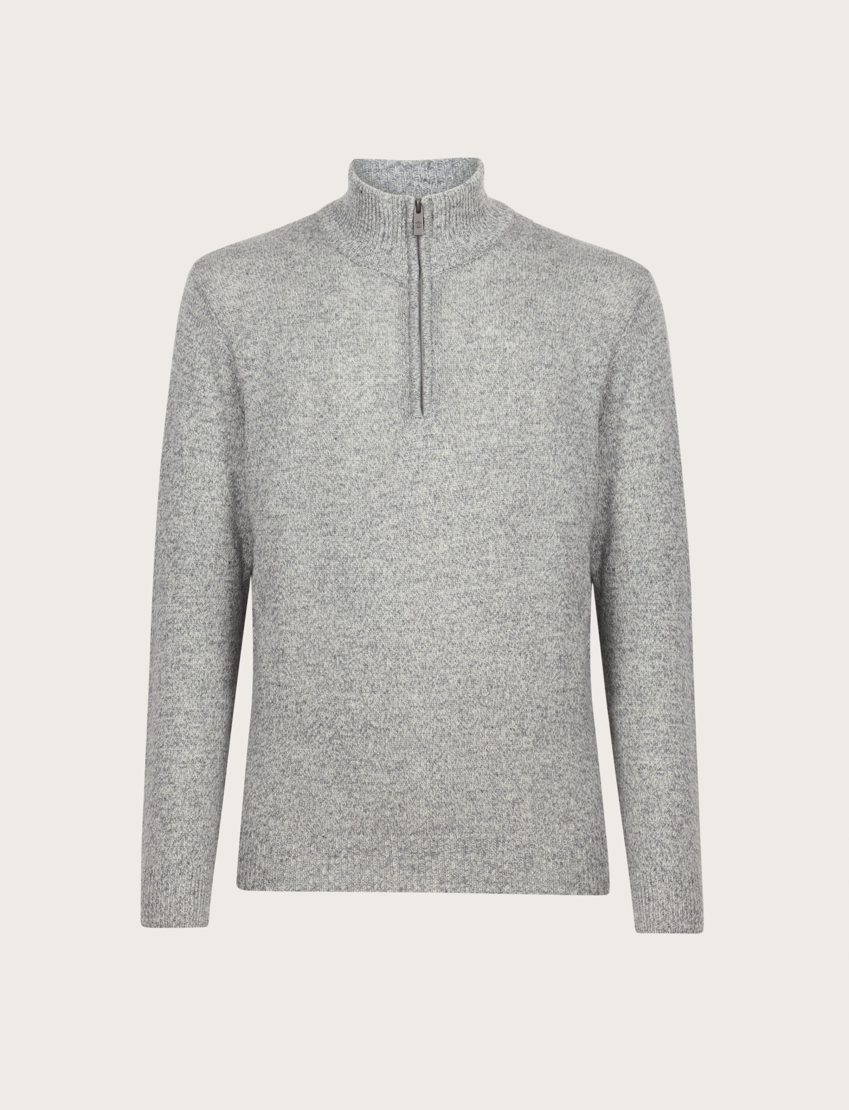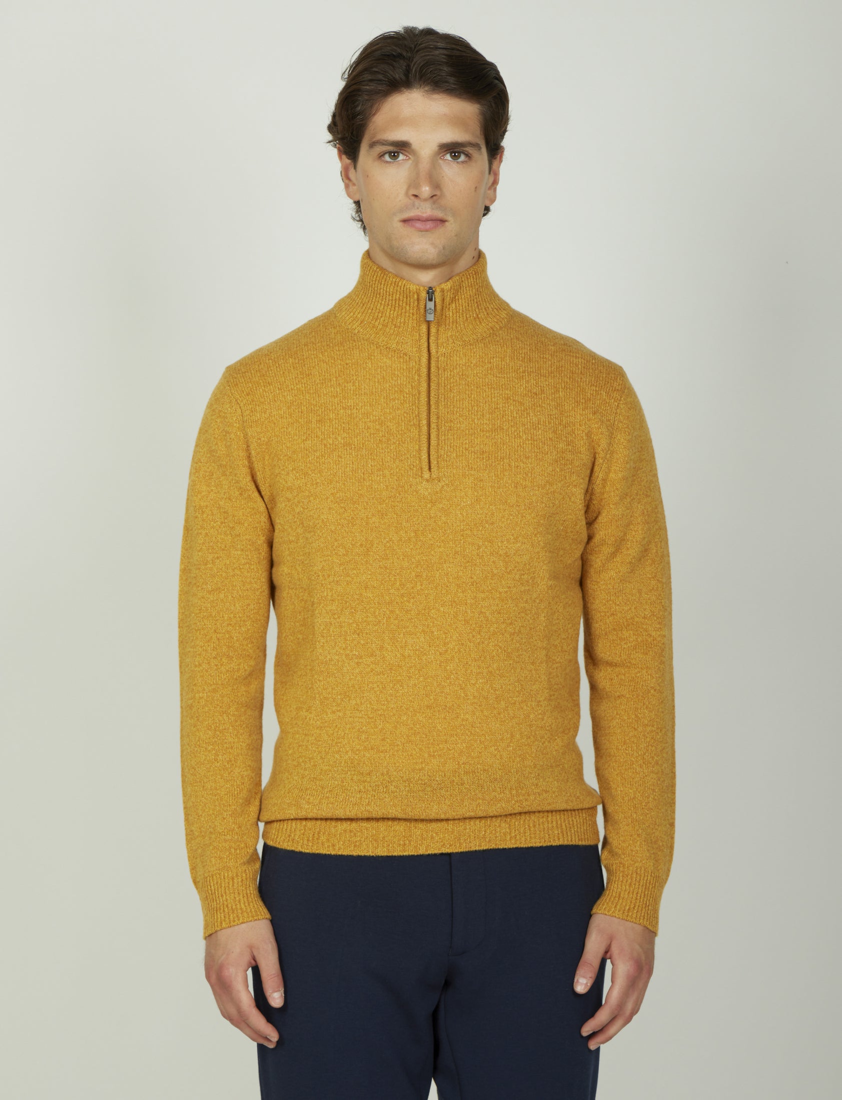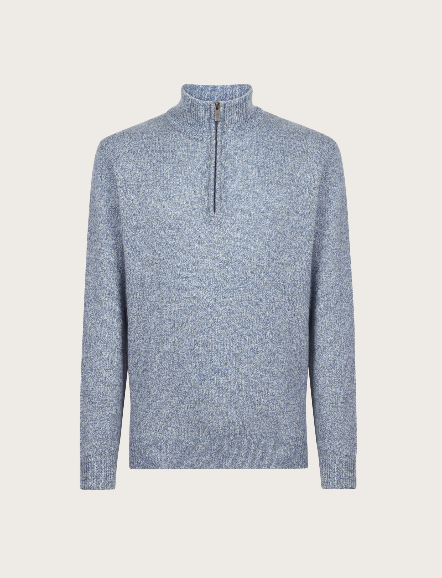 Maglia uomo a mezza zip dal design essenziale ed elegante, realizzata in lambswool mouliné, un filato pregiato che unisce più tonalità di colore per un effetto leggermente mosso e sofisticato.