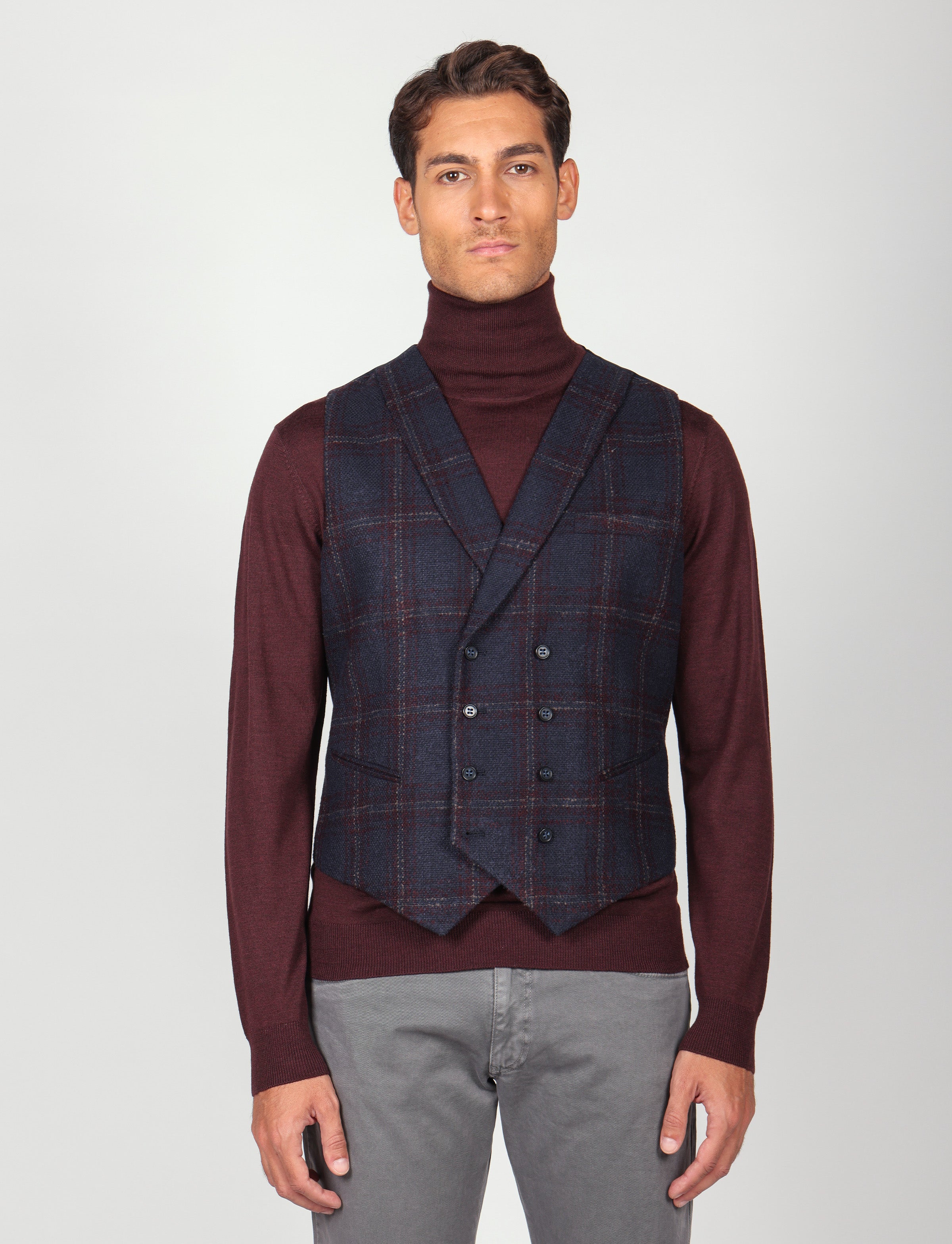 Gilet doppiopetto in tessuto principe di Galles bicolore, un capo dal carattere sartoriale e raffinato. Realizzato in tessuto misto lana con linea Drop 6 e cinturino regolabile sul retro, è perfetto per completare look formali o per uno stile spezzato dal fascino contemporaneo.