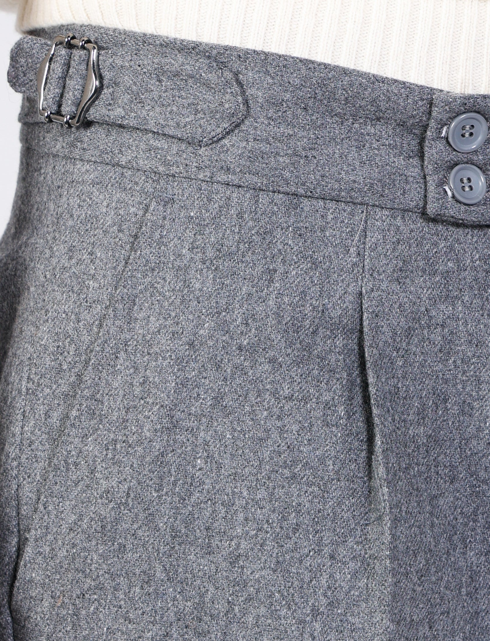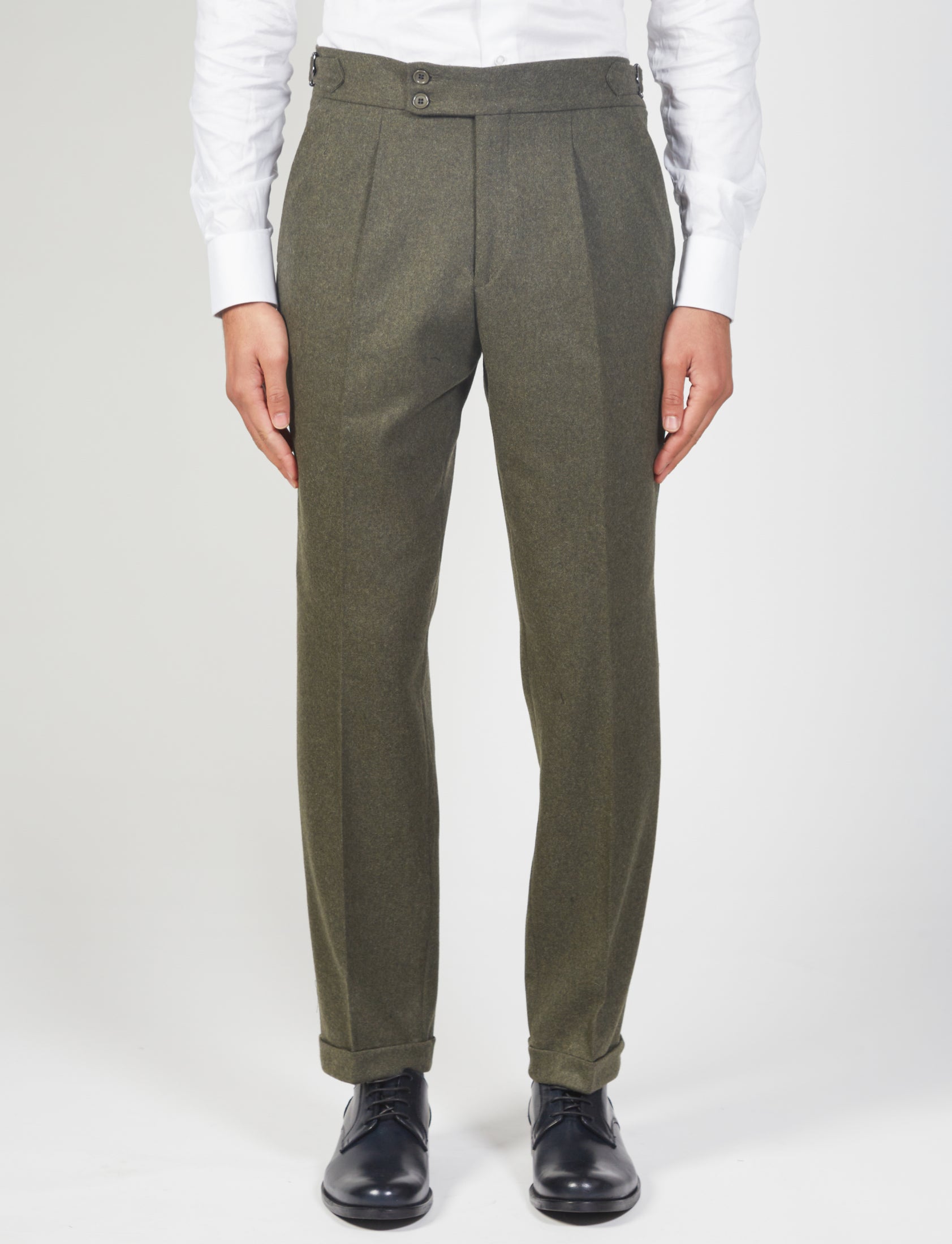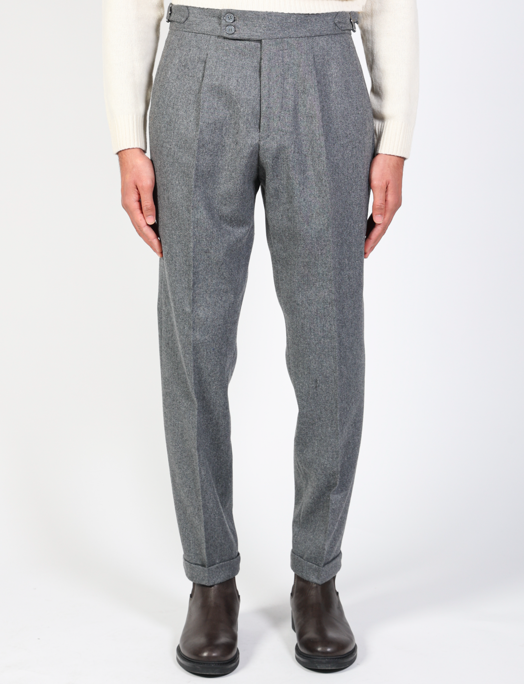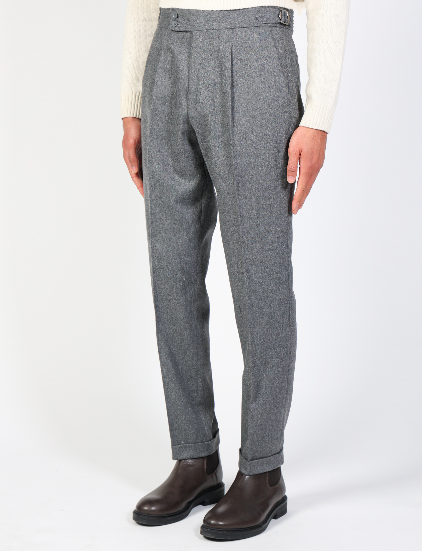 Scopri il pantalone con pence in flanella di lana, un capo versatile e sofisticato, ideale per look formali e casual chic. Realizzato con un tessuto caldo e morbido, è perfetto per la stagione fredda. Abbinalo a una giacca strutturata per un outfit elegante o a un maglione a collo alto per un look rilassato e di classe.
